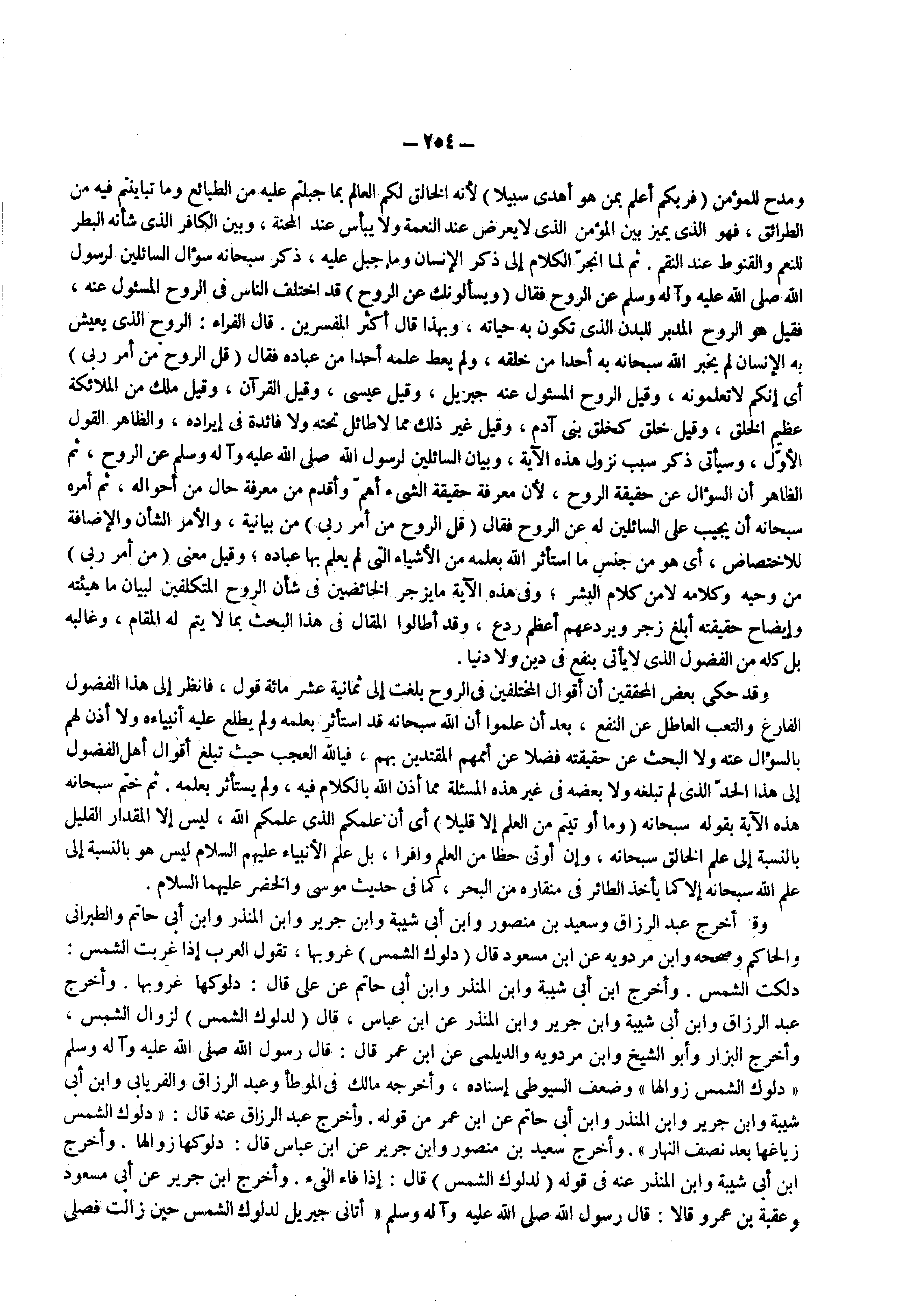 وقد حكى بعض المحققين أن أقوال المختلفين فى الروح بلغت إلى ثمانية عشر مائة قول فانظر إلى هذا الفضول الفارغ والتعب العاطل عن النفع بعد أن علموا أن الله سبحانه قد استأثر بعلمه ولم يطلع عليه أنبياءه ولا أذن لهم بالسؤال عنه ولا البحث عن حقيقته فضلا عن أممهم المقتدين بهم فيا لله العجب حيث تبلغ أقوال أهل الفضول إلى هذا الحد الذى لم تبلغه ولا بعضه فى غير هذه المسئلة مما أذن الله بالكلام فيه ولم يستأثر بعلمه ثم ختم سبحانه هذه الآية بقوله سبحانه ) وما أوتيتم من العلم إلا قليلا ( أى أن علمكم الذى علمكم الله ليس إلا المقدار القليل بالنسبة إلى علم الخالق سبحانه وإن أوتي حظا من العلم وافرا بل علم الأنبياء عليهم السلام ليس هو بالنسبة إلى علم الله سبحانه إلا كما يأخذ الطائر فى منقاره من البحر كما فى حديث موسى والخضر عليهما السلام
