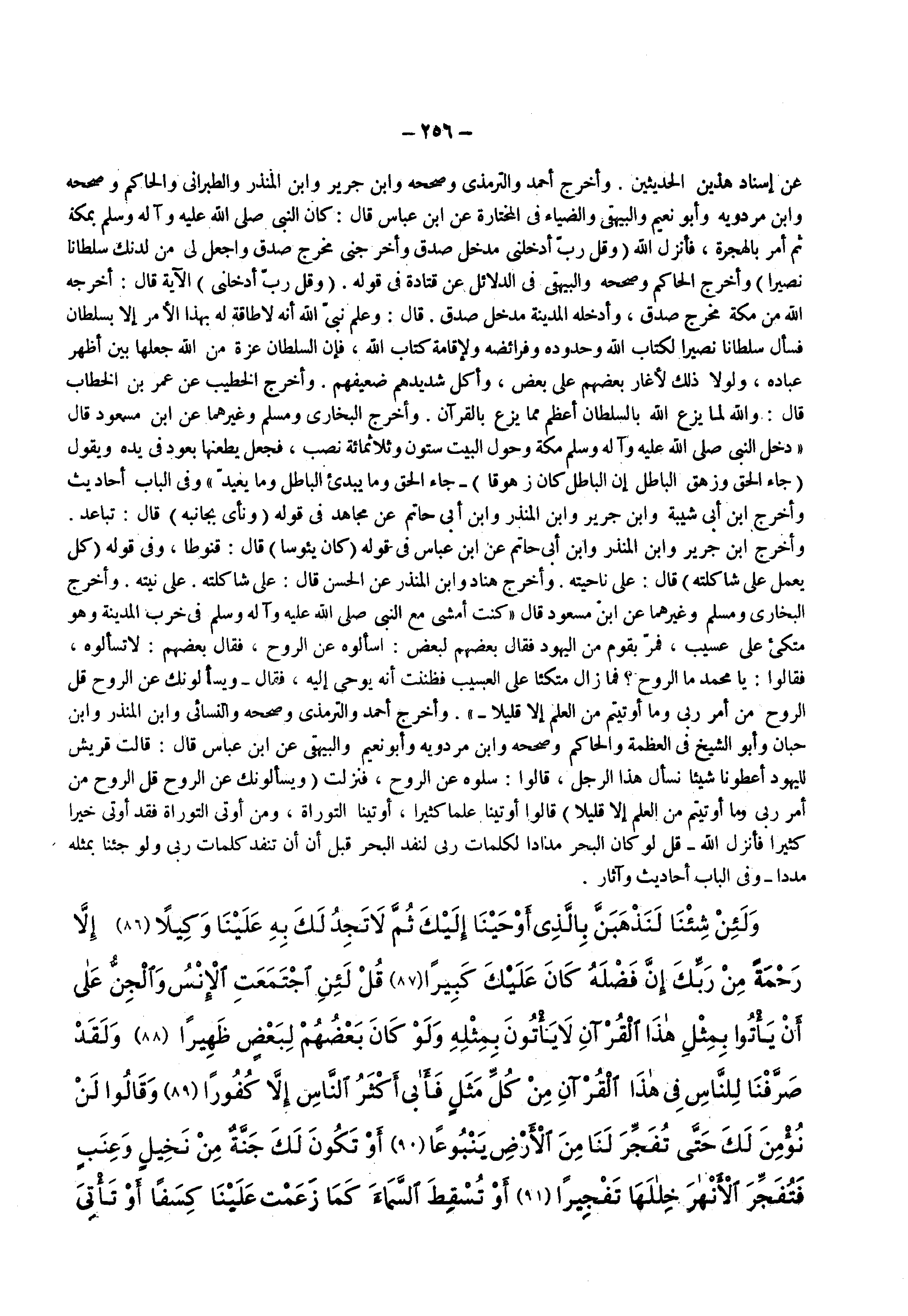 عن إسناد هذين الحديثين وأخرج أحمد والترمذي وصححه وابن جرير وابن المنذر والطبراني والحاكم وصححه وابن مردويه وأبو نعيم والبيهقي والضياء فى المختارة عن ابن عباس قال كان النبي ( صلى الله عليه وسلم ) بمكة ثم أمر بالهجرة فأنزل الله ) وقل رب أدخلني مدخل صدق وأخرجني مخرج صدق واجعل لي من لدنك سلطانا نصيرا ( وأخرج الحاكم وصححه والبيهقي فى الدلائل عن قتادة فى قوله ) وقل رب أدخلني ( الآية قال أخرجه الله من مكة مخرج صدق وأدخله المدينة مدخل صدق قال وعلم نبي الله أنه لا طاقة له بهذا الأمر إلا بسلطان فسأل سلطانا نصيرا لكتاب الله وحدوده وفرائضه ولإقامة كتاب الله فإن السلطان عزة من الله جعلها بين أظهر عباده ولولا ذلك لأغار بعضهم على بعض وأكل شديدهم ضعيفهم وأخرج الخطيب عن عمر بن الخطاب قال والله لما يزع الله بالسلطان أعظم مما يزع بالقرآن وأخرج البخاري ومسلم وغيرهما عن ابن مسعود قال دخل النبي ( صلى الله عليه وسلم ) مكة وحول البيت ستون وثلاثمائة نصب فجعل يطعنها بعود فى يده ويقول ) جاء الحق وزهق الباطل إن الباطل كان زهوقا ( جاء الحق وما يبدئ الباطل وما يعيد وفى الباب أحاديث وأخرج ابن أبي شيبة وابن جرير وابن المنذر وابن أبي حاتم عن مجاهد فى قوله ) ونأى بجانبه ( قال تباعد وأخرج ابن جرير وابن المنذر وابن أبي حاتم عن ابن عباس فى قوله ) كان يؤوسا ( قال قنوطا وفى قوله ) كل يعمل على شاكلته ( قال على ناحيته وأخرج هناد وابن المنذر عن الحسن قال على شاكلته على نيته وأخرج البخاري ومسلم وغيرهما عن ابن مسعود قال كنت أمشي مع النبي ( صلى الله عليه وسلم ) فى خرب المدينة وهو متكئ على عسيب فمر بقوم من اليهود فقال بعضهم لبعض اسألوه عن الروح فقال بعضهم لا تسألوه فقالوا يا محمد ما الروح فما زال متكئا على العسيب فظننت أنه يوحى إليه فقال ) ويسألونك عن الروح قل الروح من أمر ربي وما أوتيتم من العلم إلا قليلا ( وأخرج أحمد والترمذي وصححه والنسائي وابن المنذر وابن حبان وأبو الشيخ فى العظمة والحاكم وصححه وابن مردويه وأبو نعيم والبيهقي عن ابن عباس قال قالت قريش لليهود أعطونا شيئا نسأل هذا الرجل قالوا سلوه عن الروح فنزلت ) ويسألونك عن الروح قل الروح من أمر ربي وما أوتيتم من العلم إلا قليلا ( قالوا أوتينا علما كثيرا أوتينا التوراة ومن أوتى التوراة فقد أوتى خيرا كثيرا فأنزل الله ) قل لو كان البحر مدادا لكلمات ربي لنفد البحر قبل أن تنفد كلمات ربي ولو جئنا بمثله مددا ( وفى الباب أحاديث وآثار
