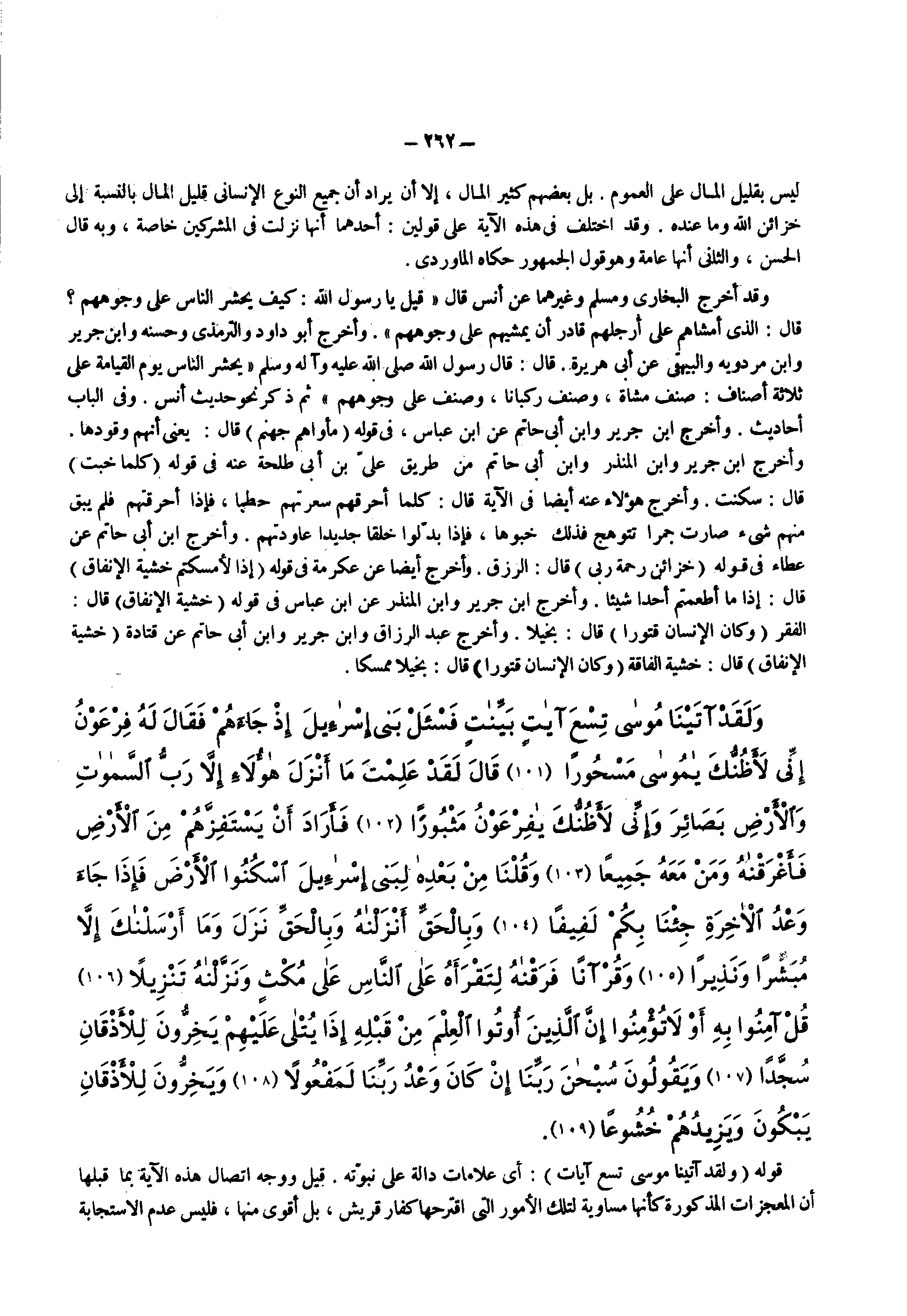 وقد أخرج البخاري ومسلم وغيرهما عن أنس قال قيل يا رسول الله كيف يحشر الناس على وجوههم قال الذى أمشاهم على أرجلهم قادر أن يمشيهم على وجوههم وأخرج أبو داود والترمذي وحسنه وابن جرير وابن مردويه والبيهقي عن أبي هريرة قال قال رسول الله ( صلى الله عليه وسلم ) يحشر الناس يوم القيامة على ثلاثة أصناف صنف مشاة وصنف ركبانا وصنف على وجوههم ثم ذكر نحو حديث أنس وفى الباب أحاديث وأخرج ابن جرير وابن أبي حاتم عن ابن عباس فى قوله ) مأواهم جهنم ( قال يعني أنهم وقودها وأخرج ابن جرير وابن المنذر وابن أبي حاتم من طريق علي بن أبي طلحة عنه فى قوله ) كلما خبت ( قال سكنت وأخرج هؤلاء عنه أيضا فى الآية قال كلما أحرقهم سعرتهم حطبا فإذا أحرقتهم فلم يبق منهم شيء صارت جمرا تتوهج فذلك خبوها فإذا بدلوا خلقا جديدا عاودتهم وأخرج ابن أبي حاتم عن عطاء فى قوله ) خزائن رحمة ربي ( قال الرزق وأخرج أيضا عن عكرمة فى قوله ) إذا لأمسكتم خشية الإنفاق ( قال إذا ما أطعمتم أحدا شيئا وأخرج ابن جرير وابن المنذر عن ابن عباس فى قوله ) خشية الإنفاق ( قال الفقر ) وكان الإنسان قتورا ( قال بخيلا وأخرج عبد الرزاق وابن جرير وابن أبي حاتم عن قتادة ) خشية الإنفاق ( قال خشية الفاقة ) وكان الإنسان قتورا ( قال بخيلا ممسكا