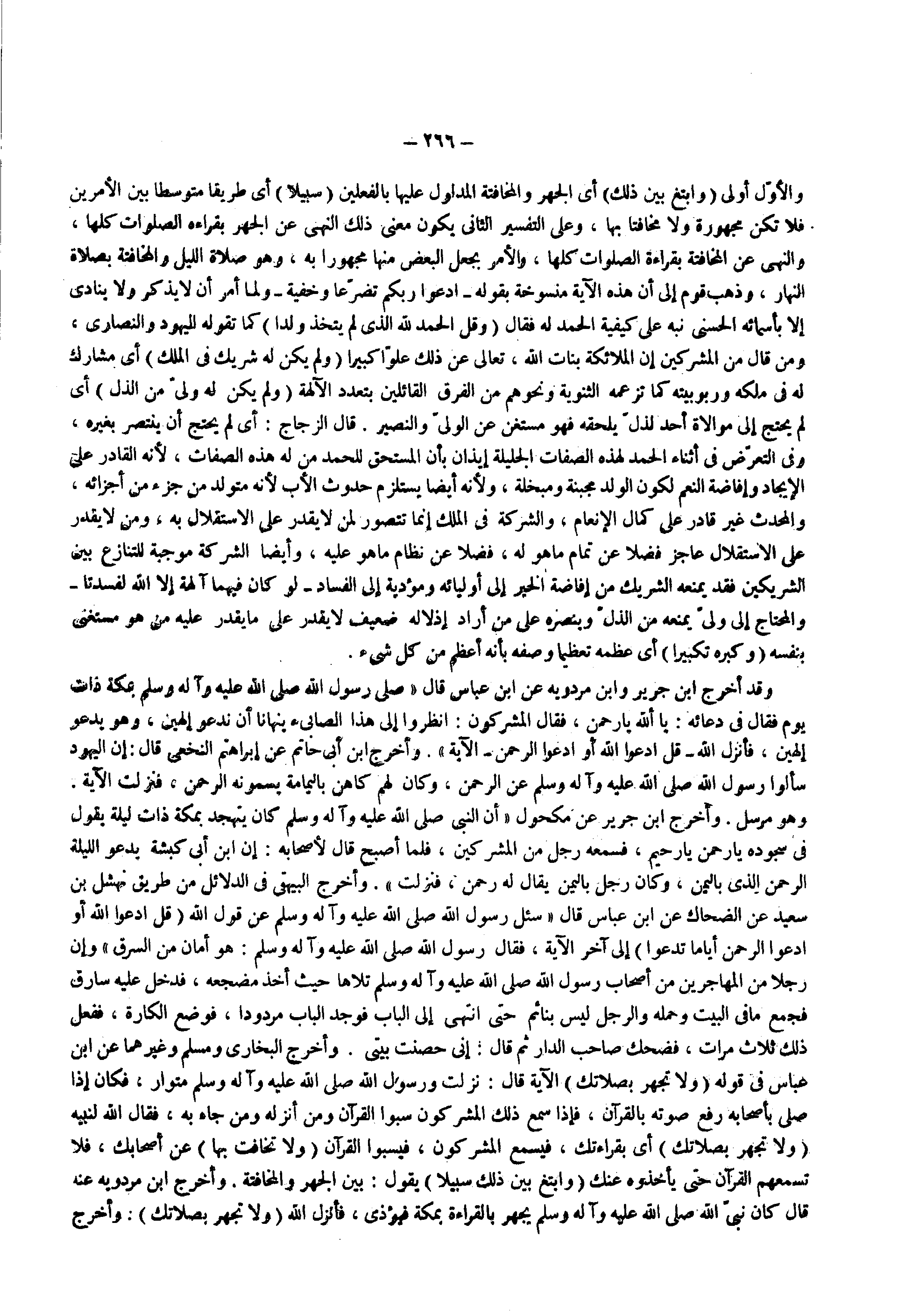 وقد أخرج ابن جرير وابن مردويه عن ابن عباس قال ( صلى الله عليه وسلم ) بمكة ذات يوم فقال فى دعائه يا ألله يا رحمن فقال المشركون انظروا إلى هذا الصابئ ينهانا ان ندعوا إلهين وهو يدعو إلهين فأنزل الله ) قل ادعوا الله أو ادعوا الرحمن ( الآية وأخرج ابن أبي حاتم عن إبراهيم النخعي قال إن اليهود سألوا رسول الله ( صلى الله عليه وسلم ) عن الرحمن وكان لهم كاهن باليمامة يسمونه الرحمن فنزلت الآية وهو مرسل وأخرج ابن جرير عن مكحول أن النبي ( صلى الله عليه وسلم ) كان يتهجد بمكة ذات ليلة يقول فى سجوده يا رحمن يا رحيم فسمعه رجل من المشركين فلما أصبح قال لأصحابه إن ابن أبي كبشة يدعو الليلة الرحمن الذى باليمن وكان رجل باليمن يقال له الرحمن فنزلت وأخرج البيهقي فى الدلائل من طريق نهشل بن سعيد عن الضحاك عن ابن عباس قال سئل رسول الله ( صلى الله عليه وسلم ) عن قول الله ) قل ادعوا الله أو ادعوا الرحمن أيا ما تدعوا ( إلى آخر الآية فقال رسول الله ( صلى الله عليه وسلم ) هو أمان من السرق وإن رجلا من المهاجرين من أصحاب رسول الله ( صلى الله عليه وسلم ) تلاها حيث أخذ مضجعه فدخل عليه سارق فجمع ما فى البيت وحمله والرجل ليس بنائم حتى انتهى إلى الباب فوجد الباب مردودا فوضع الكارة ففعل ذلك ثلاث مرات فضحك صاحب الدار ثم قال إني حصنت بيتي وأخرج البخاري ومسلم وغيرهما عن ابن عباس فى قوله ) ولا تجهر بصلاتك ( الآية قال نزلت ورسول الله ( صلى الله عليه وسلم ) متوار فكان إذا صلى بأصحابه رفع صوته بالقرآن فإذا سمع ذلك المشركون سبوا القرآن ومن أنزله ومن جاء به فقال الله لنبيه ) ولا تجهر بصلاتك ( أى بقراءتك فيسمع المشركون فيسبوا القرآن ) ولا تخافت بها ( عن أصحابك فلا تسمعهم القرآن حتى يأخذوه عنك ) وابتغ بين ذلك سبيلا ( يقول بين الجهر والمخافتة وأخرج ابن مردويه عنه قال كان نبي الله ( صلى الله عليه وسلم ) يجهر بالقراءة بمكة فيؤذى فأنزل الله ) ولا تجهر بصلاتك ( وأخرج