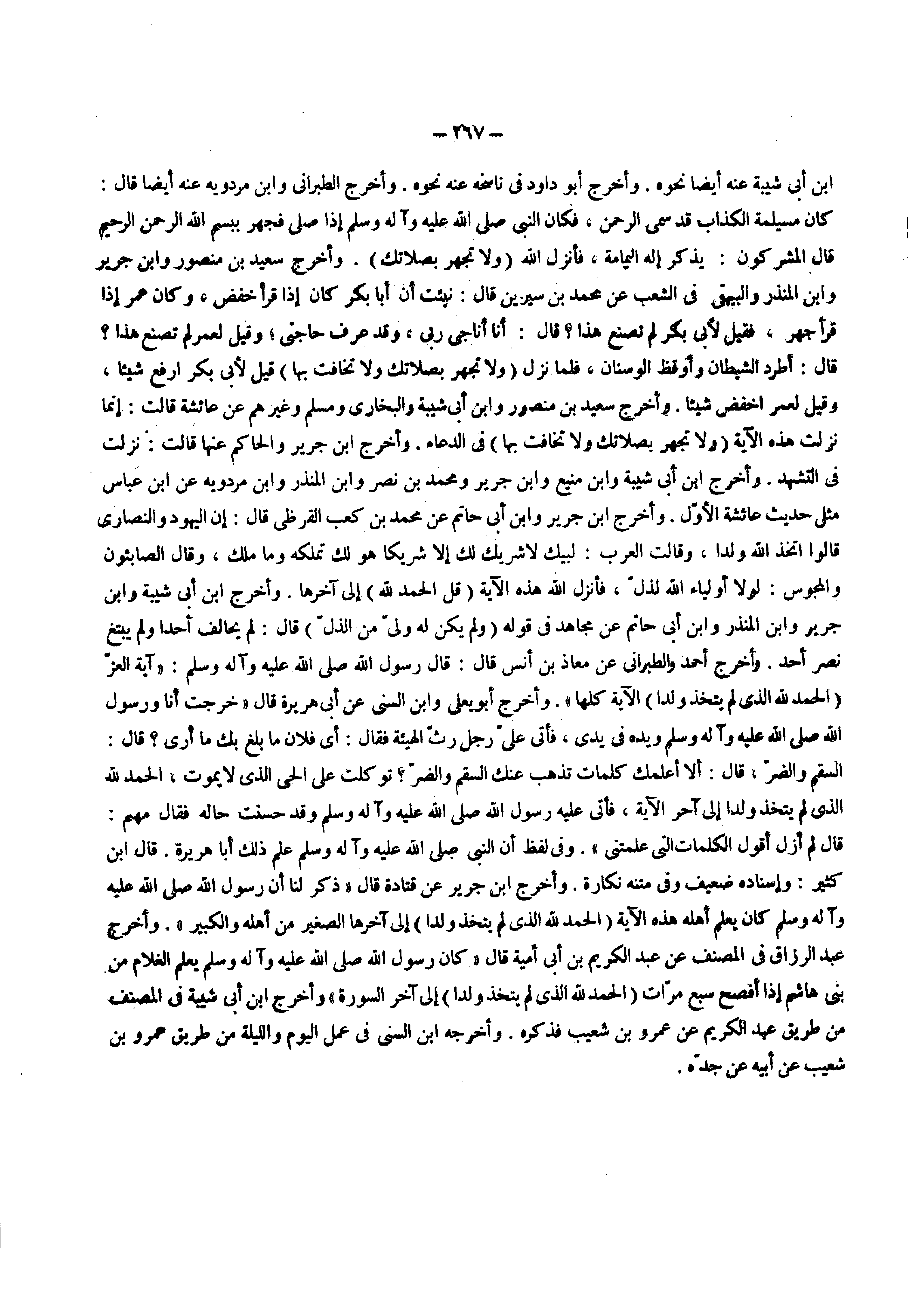 ابن أبي شيبة عنه أيضا نحوه وأخرج أبو داود فى ناسخه عنه نحوه وأخرج الطبراني وابن مردويه عنه أيضا قال كان مسيلمة الكذاب قد سمى الرحمن فكان النبي ( صلى الله عليه وسلم ) إذا صلى فجهر ببسم الله الرحمن الرحيم قال المشركون يذكر إله اليمامة فأنزل الله ) ولا تجهر بصلاتك ( وأخرج سعيد بن منصور وابن جرير وابن المنذر والبيهقي فى الشعب عن محمد بن سيرين قال نبئت أن أبا بكر كان إذا قرأ خفض وكان عمر إذا قرأ جهر فقيل لأبي بكر لم تصنع هذا قال أنا أناجي ربي وقد عرف حاجتي وقيل لعمر لم تصنع هذا قال أطرد الشيطان وأوقظ الوسنان فلما نزل ) ولا تجهر بصلاتك ولا تخافت بها ( قيل لأبي بكر ارفع شيئا وقيل لعمر اخفض شيئا وأخرج سعيد بن منصور وابن أبي شيبة والبخاري ومسلم وغيرهم عن عائشة قالت إنما نزلت هذه الآية ) ولا تجهر بصلاتك ولا تخافت بها ( فى الدعاء وأخرج ابن جرير والحاكم عنها قالت نزلت فى التشهد وأخرج ابن أبي شيبة وابن منيع وابن جرير ومحمد بن نصر وابن المنذر وابن مردويه عن ابن عباس مثل حديث عائشة الأول وأخرج ابن جرير وابن أبي حاتم عن محمد بن كعب القرظي قال إن اليهود والنصارى قالوا اتخذ الله ولدا وقالت العرب لبيك لا شريك لك إلا شريكا هو لك تملكه وما ملك وقال الصابئون والمجوس لولا أولياء الله لذل فأنزل الله هذه الآية ) قل الحمد لله ( إلى آخرها وأخرج ابن أبي شيبة وابن جرير وابن المنذر وابن أبي حاتم عن مجاهد فى قوله ) ولم يكن له ولي من الذل ( قال لم يحالف أحدا ولم يبتغ نصر أحد وأخرج أحمد والطبراني عن معاذ بن أنس قال قال رسول الله ( صلى الله عليه وسلم ) آية العز ) الحمد لله الذي لم يتخذ ولدا ( الآية كلها وأخرج أبو يعلى وابن السنى عن أبي هريرة قال خرجت أنا ورسول الله ( صلى الله عليه وسلم ) ويده فى يدي فأتى علي رجل رث الهيئة فقال أى فلان ما بلغ بك ما أرى قال السقم والضر قال ألا أعلمك كلمات تذهب عنك السقم والضر توكلت على الحي الذى لا يموت ) الحمد لله الذي لم يتخذ ولدا ( إلى آخر الآية فأتى عليه رسول الله ( صلى الله عليه وسلم ) وقد حسنت حاله فقال مهيم قال لم أزل أقول الكلمات التى علمتني وفى لفظ أن النبي ( صلى الله عليه وسلم ) علم ذلك أبا هريرة قال ابن كثير وإسناده ضعيف وفى متنه نكارة وأخرج ابن جرير عن قتادة قال ذكر لنا أن رسول الله ( صلى الله عليه وسلم ) كان يعلم أهله هذه الآية ) الحمد لله الذي لم يتخذ ولدا ( إلى آخرها الصغير من أهله والكبير وأخرج عبد الرزاق فى المصنف عن عبد الكريم بن أبي أمية قال كان رسول الله ( صلى الله عليه وسلم ) يعلم الغلام من بني هاشم إذا أفصح سبع مرات ) الحمد لله الذي لم يتخذ ولدا ( إلى آخر السورة وأخرج ابن أبي شيبة فى المصنف من طريق عبد الكريم عن عمرو بن شعيب فذكره وأخرجه ابن السني فى عمل اليوم والليلة من طريق عمرو بن شعيب عن أبيه عن جده