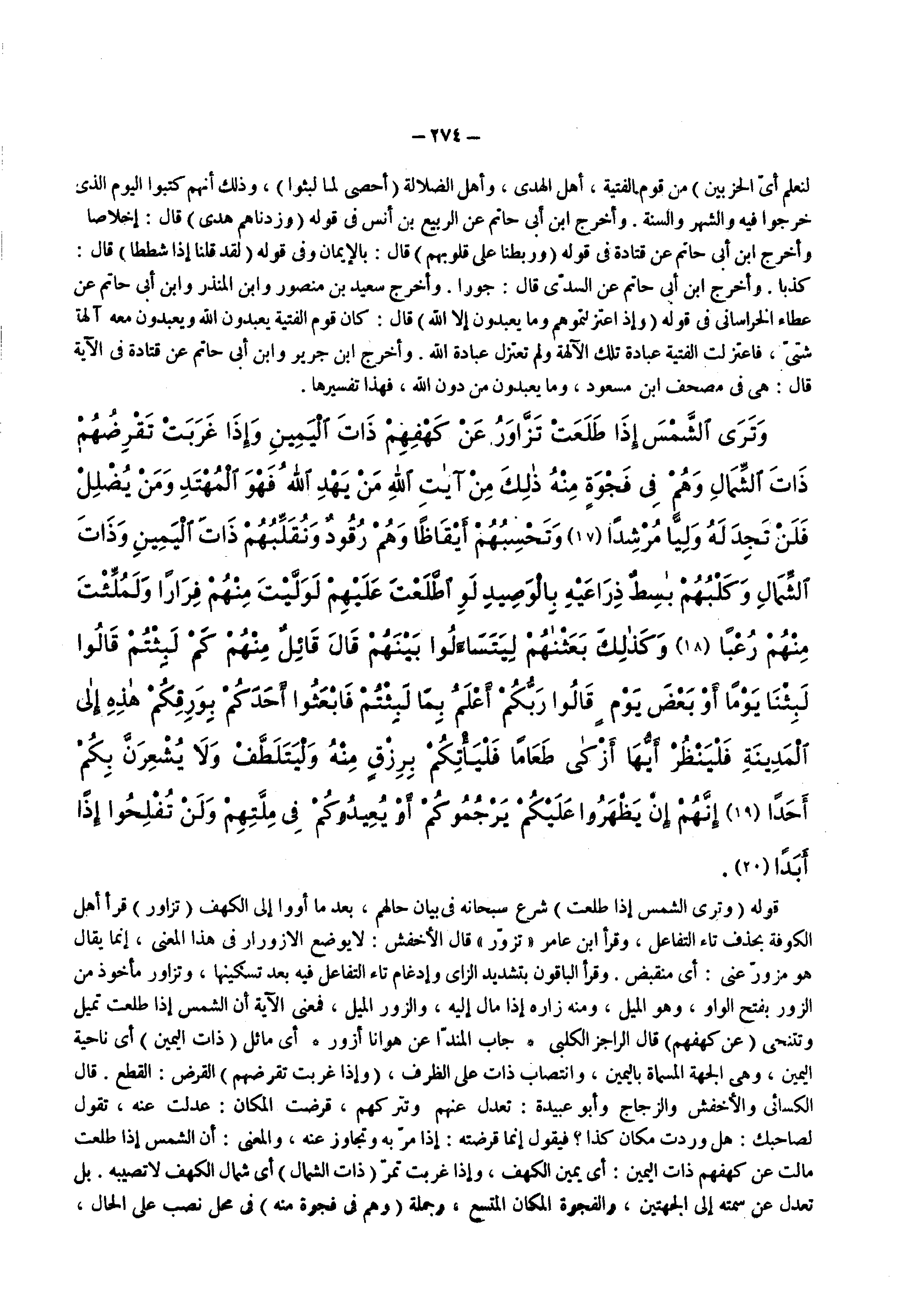 قوله ) وترى الشمس إذا طلعت ( شرع سبحانه فى بيان حالهم بعد ما أووا إلى الكهف ) تزاور ( قرأ أهل الكوفة بحذف تاء التفاعل وقرأ ابن عامر تزور قال الأخفش لا يوضع الأزورار فى هذا المعنى إنما يقال هو مزور عني أى منقبض وقرأ الباقون بتشديد الزاى وإدغام تاء التفاعل فيه بعد تسكينها وتزاور مأخوذ من الزور بفتح الواو وهو الميل ومنه زاره إذا مال إليه والزور الميل فمعنى الآية أن الشمس إذا طلعت تميل وتتنحى ) عن كهفهم ( قال الراجز الكلبى جاب المندا عن هوانا أزور
