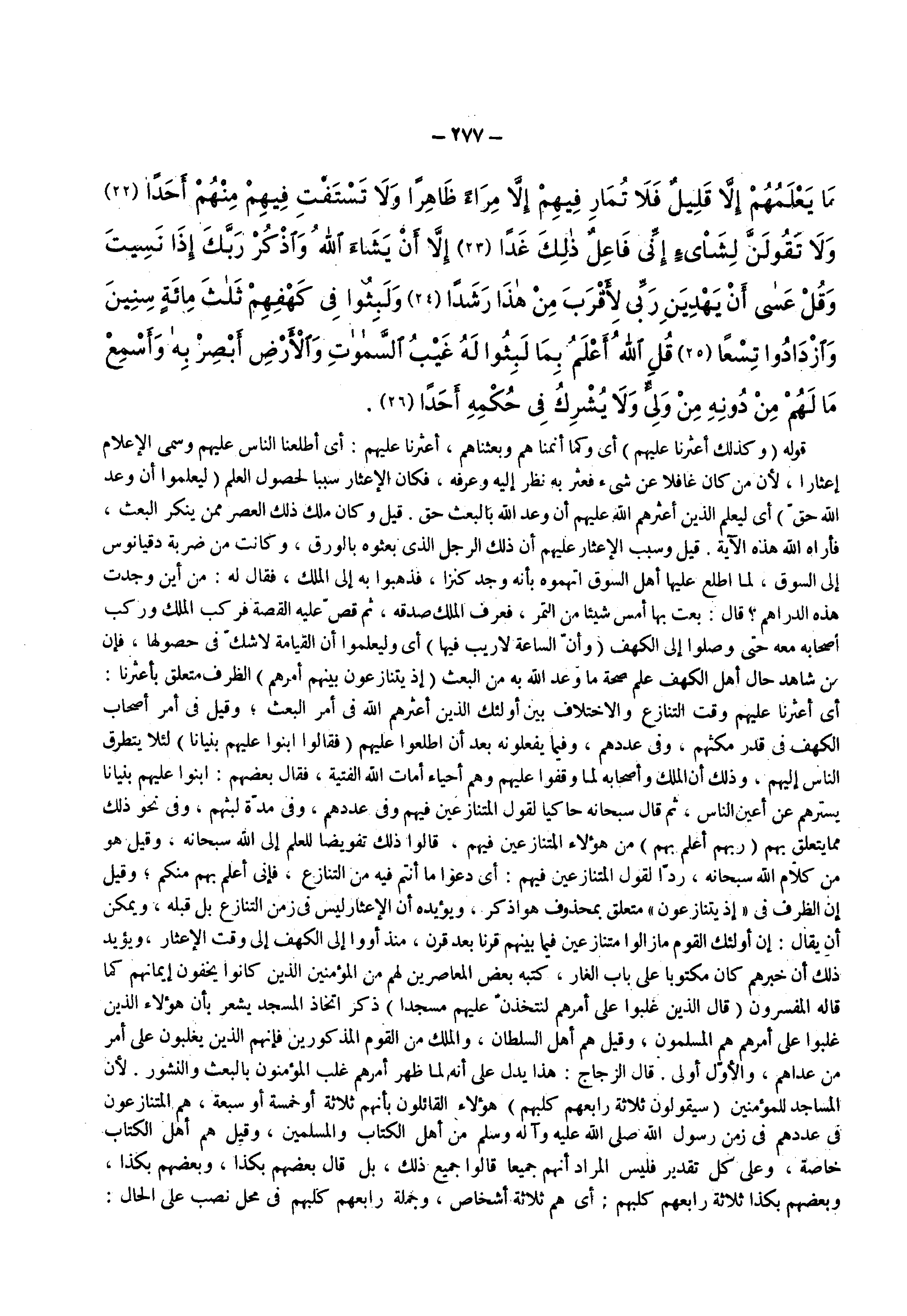 قوله ) وكذلك أعثرنا عليهم ( أى وكما أنمناهم وبعثناهم أعثرنا عليهم أى أطلعنا الناس عليهم وسمى الإعلام إعثارا لأن من كان غافلا عن شئ فعثر به نظر إليه وعرفه فكان الإعثار سببا لحصول العلم ) ليعلموا أن وعد الله حق ( أى ليعلم الذين أعثرهم الله عليهم أن وعد الله بالبعث حق قيل وكان ملك ذلك العصر ممن ينكر البعث فأراه الله هذه الآية قيل وسبب الإعثار عليهم أن ذلك الرجل الذى بعثوه بالورق وكانت من ضربة دقيانوس إلى السوق لما اطلع عليها أهل السوق اتهموه بأنه وجد كنزا فذهبوا به إلى الملك فقال له من أين وجدت هذه الدراهم قال بعت بها أمس شيئا من التمر فعرف الملك صدقه ثم قص عليه القصة فركب الملك وركب أصحابه معه حتى وصلوا إلى الكهف ) وأن الساعة لا ريب فيها ( أى وليعلموا أن القيامة لا شك فى حصولها فإن من شاهد حال أهل الكهف علم صحة ما وعد الله به من البعث ) إذ يتنازعون بينهم أمرهم ( الظرف متعلق بأعثرنا أى أعثرنا عليهم وقت التنازع والإختلاف بين أولئك الذين أعثرهم الله فى أمر البعث وقيل فى أمر أصحاب الكهف فى قدر مكثهم وفى عددهم وفيما يفعلونه بعد أن اطلعوا عليهم ) فقالوا ابنوا عليهم بنيانا ( لئلا يتطرق الناس إليهم وذلك أن الملك وأصحابه لما وقفوا عليهم وهم أحياء أمات الله الفتية فقال بعضهم ابنوا عليهم بنيانا يسترهم عن أعين الناس ثم قال سبحانه حاكيا لقول المتنازعين فيهم وفى عددهم وفى مدة لبثهم وفى نحو ذلك مما يتعلق بهم ) ربهم أعلم بهم ( من هؤلاء المتنازعين فيهم قالوا ذلك تفويضا للعلم إلى الله سبحانه وقيل هو من كلام الله سبحانه ردا لقول المتنازعين فيهم أى دعوا ما أنتم فيه من التنازع فإنى أعلم بهم منكم وقيل إن الظرف فى إذ يتنازعون متعلق بمحذوف هو اذكر ويؤيده أن الإعثار ليس فى زمن التنازع بل قبله ويمكن أن يقال إن أولئك القوم ما زالوا متنازعين فيما بينهم قرنا بعد قرن منذ أووا إلى الكهف إلى وقت الإعثار ويؤيد ذلك أن خبرهم كان مكتوبا على باب الغار كتبه بعض المعاصرين لهم من المؤمنين الذين كانوا يخفون إيمانهم كما قاله المفسرون ) قال الذين غلبوا على أمرهم لنتخذن عليهم مسجدا ( ذكر اتخاذ المسجد يشعر بأن هؤلاء الذين غلبوا على أمرهم هم المسلمون وقيل هم أهل السلطان والملك من القوم المذكورين فإنهم الذين يغلبون على أمر من عداهم والأول أولى قال الزجاج هذا يدل على أنه لما ظهر أمرهم غلب المؤمنون بالبعث والنشور لأن المساجد للمؤمنين