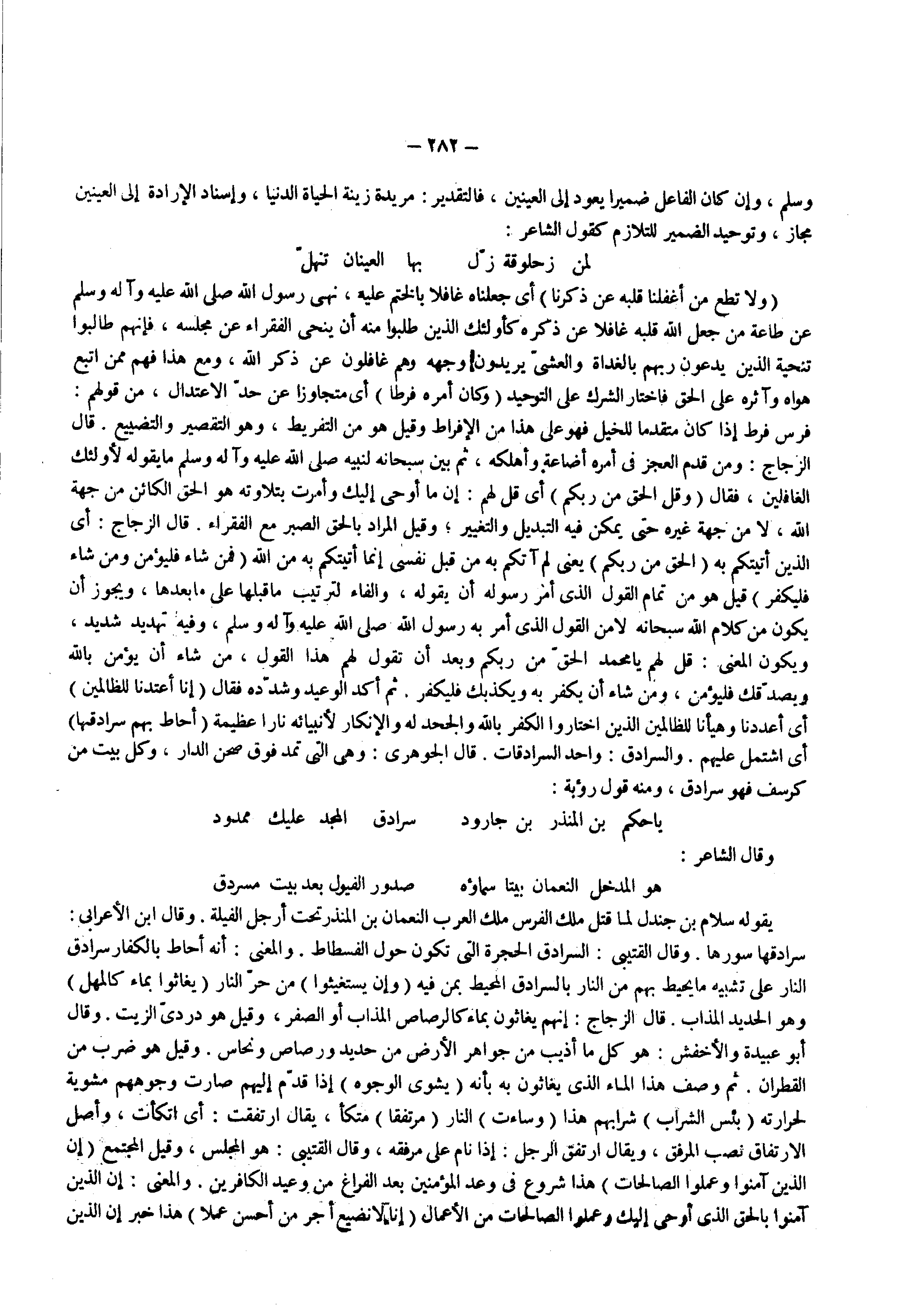 يقوله سلام بن جندل لما قتل ملك الفرس ملك العرب النعمان بن المنذر تحت أرجل الفيلة وقال ابن الأعرابي سرادقها سورها وقال القتيبي السرادق الحجرة التى تكون حول الفسطاط والمعنى أنه أحاط بالكفار سرادق النار على تشبيه ما يحيط بهم من النار بالسرادق المحيط بمن فيه ) وإن يستغيثوا ( من حر النار ) يغاثوا بماء كالمهل ( وهو الحديد المذاب قال الزجاج إنهم يغاثون بماء كالرصاص المذاب أو الصفر وقيل هو دردي الزيت وقال أبو عبيدة والأخفش هو كل ما أذيب من جواهر الأرض من حديد ورصاص ونحاس وقيل هو ضرب من القطران ثم وصف هذا الماء الذى يغاثون به بأنه ) يشوي الوجوه ( إذا قدم إليهم صارت وجوههم مشوية لحرارته ) بئس الشراب ( شرابهم هذا ) وساءت ( النار ) مرتفقا ( متكأ يقال ارتفقت أى اتكأت وأصل الارتفاق نصب المرفق ويقال ارتفق الرجل إذا نام على مرفقه وقال القتيبي هو المجلس وقيل المجتمع