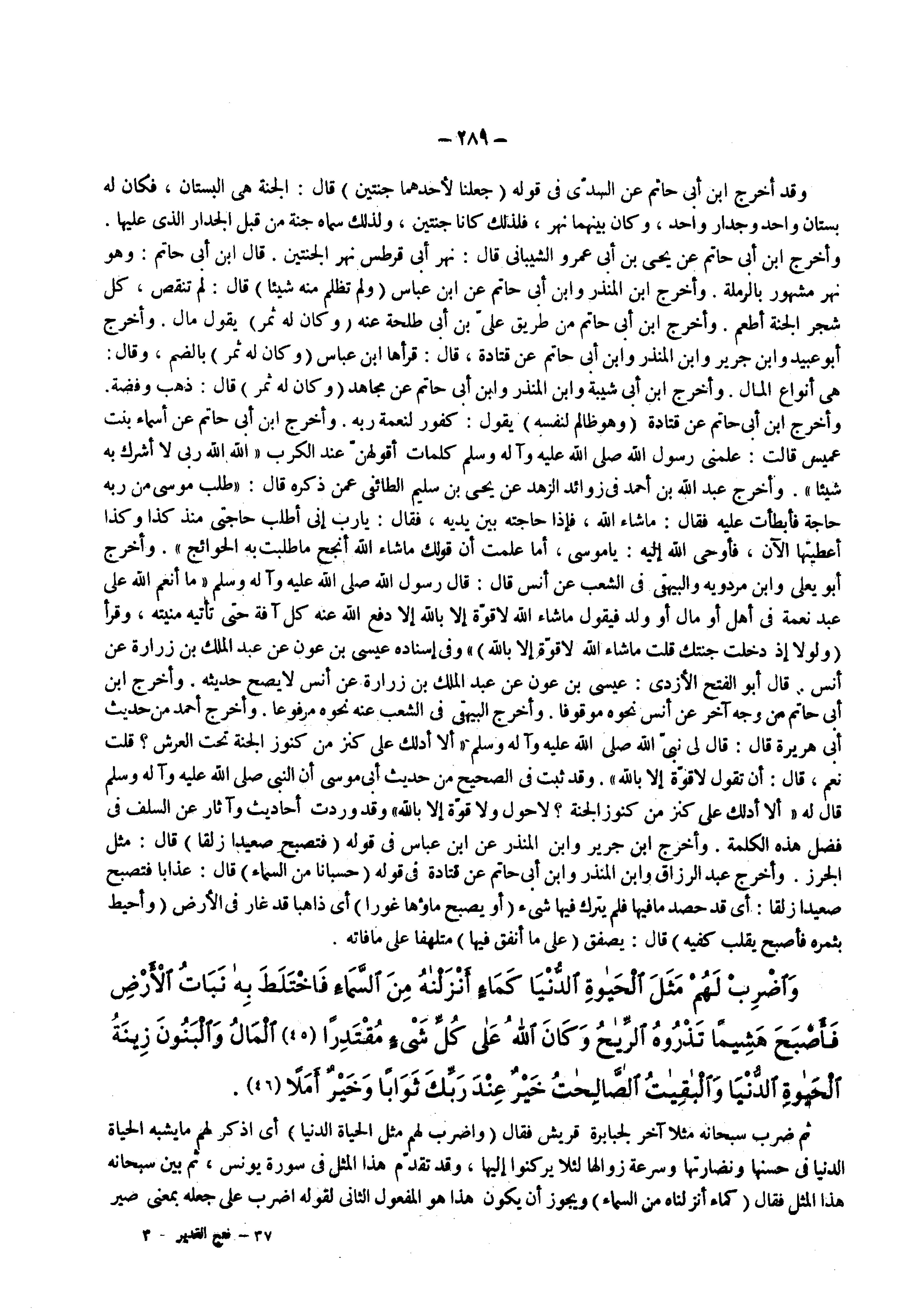 وقد أخرج ابن أبي حاتم عن السدي فى قوله ) جعلنا لأحدهما جنتين ( قال الجنة هى البستان فكان له بستان واحد وجدار واحد وكان بينهما نهر فلذلك كانا جنتين ولذلك سماه جنة من قبل الجدار الذى عليها وأخرج ابن أبي حاتم عن يحيى بن أبي عمرو الشيباني قال نهر أبي قرطس نهر الجنتين قال ابن أبي حاتم وهو نهر مشهور بالرملة وأخرج ابن المنذر وابن أبي حاتم عن ابن عباس ) ولم تظلم منه شيئا ( قال لم تنقص كل شجر الجنة أطعم وأخرج ابن أبي حاتم من طريق علي بن أبي طلحة عنه ) وكان له ثمر ( يقول مال وأخرج أبو عبيد وابن جرير وابن المنذر وابن أبي حاتم عن قتادة قال قرأها ابن عباس ) وكان له ثمر ( بالضم وقال هى أنواع المال وأخرج ابن أبي شيبة وابن المنذر وابن أبي حاتم عن مجاهد ) وكان له ثمر ( قال ذهب وفضة وأخرج ابن أبي حاتم عن قتادة ) وهو ظالم لنفسه ( يقول كفور لنعمة ربه وأخرج ابن أبي حاتم عن أسماء بنت عميس قالت علمنى رسول الله ( صلى الله عليه وسلم ) كلمات أقولهن عند الكرب الله الله ربي لا أشرك به شيئا وأخرج عبد الله بن أحمد فى زوائد الزهد عن يحيى بن سليم الطائفي عمن ذكره قال طلب موسى من ربه حاجة فأبطأت عليه فقال ما شاء الله فإذا حاجته بين يديه فقال يا رب إني أطلب حاجتي منذ كذا وكذا أعطيتها الآن فأوحى الله إليه يا موسى أما علمت أن قولك ما شاء الله أنجح ما طلبت به الحوائج وأخرج أبو يعلى وابن مردويه والبيهقي فى الشعب عن أنس قال قال رسول الله ( صلى الله عليه وسلم ) ما أنعم الله على عبد نعمة فى أهل أو مال أو ولد فيقول ما شاء الله لا قوة إلا بالله إلا دفع الله عنه كل آفة حتى تأتيه منيته وقرأ ) ولولا إذ دخلت جنتك قلت ما شاء الله لا قوة إلا بالله ( وفى إسناده عيسى بن عون عن عبد الملك بن زرارة عن أنس قال أبو الفتح الأزدي عيسى بن عون عن عبد الملك بن زرارة عن أنس لا يصح حديثه وأخرج ابن أبي حاتم من وجه آخر عن أنس نحوه موقوفا وأخرج البيهقي فى الشعب عنه نحوه مرفوعا وأخرج أحمد من حديث أبي هريرة قال قال لي نبي الله ( صلى الله عليه وسلم ) ألا أدلك على كنز من كنوز الجنة تحت العرش قلت نعم قال أن تقول لا قوة إلا بالله وقد ثبت فى الصحيح من حديث أبي موسى أن النبي ( صلى الله عليه وسلم ) قال له ألا أدلك على كنز من كنوز الجنة لا حول ولا قوة إلا بالله وقد وردت أحاديث وآثار عن السلف فى فضل هذه الكلمة وأخرج ابن جرير وابن المنذر عن ابن عباس فى قوله ) فتصبح صعيدا زلقا ( قال مثل الجرز وأخرج عبد الرزاق وابن المنذر وابن أبي حاتم عن قتادة فى قوله ) حسبانا من السماء ( قال عذابا فتصبح صعيدا زلقا أى قد حصد ما فيها فلم يترك فيها شيء ) أو يصبح ماؤها غورا ( أى ذاهبا قد غار فى الأرض ) وأحيط بثمره فأصبح يقلب كفيه ( قال يصفق ) على ما أنفق فيها ( متلهفا على ما فاته