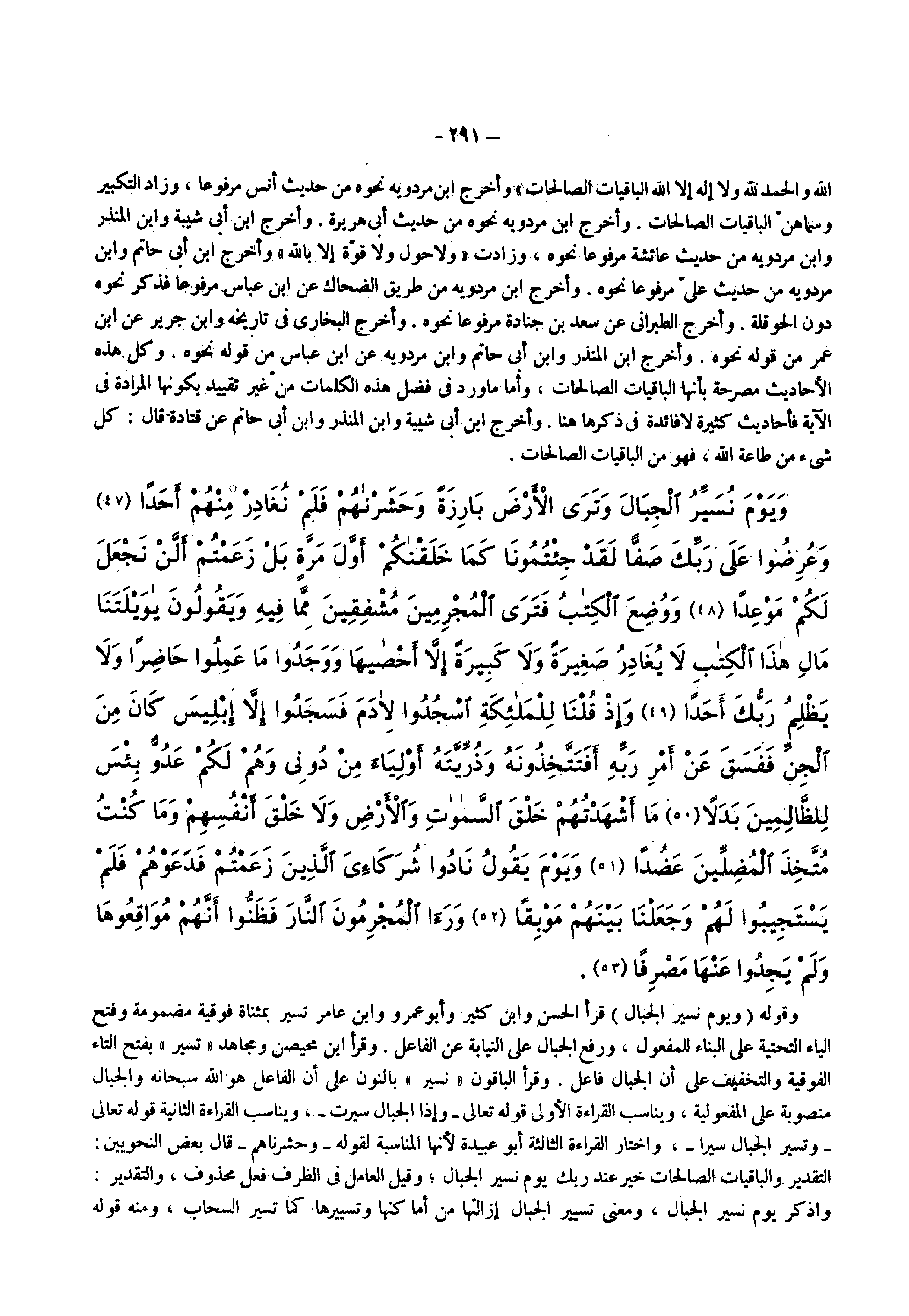 وقوله ) ويوم نسير الجبال ( قرأ الحسن وابن كثير وأبو عمرو وابن عامر تسير بمثناة فوقية مضمومة وفتح الياء التحتية على البناء للمفعول ورفع الجبال على النيابة عن الفاعل وقرأ ابن محيصن ومجاهد ? تسير ? بفتح التاء الفوقية والتخفيف على أن الجبال فاعل وقرأ الباقون ) نسير ( بالنون على أن الفاعل هو الله سبحانه والجبال منصوبة على المفعولية ويناسب القراءة الأولى قوله تعالى ) وإذا الجبال سيرت ( ويناسب القراءة الثانية قوله تعالى ) وتسير الجبال سيرا ( واختار القراءة الثالثة أبو عبيدة لأنها المناسبة لقوله ) وحشرناهم ( قال بعض النحويين التقدير والباقيات الصالحات خير عند ربك يوم نسير الجبال وقيل العامل فى الظرف فعل محذوف والتقدير واذكر يوم نسير الجبال ومعنى تسيير الجبال إزالتها من أماكنها وتسييرها كما تسير السحاب ومنه قوله