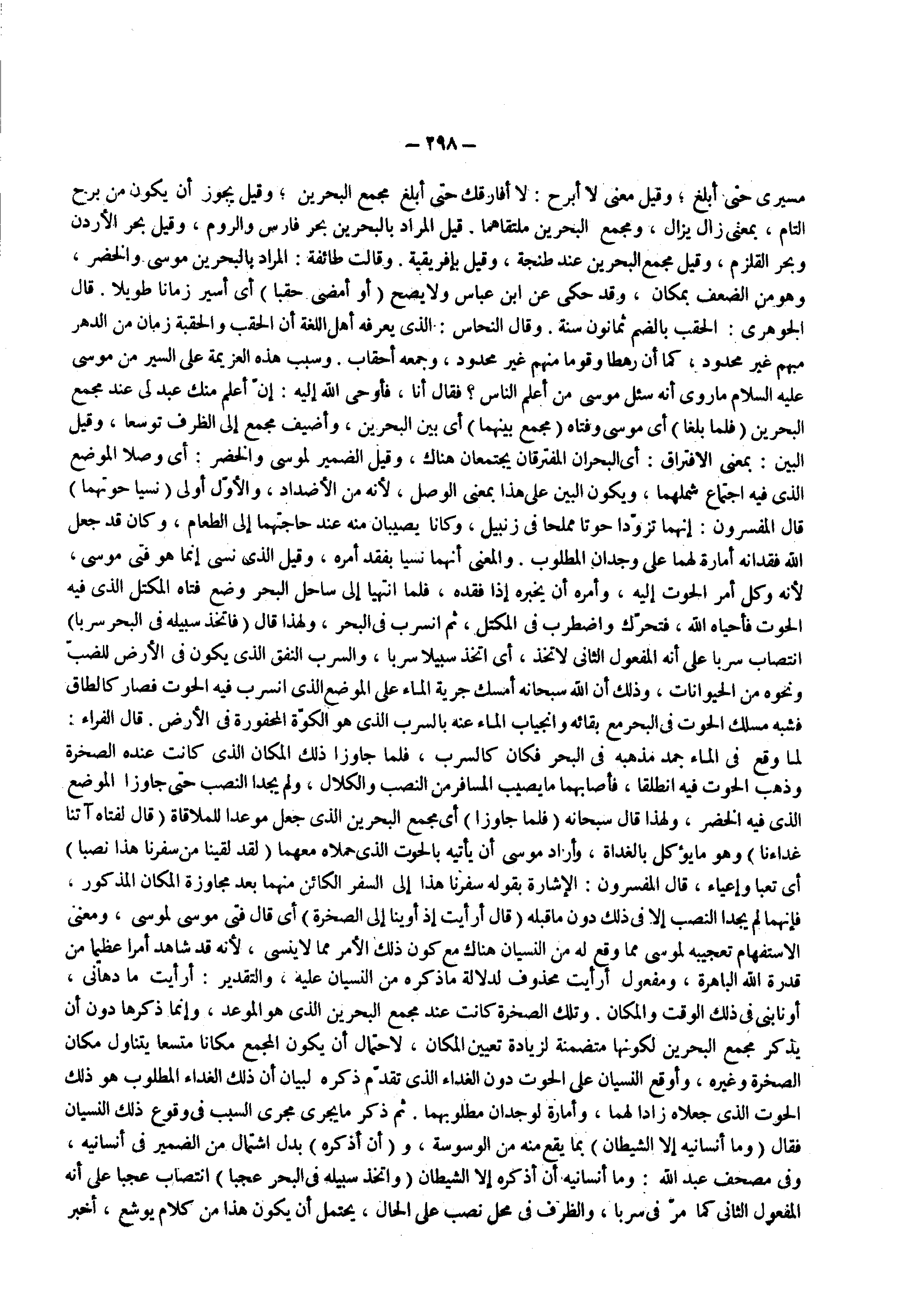 ) فلما بلغا ( أى موسى وفتاه ) مجمع بينهما ( أى بين البحرين وأضيف مجمع إلى الظرف توسعا وقيل البين بمعنى الافتراق أى البحران المفترقان يجتمعان هناك وقيل الضمير لموسى والخضر أى وصلا الموضع الذى فيه اجتماع شملهما ويكون البين على هذا بمعنى الوصل لأنه من الأضداد والأول أولى ) نسيا حوتهما ( قال المفسرون إنهما تزودا حوتا مملحا فى زنبيل وكانا يصيبان منه عند حاجتهما إلى الطعام وكان قد جعل الله فقدانه أمارة لهما على وجدان المطلوب والمعنى أنهما نسيا بفقد أمره وقيل الذى نسى إنما هو فتى موسى لأنه وكل أمر الحوت إليه وأمره أن يخبره إذا فقده فلما انتهيا إلى ساحل البحر وضع فتاه المكتل الذى فيه الحوت فأحياه الله فتحرك واضطرب فى المكتل ثم انسرب فى البحر ولهذا قال ) فاتخذ سبيله في البحر سربا ( انتصاب سربا على أنه المفعول الثاني لاتخذ أى اتخذ سبيلا سربا والسرب النفق الذى يكون فى الأرض للضب ونحوه من الحيوانات وذلك أن الله سبحانه أمسك جرية الماء على الموضع الذى انسرب فيه الحوت فصار كالطاق فشبه مسلك الحوت فى البحر مع بقائه وانجياب الماء عنه بالسرب الذى هو الكوة المحفورة فى الأرض قال الفراء لما وقع فى الماء جمد مذهبه فى البحر فكان كالسرب فلما جاوزا ذلك المكان الذى كانت عنده الصخرة وذهب الحوت فيه انطلقا فأصابهما ما يصيب المسافر من النصب والكلال ولم يجدا النصب حتى جاوزا الموضع الذى فيه الخضر