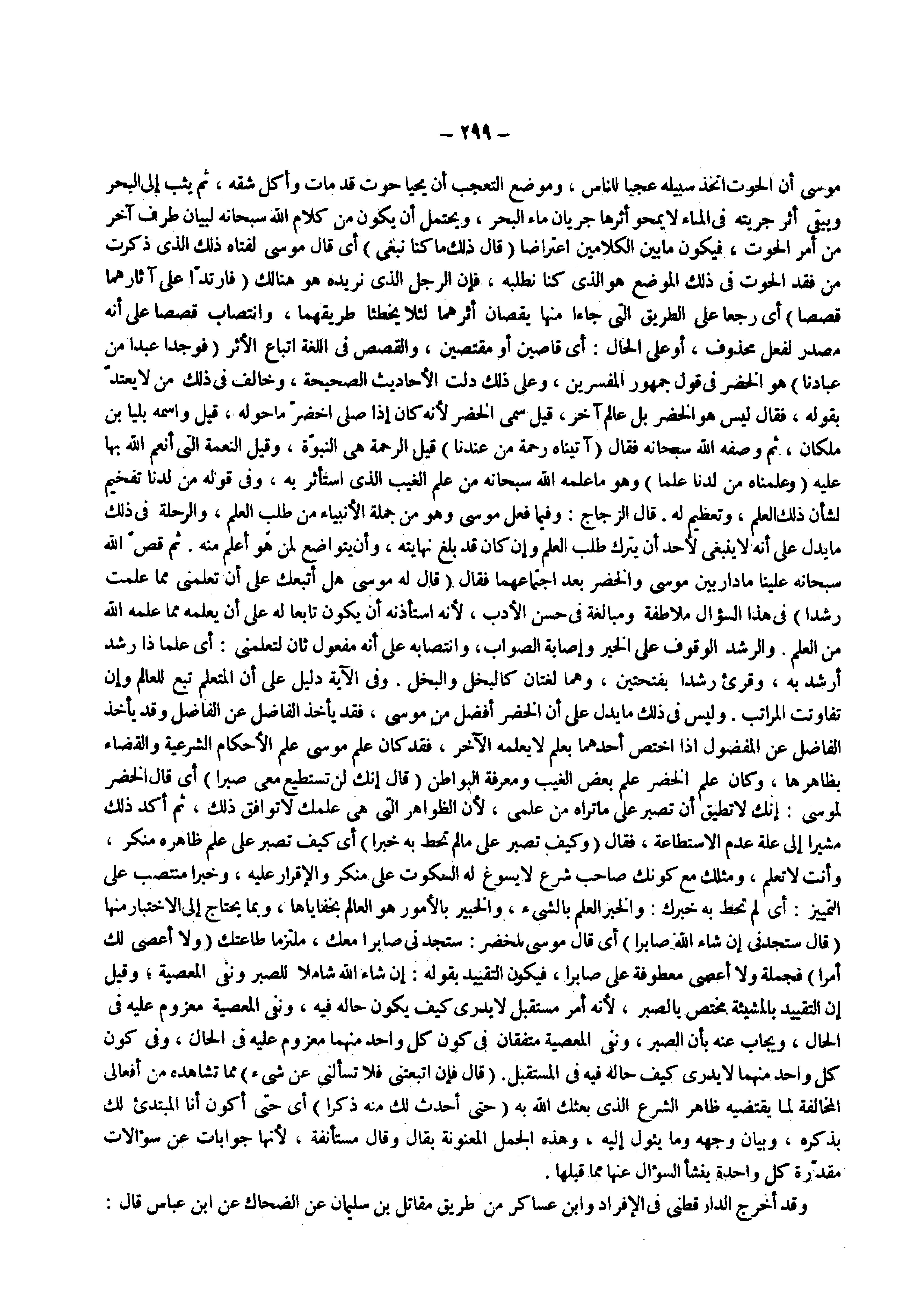 ) قال ذلك ما كنا نبغ ( أى قال موسى لفتاه ذلك الذى ذكرت من فقد الحوت فى ذلك الموضع هو الذى كنا نطلبه فإن الرجل الذى نريده هو هنالك ) فارتدا على آثارهما قصصا ( أى رجعا على الطريق التى جاءا منها يقصان أثرهما لئلا يخطئا طريقهما وانتصاب قصصا على أنه مصدر لفعل محذوف أو على الحال أى قاصين أو مقتصين والقصص فى اللغة اتباع الأثر