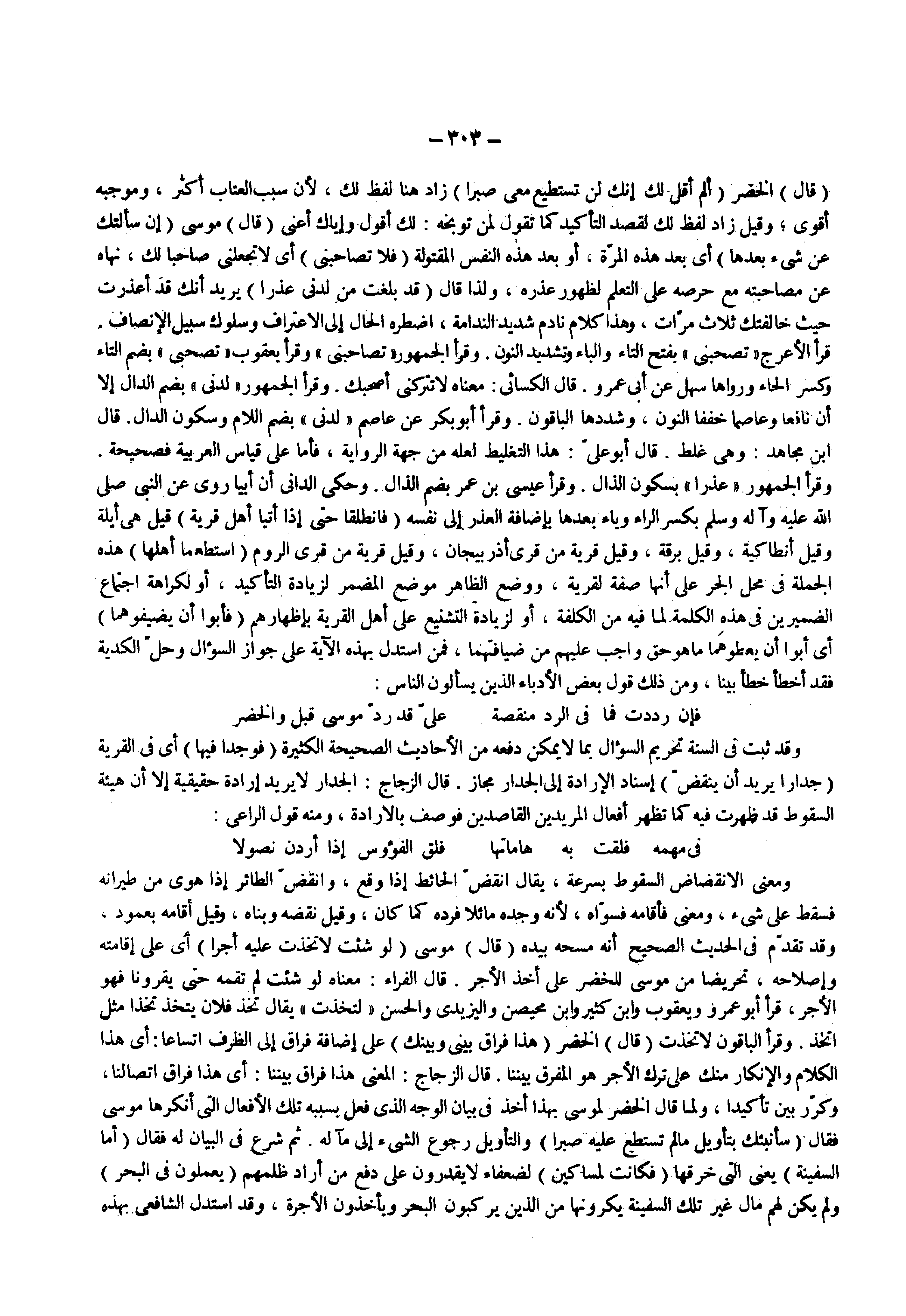 ) قال ( موسى ) إن سألتك عن شيء بعدها ( أى بعد هذه المرة أو بعد هذه النفس المقتولة ) فلا تصاحبني ( أى لا تجعلنى صاحبا لك نهاه عن مصاحبته مع حرصه على التعلم لظهور عذره ولذا قال ) قد بلغت من لدني عذرا ( يريد أنك قد أعذرت حيث خالفتك ثلاث مرات وهذا كلام نادم شديد الندامة اضطره الحال إلى الاعتراف وسلوك سبيل الإنصاف قرأ الأعرج تصحبنى بفتح التاء والباء وتشديد النون وقرأ الجمهور تصاحبنى وقرأ يعقوب تصحبى بضم التاء وكسر الحاء ورواها سهل عن أبى عمرو قال الكسائي معناه لا تتركنى أصحبك وقرأ الجمهور ) لدني ( بضم الدال إلا أن نافعا وعاصما خففا النون وشددها الباقون وقرأ أبو بكر عن عاصم ) لدني ( بضم اللام وسكون الدال قال ابن مجاهد وهى غلط قال أبو علي هذا التغليط لعله من جهة الرواية فأما على قياس العربية فصحيحة وقرأ الجمهور ) عذرا ( بسكون الذال وقرأ عيسى بن عمر بضم الذال وحكى الدانى أن أبيا روى عن النبي ( صلى الله عليه وسلم ) بكسر الراء وياء بعدها بإضافة العذر إلى نفسه