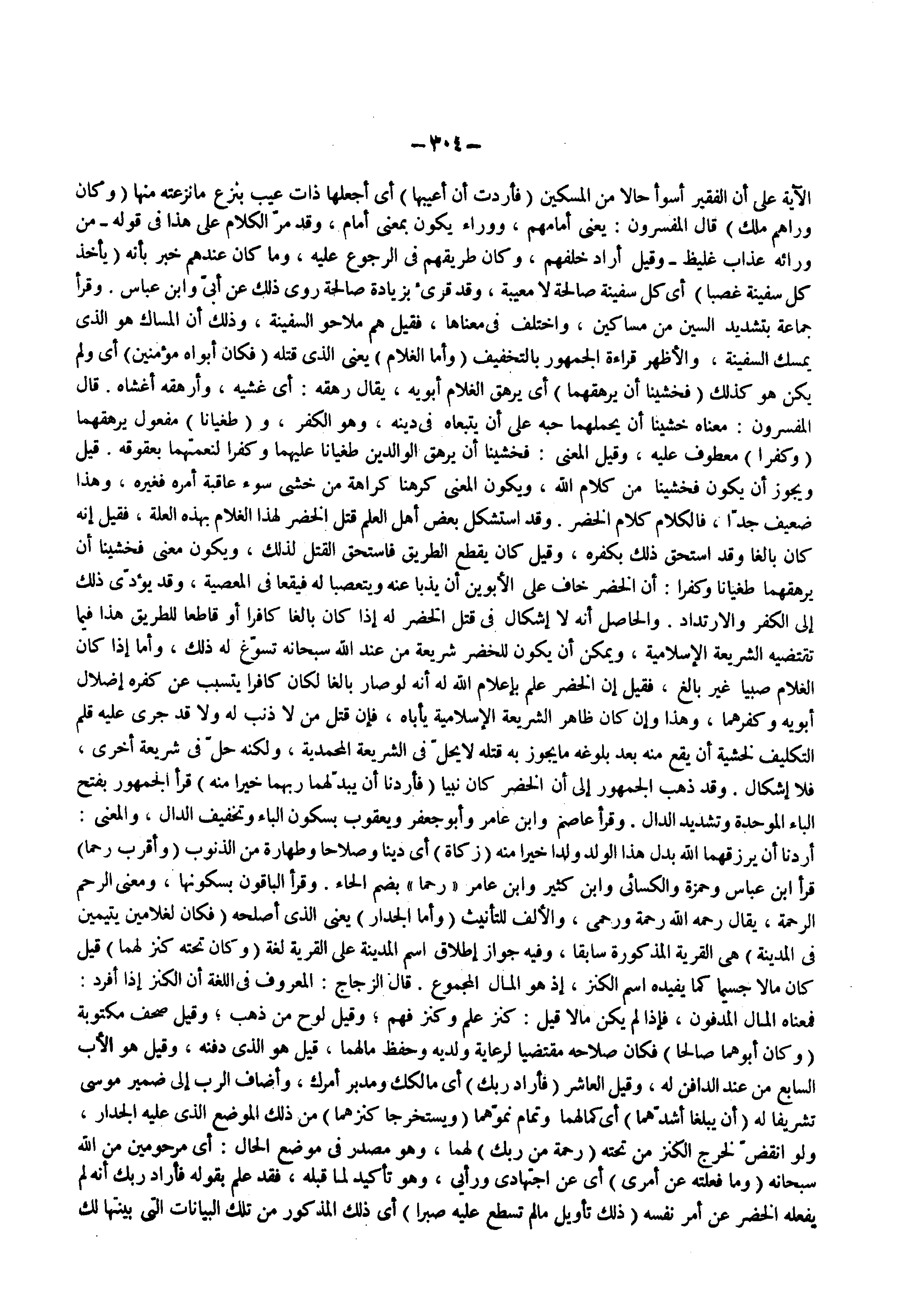 ) وأما الغلام ( يعنى الذى قتله ) فكان أبواه مؤمنين ( أى ولم يكن هو كذلك ) فخشينا أن يرهقهما ( أى يرهق الغلام أبويه يقال رهقه أى غشيه وأرهقه أغشاه قال المفسرون معناه خشينا أن يحملهما حبه على أن يتبعاه فى دينه وهو الكفر و ) طغيانا ( مفعول يرهقهما ) وكفرا ( معطوف عليه وقيل المعنى فخشينا أن يرهق الوالدين طغيانا عليهما وكفرا لنعمتهما بعقوقه قيل ويجوز أن يكون فخشينا من كلام الله ويكون المعنى كرهنا كراهة من خشى سوء عاقبة أمره فغيره وهذا ضعيف جدا فالكلام كلام الخضر وقد استشكل بعض أهل العلم قتل الخضر لهذا الغلام بهذه العلة فقيل إنه كان بالغا وقد استحق ذلك بكفره وقيل كان يقطع الطريق فاستحق القتل لذلك ويكون معنى فخشينا أن يرهقهما طغيانا وكفرا أن الخضر خاف على الأبوين أن يذبا عنه ويتعصبا له فيقعا فى المعصية وقد يؤدى ذلك إلى الكفر والارتداد والحاصل أنه لا إشكال فى قتل الخضر له إذا كان بالغا كافرا أو قاطعا للطريق هذا فيما تقتضيه الشريعة الإسلامية ويمكن أن يكون للخضر شريعة من عند الله سبحانه تسوغ له ذلك وأما إذا كان الغلام صبيا غير بالغ فقيل إن الخضر علم بإعلام الله له أنه لو صار بالغا لكان كافرا يتسبب عن كفره إضلال أبويه وكفرهما وهذا وإن كان ظاهر الشريعة الإسلامية يأباه فإن قتل من لا ذنب له ولا قد جرى عليه قلم التكليف لخشية أن يقع منه بعد بلوغه ما يجوز به قتله لا يحل فى الشريعة المحمدية ولكنه حل فى شريعة أخرى فلا إشكال وقد ذهب الجمهور إلى أن الخضر كان نبيا