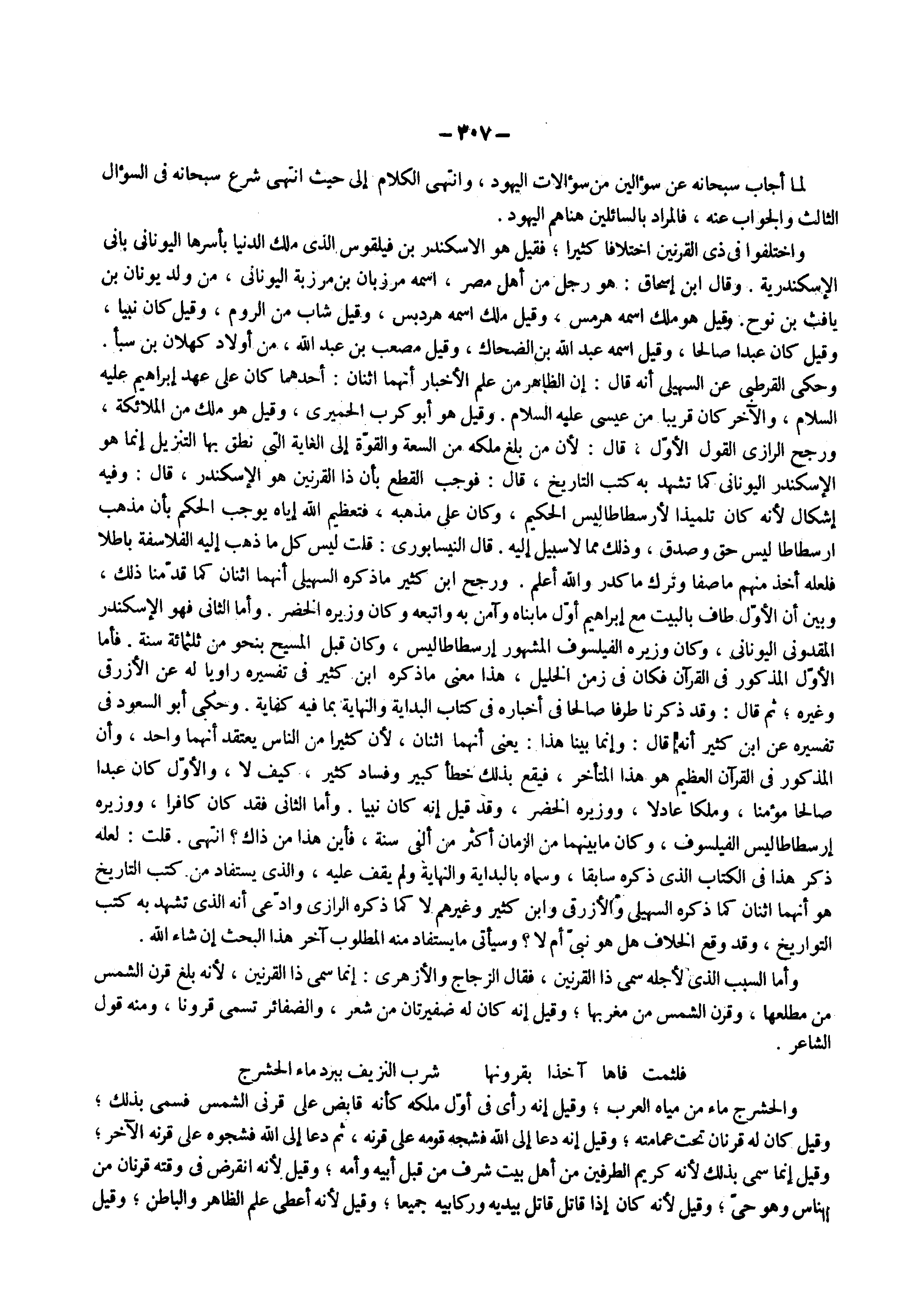 واختلفوا فى ذى القرنين اختلافا كثيرا فقيل هو الإسكندر بن فيلقوس الذى ملك الدنيا بأسرها اليوناني باني الإسكندريه وقال ابن إسحاق هو رجل من أهل مصر اسمه مرزبان من مرزبه اليوناني من ولد يونان بن يافث بن نوح وقيل هو ملك اسمه هرمس وقيل ملك اسمه هردبس وقيل شاب من الروم وقيل كان نبيا وقيل كان عبدا صالحا قيل اسمه عبد الله بن الضحاك وقيل مصعب بن عبد الله من أولاد كهلان بن سبأ وحكى القرطبي عن السهيلي أنه قال إن الظاهر من علم الأخبار أنهما اثنان أحدهما كان على عهد إبراهيم عليه السلام والآخر كان قريبا من عيسى عليه السلام وقيل هو أبو كرب الحميري وقيل هو ملك من الملائكة ورجح الرازي القول الأول قال لأن من بلغ ملكه من السعة والقوة إلى الغاية التى نطق بها التنزيل إنما هو الإسكندر اليوناني كما تشهد به كتب التاريخ قال فوجب القطع بأن ذا القرنين هو الإسكندر قال وفيه إشكال لأنه كان تلميذا لأرسطاطاليس الحكيم وكان على مذهبه فتعظيم الله إياه يوجب الحكم بأن مذهب أرسطاطا ليس حق وصدق وذلك مما لا سبيل إليه قال النيسابوري قلت ليس كل ما ذهب إليه الفلاسفة باطلا فلعله أخذ منهم ما صفا وترك ما كدر والله أعلم ورجح ابن كثير ما ذكره السهيلي أنهما اثنان كما قدمنا ذلك وبين أن الأول طاف بالبيت مع إبراهيم أول ما بناه وآمن به واتبعه وكان وزيره الخضر وأما الثاني فهو الإسكندر المقدوني اليوناني وكان وزيره الفيلسوف المشهور إرسطاطاليس وكان قبل المسيح بنحو من ثلثمائة سنة فأما الأول المذكور فى القرآن فكان فى زمن الخليل هذا معنى ما ذكره ابن كثير فى تفسيره راويا له عن الأزرقي وغيره ثم قال وقد ذكرنا طرفا صالحا فى أخباره فى كتاب البداية والنهاية بما فيه كفاية وحكى أبو السعود فى تفسيره عن ابن كثير أنه قال وإنما بينا هذا يعنى أنهما اثنان لأن كثيرا من الناس يعتقد أنهما واحد وأن المذكور فى القرآن العظيم هو هذا المتأخر فيقع بذلك خطأ كبير وفساد كثير كيف لا والأول كان عبدا صالحا مؤمنا وملكا عادلا ووزيره الخضر وقد قيل إنه كان نبيا وأما الثانى فقد كان كافرا ووزيره إرسطاطاليس الفيلسوف وكان ما بينهما من الزمان أكثر من ألفى سنة فأين هذا من ذاك انتهى قلت لعله ذكر هذا فى الكتاب الذى ذكره سابقا وسماه بالبداية والنهاية ولم يقف عليه والذى يستفاد من كتب التاريخ هو أنهما اثنان كما ذكره السهيلي والأزرقي وابن كثير وغيرهم لا كما ذكره الرازي وادعى أنه الذى تشهد به كتب التواريخ وقد وقع الخلاف هل هو نبى أم لا وسيأتى ما يستفاد منه المطلوب آخر هذا البحث إن شاء الله