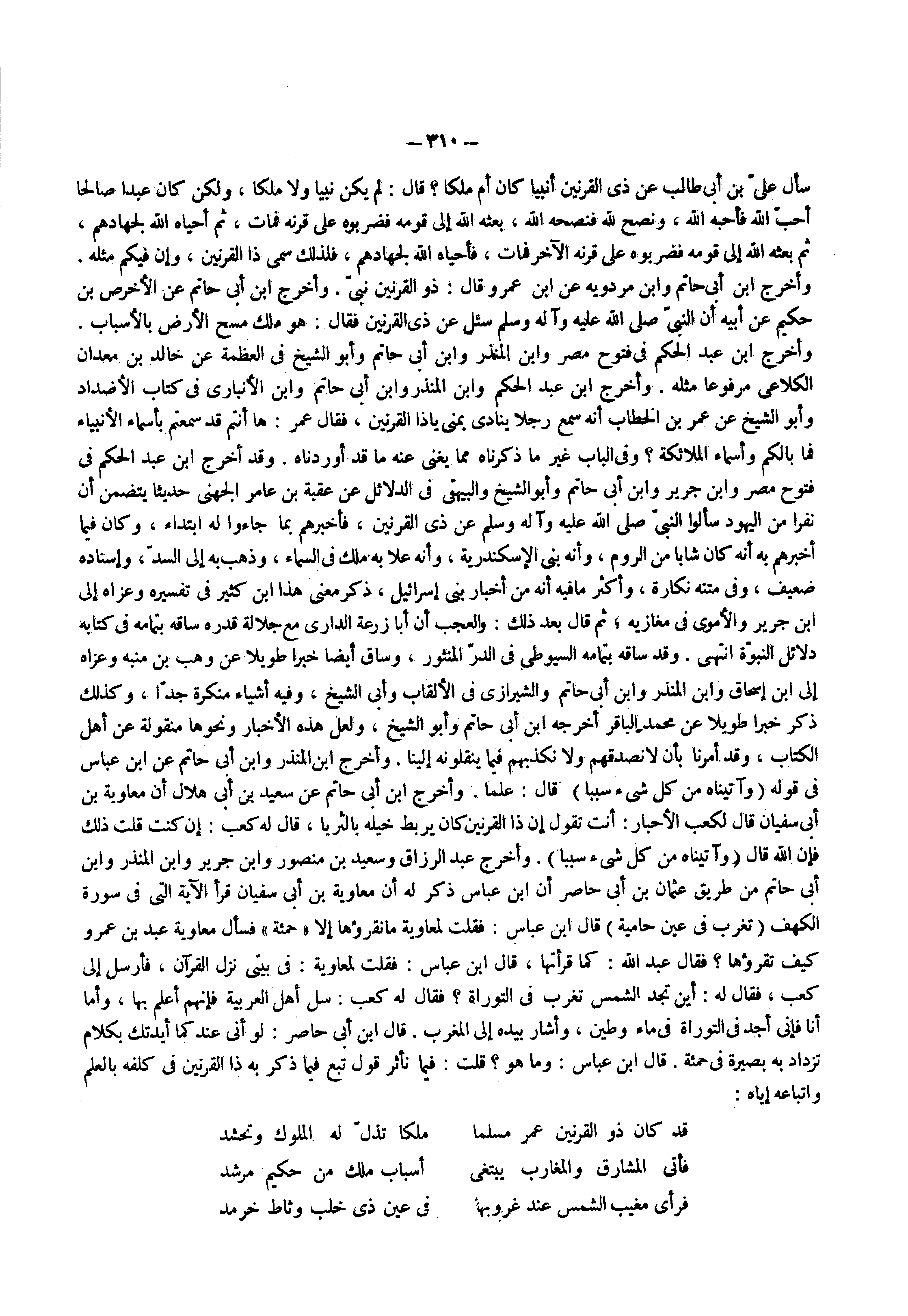 سأل علي بن أبي طالب عن ذي القرنين أنبيا كان أم ملكا قال لم يكن نبيا ولا ملكا ولكن كان عبدا صالحا أحب الله فأحبه الله ونصح لله فنصحه الله بعثه الله إلى قومه فضربوه على قرنه فمات ثم أحياه الله لجهادهم ثم بعثه الله إلى قومه فضربوه على قرنه الآخر فمات فأحياه الله لجهادهم فلذلك سمى ذا القرنين وإن فيكم مثله وأخرج ابن أبي حاتم وابن مردويه عن ابن عمرو قال ذو القرنين نبي وأخرج ابن أبي حاتم عن الأخرص بن حكيم عن أبيه أن النبي ( صلى الله عليه وسلم ) سئل عن ذي القرنين فقال هو ملك مسح الأرض بالأسباب وأخرج ابن عبد الحكم فى فتوح مصر وابن المنذر وابن أبي حاتم وأبو الشيخ فى العظمة عن خالد بن معدان الكلاعي مرفوعا مثله وأخرج ابن عبد الحكم وابن المنذر وابن أبي حاتم وابن الأنباري فى كتاب الأضداد وأبو الشيخ عن عمر بن الخطاب أنه سمع رجلا ينادي بمنى ياذا القرنين فقال عمر ها أنتم قد سمعتم بأسماء الأنبياء فما بالكم وأسماء الملائكة وفى الباب غير ما ذكرناه مما يغني عنه ما قد أوردناه وقد أخرج ابن عبد الحكم فى فتوح مصر وابن جرير وابن أبي حاتم وأبو الشيخ والبيهقي فى الدلائل عن عقبة بن عامر الجهني حديثا يتضمن أن نفرا من اليهود سألوا النبي ( صلى الله عليه وسلم ) عن ذي القرنين فأخبرهم بما جاءوا له ابتداء وكان فيما أخبرهم به أنه كان شابا من الروم وأنه بنى الإسكندرية وأنه علا به ملك فى السماء وذهب به إلى السد وإسناده ضعيف وفى متنه نكارة وأكثر ما فيه أنه من أخبار بني إسرائيل ذكر معنى هذا ابن كثير فى تفسيره وعزاه إلى ابن جرير والأموى فى مغازيه ثم قال بعد ذلك والعجب أن أبا زرعة الداري مع جلالة قدره ساقه بتمامه فى كتابه دلائل النبوة انتهى وقد ساقه بتمامه السيوطي فى الدر المنثور وساق أيضا خبرا طويلا عن وهب بن منبه وعزاه إلى ابن إسحاق وابن المنذر وابن أبي حاتم والشيرازي فى الألقاب وأبي الشيخ وفيه أشياء منكرة جدا وكذلك ذكر خبرا طويلا عن محمد الباقر أخرجه ابن أبي حاتم وأبو الشيخ ولعل هذه الأخبار ونحوها منقولة عن أهل الكتاب وقد أمرنا بأن لا نصدقهم ولا نكذبهم فيما ينقلونه إلينا وأخرج ابن المنذر وابن أبي حاتم عن ابن عباس فى قوله ) وآتيناه من كل شيء سببا ( قال علما وأخرج ابن أبي حاتم عن سعيد بن أبي هلال أن معاوية بن أبي سفيان قال لكعب الأحبار أنت تقول إن ذا القرنين كان يربط خيله بالثريا قال له كعب إن كنت قلت ذلك فإن الله قال ) وآتيناه من كل شيء سببا ( وأخرج عبد الرزاق وسعيد بن منصور وابن جرير وابن المنذر وابن أبي حاتم من طريق عثمان بن أبي حاصر أن ابن عباس ذكر له أن معاوية بن أبي سفيان قرأ الآية التى فى سورة الكهف ? تغرب فى عين حامية ? قال ابن عباس فقلت لمعاوية ما نقرؤها إلا ) حمئة ( فسأل معاوية عبد بن عمرو كيف تقرؤها فقال عبد الله كما قرأتها قال ابن عباس فقلت لمعاوية فى بيتي نزل القرآن فأرسل إلى كعب فقال له أين تجد الشمس تغرب فى التوراة فقال له كعب سل أهل العربية فإنهم أعلم بها وأما أنا فإني أجد فى التوراة فى ماء وطين وأشار بيده إلى المغرب قال ابن أبي حاصر لو أني عندكما أيدتك بكلام تزداد به بصيرة فى حمئة قال ابن عباس وما هو قلت فيما نأثر قول تبع فيما ذكر به ذا القرنين فى كلفه بالعلم واتباعه إياه قد كان ذو القرنين عمر مسلما