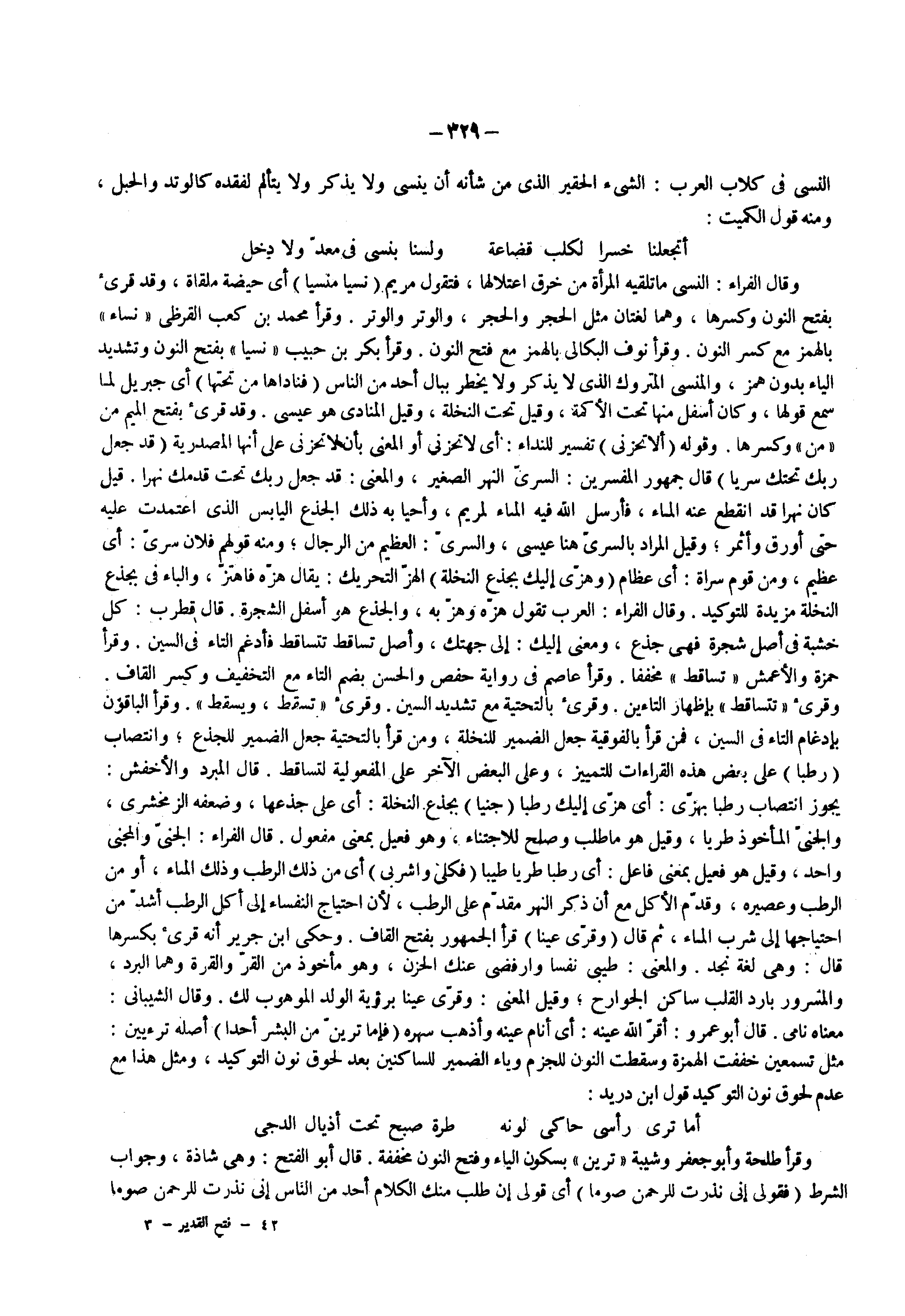 ) فكلي واشربي ( أى من ذلك الرطب وذلك الماء أو من الرطب وعصيره وقدم الأكل مع أن ذكر النهر مقدم على الرطب لأن احتياج النفساء إلى أكل الرطب أشد من احتياجها إلى شرب الماء ثم قال ) وقري عينا ( قرأ الجمهور بفتح القاف وحكى ابن جرير أنه قرئ بكسرها قال وهى لغة نجد والمعنى طيبي نفسا وارفضي عنك الحزن وهو مأخوذ من القر والقرة وهما البرد والمسرور بارد القلب ساكن الجوارح وقيل المعنى وقرى عينا برؤية الولد الموهوب لك وقال الشيباني معناه نامي قال أبو عمرو أقر الله عينه أى أنام عينه وأذهب سهره ) فإما ترين من البشر أحدا ( أصله ترءيين مثل تسمعين خففت الهمزة وسقطت النون للجزم وياء الضمير للساكنين بعد لحوق نون التوكيد ومثل هذا مع عدم لحوق نون التوكيد قول ابن دريد أما ترى رأسى حاكى لونه