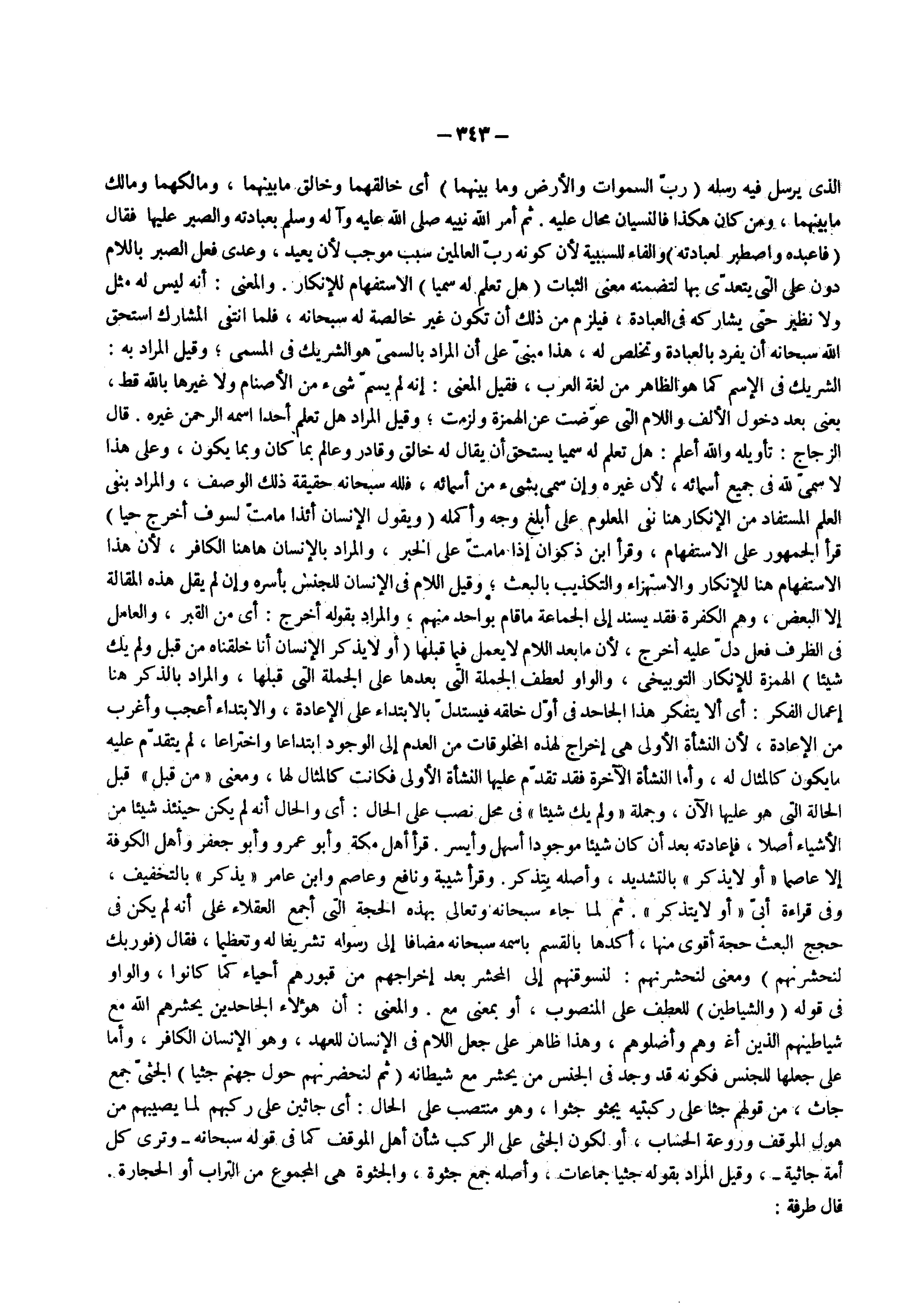 ثم لما جاء سبحانه وتعالى بهذه الحجة التى أجمع العقلاء على أنه لم يكن فى حجج البعث حجة أقوى منها أكدها بالقسم باسمه سبحانه مضافا إلى رسوله تشريفا له وتعظيما فقال ) فوربك لنحشرنهم ( ومعنى لنحشرنهم لنسوقنهم إلى المحشر بعد إخراجهم من قبورهم أحياء كما كانوا والواو فى قوله ) والشياطين ( للعطف على المنصوب أو بمعنى مع والمعنى أن هؤلاء الجاحدين يحشرهم الله مع شياطينهم الذين أغووهم وأضلوهم وهذا ظاهر على جعل اللام فى الإنسان للعهد وهو الإنسان الكافر وأما على جعلها للجنس فكونه قد وجد فى الجنس من يحشر مع شيطانه ) ثم لنحضرنهم حول جهنم جثيا ( الجثى جمع جاث من قولهم جثا على ركبتيه يجثو جثوا وهو منتصب على الحال أى جاثين على ركبهم لما يصيبهم من هول الموقف وروعة الحساب أو لكون الجثى على الركب شأن أهل الموقف كما فى قوله سبحانه ) وترى كل أمة جاثية ( وقيل المراد بقوله جثيا جماعات وأصله جمع جثوة والجثوة هي المجموع من التراب أو الحجارة
