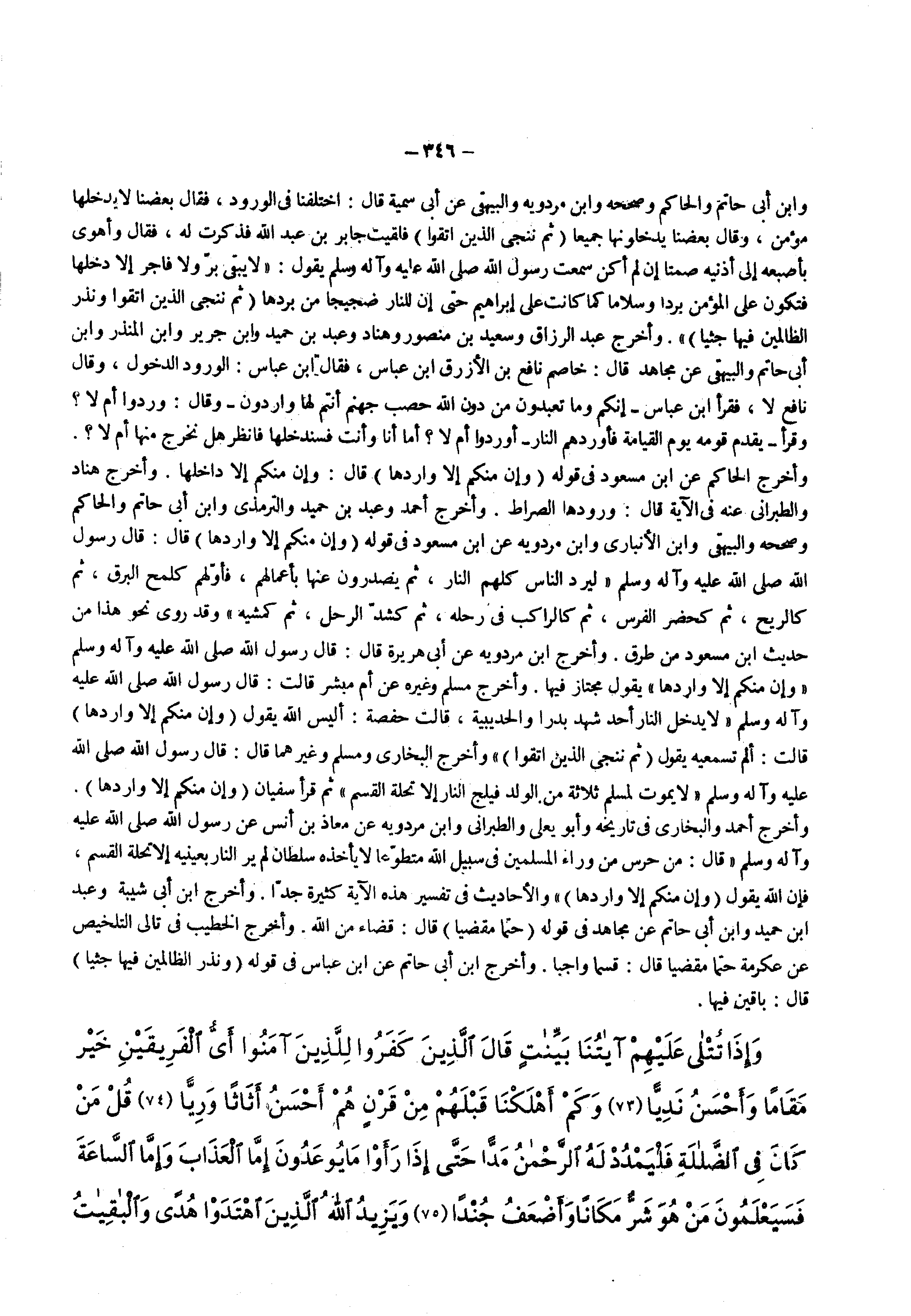 وابن أبى حاتم والحاكم وصححه وابن مردويه والبيهقى عن أبى سمية قال اختلفنا فى الورود فقال بعضنا لا يدخلها مؤمن وقال بعضنا يدخلونها جميعا ) ثم ننجي الذين اتقوا ( فلقيت جابر بن عبد الله فذكرت له فقال وأهوى بأصبعه إلى أذنيه صمتا إن لم أكن سمعت رسول الله ( صلى الله عليه وسلم ) يقول لا يبقى بر ولا فاجر إلا دخلها فتكون على المؤمن بردا وسلاما كما كانت على إبراهيم حتى إن للنار ضجيجا من بردها ) ثم ننجي الذين اتقوا ونذر الظالمين فيها جثيا ( وأخرج عبد الرزاق وسعيد بن منصور وهناد وعبد بن حميد وابن جرير وابن المنذر وابن أبى حاتم والبيهقى عن مجاهد قال خاصم نافع بن الأزرق ابن عباس فقال ابن عباس الورود الدخول وقال نافع لا فقرأ ابن عباس ) إنكم وما تعبدون من دون الله حصب جهنم أنتم لها واردون ( وقال ورودا أم لا وقرأ ) يقدم قومه يوم القيامة فأوردهم النار ( أوردوا أم لا أما أنا وأنت فسندخلها فانظر هل نخرج منها أم لا وأخرج الحاكم عن ابن مسعود فى قوله ) وإن منكم إلا واردها ( قال وإن منكم إلا داخلها وأخرج هناد والطبراني عنه فى الآية قال ورودها الصراط وأخرج أحمد وعبد بن حميد والترمذى وابن أبى حاتم والحاكم وصححه والبيهقى وابن الأنباري وابن مردويه عن ابن مسعود فى قوله ) وإن منكم إلا واردها ( قال قال رسول الله ( صلى الله عليه وسلم ) ليرد الناس كلهم النار ثم يصدرون عنها بأعمالهم فأولهم كلمح البرق ثم كالريح ثم كحضر الفرس ثم كالراكب فى رحله ثم كشد الرحل ثم كمشيه وقد روى نحو هذا من حديث ابن مسعود من طرق وأخرج ابن مردويه عن أبى هريرة قال قال رسول الله ( صلى الله عليه وسلم ) ) وإن منكم إلا واردها ( يقول مجتاز فيها وأخرج مسلم وغيره عن أم مبشر قالت قال رسول الله ( صلى الله عليه وسلم ) لا يدخل النار أحدا شهد بدرا والحديبية قالت حفصة أليس الله يقول ) وإن منكم إلا واردها ( قالت ألم تسمعيه يقول ) ثم ننجي الذين اتقوا ( وأخرج البخاري ومسلم وغيرهما قال قال رسول الله ( صلى الله عليه وسلم ) لا يموت لمسلم ثلاثة من الولد فليج النار إلا تحله القسم ثم قرأ سفيان ) وإن منكم إلا واردها ( وأخرج أحمد والبخاري فى تاريخه وأبو يعلى والطبراني وابن مردويه عن معاذ بن أنس عن رسول الله ( صلى الله عليه وسلم ) قال من حرس من وراء المسلمين فى سبيل الله متطوعا لا يأخذه سلطان لم ير النار بعينيه إلا تحلة القسم فإن الله يقول ) وإن منكم إلا واردها ( والأحاديث فى تفسير هذه الآية كثيرة جدا وأخرج ابن أبى شيبة وعبد ابن حميد وابن أبى حاتم عن مجاهد فى قوله ) حتما مقضيا ( قال قضاء من الله وأخرج الخطيب فى تالي التلخيص عن عكرمة حتما مقضيا قال قسما واجبا وأخرج ابن أبى حاتم عن ابن عباس فى قوله ) ونذر الظالمين فيها جثيا ( قال باقين فيها
