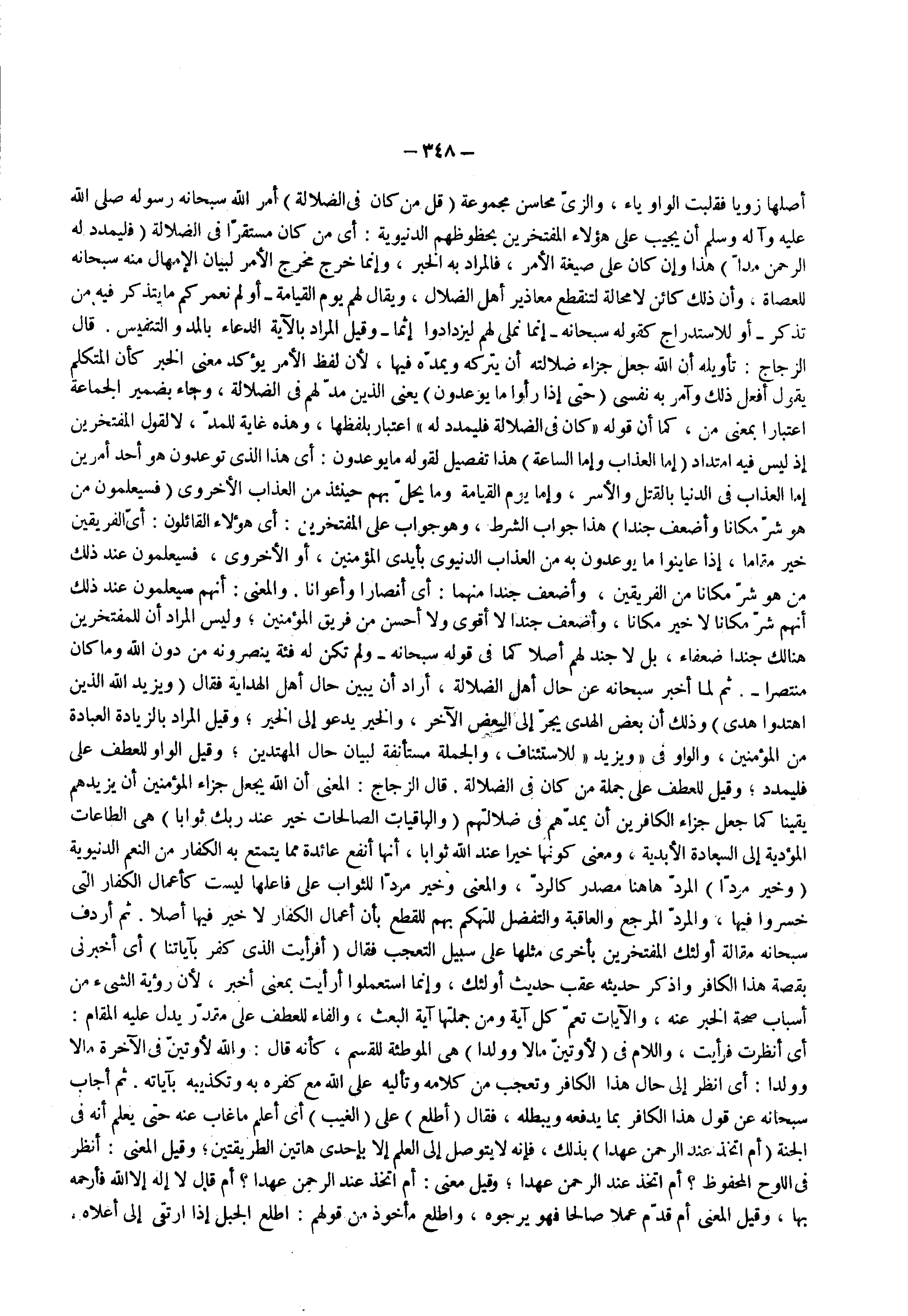 ) قل من كان في الضلالة ( أمر الله سبحانه رسوله ( صلى الله عليه وسلم ) أن يجيب على هؤلاء المفتخرين بحظوظهم الدنيوية أى من كان مستقرا فى الضلالة ) فليمدد له الرحمن مدا ( هذا وإن كان على صيغة الأمر فالمراد به الخبر وإنما خرج مخرج الأمر لبيان الإمهال منه سبحانه للعصاة وأن ذلك كائن لا محالة لتنقطع معاذير أهل الضلال ويقال لهم يوم القيامة ) أولم نعمركم ما يتذكر فيه من تذكر ( أو للاستدراج كقوله سبحانه ) إنما نملي لهم ليزدادوا إثما ( وقيل المراد بالآية الدعاء بالمد والتنفيس قال الزجاج تأويله أن الله جعل جزاء ضلالته أن يتركه ويمده فيها لأن لفظ الأمر يؤكد معنى الخبر كأن المتكلم يقول أفعل ذلك وآمر به نفسي ) حتى إذا رأوا ما يوعدون ( يعني الذين مد لهم فى الضلالة وجاء بضمير الجماعة اعتبارا بمعنى من كما أن قوله ) كان في الضلالة فليمدد له ( اعتبار بلفظها وهذه غاية للمد لا لقول المفتخرين إذ ليس فيه امتداد ) إما العذاب وإما الساعة ( هذا تفصيل لقوله ما يوعدون أى هذا الذى توعدون هو أحد أمرين إما العذاب فى الدنيا بالقتل والأسر وإما يوم القيامة وما يحل بهم حينئذ من العذاب الأخروي ) فسيعلمون من هو شر مكانا وأضعف جندا ( هذا جواب الشرط وهو جواب على المفتخرين أى هؤلاء القائلون أى الفريقين خير مقاما إذا عاينوا ما يوعدون به من العذاب الدنيوي بأيدي المؤمنين أو الأخروي فسيعلمون عند ذلك من هو شر مكانا من الفريقين وأضعف جندا منهما أى أنصارا وأعوانا والمعنى أنهم سيعلمون عند ذلك أنهم شر مكانا لا خير مكانا وأضعف جندا لا أقوى ولا أحسن من فريق المؤمنين وليس المراد أن للمفتخرين هنالك جندا ضعفاء بل لا جند لهم أصلا كما فى قوله سبحانه ) ولم تكن له فئة ينصرونه من دون الله وما كان منتصرا )
