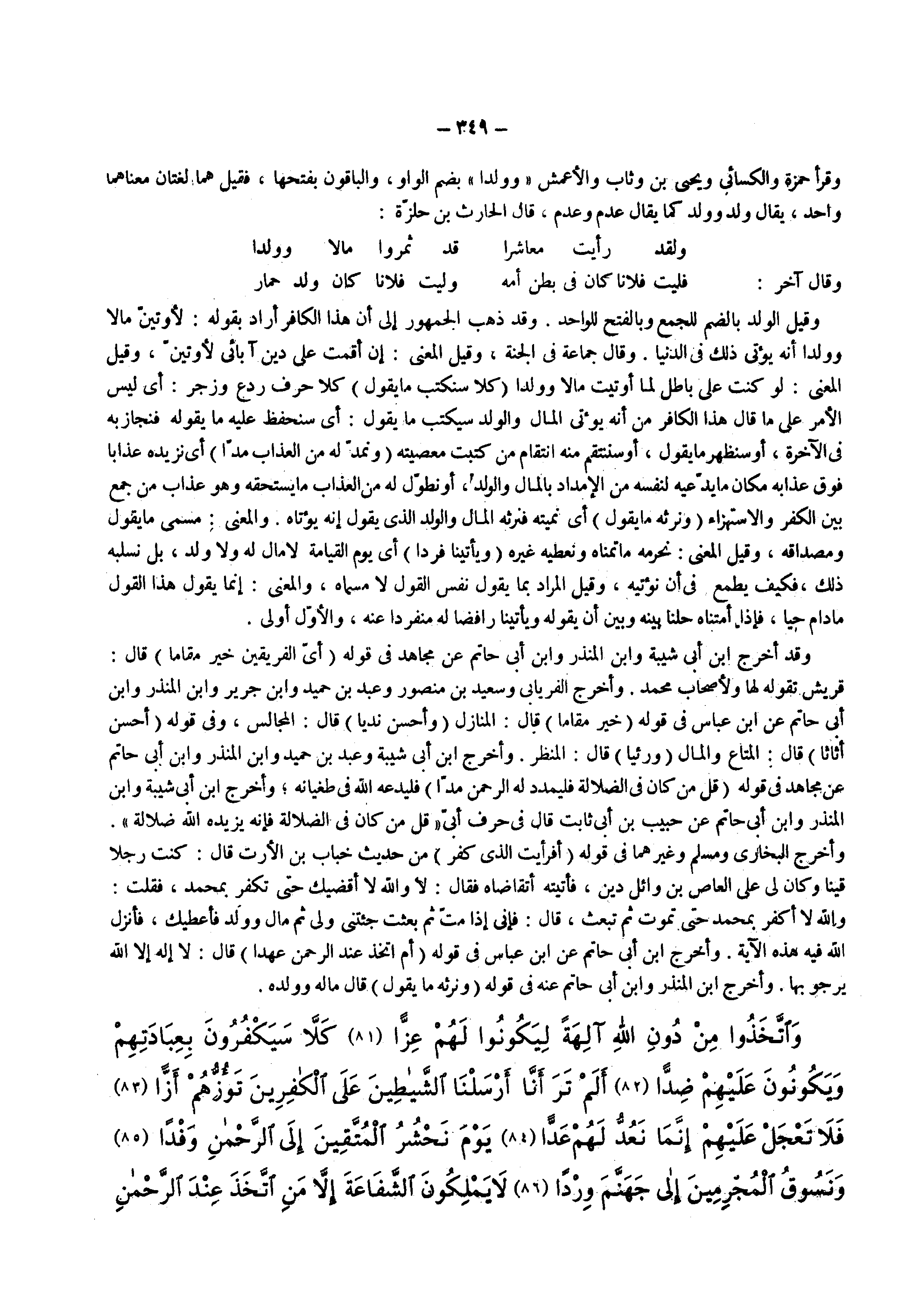 وأخرج البخاري ومسلم وغيرهما فى قوله ) أفرأيت الذي كفر ( من حديث خباب بن الأرت قال كنت رجلا قينا وكان لي على العاص بن وائل دين فأتيته أتقاضاه فقال لا والله لا أقضيك حتى تكفر بمحمد فقلت والله لا أكفر بمحمد حتى تموت ثم تبعث قال فإني إذا مت ثم بعثت جئتني ولي ثم مال وولد فأعطيك فأنزل الله فيه هذه الآية وأخرج ابن أبي حاتم عن ابن عباس فى قوله ) أم اتخذ عند الرحمن عهدا ( قال لا إله إلا الله يرجو بها وأخرج ابن المنذر وابن أبي حاتم عنه فى قوله ) ونرثه ما يقول ( قال ماله وولده
