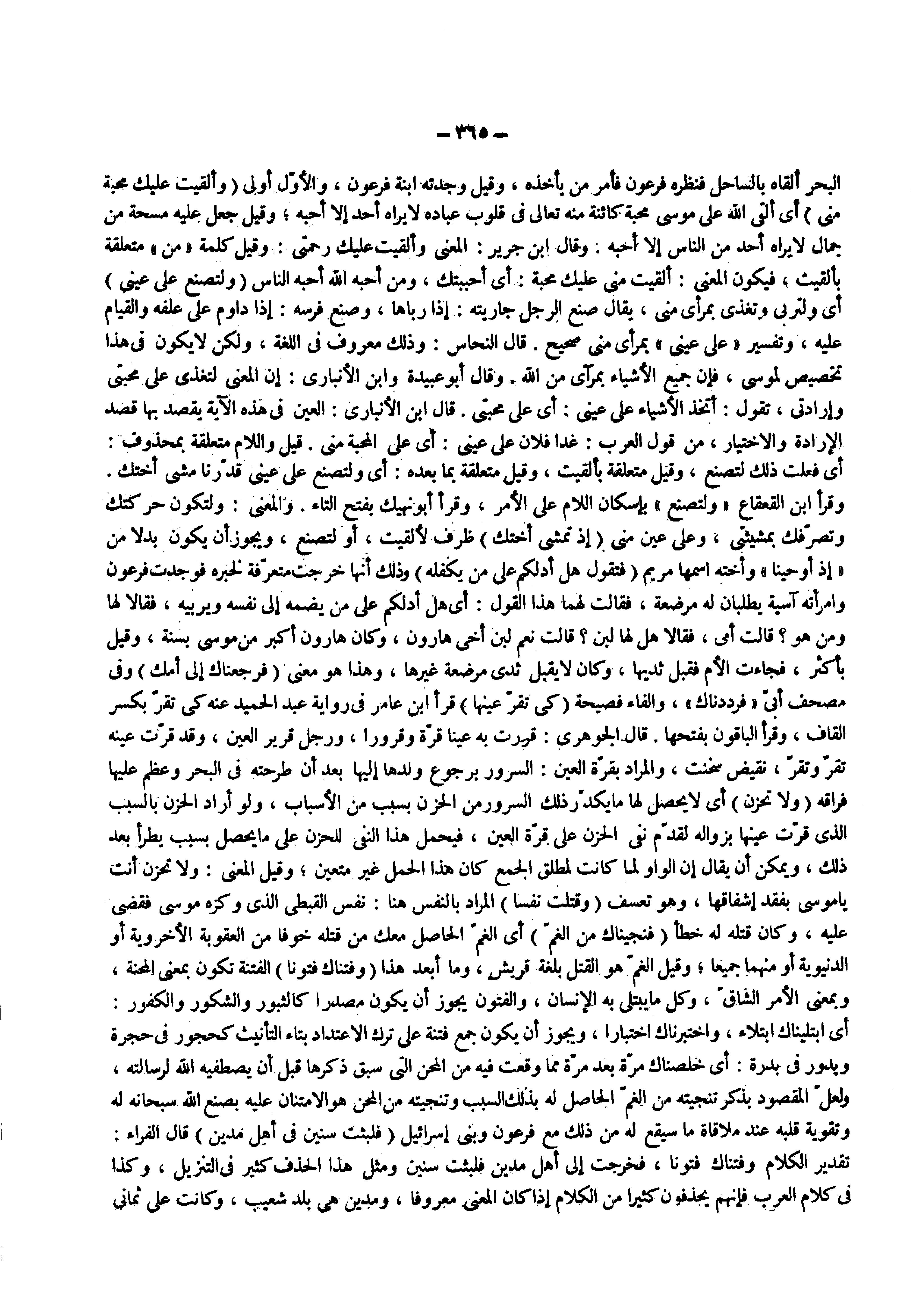 البحر ألقاه بالساحل فنظره فرعون فأمر من يأخذه وقيل وجدته ابنة فرعون والأول أولى ) وألقيت عليك محبة مني ( أى ألقى الله على موسى محبة كائنة منه تعالى فى قلوب عباده لا يراه أحد إلا أحبه وقيل جعل عليه مسحة من جمال لا يراه أحد من الناس إلا أحبه وقال ابن جرير المعنى وألقيت عليك رحمتي وقيل كلمة من متعلقة بألقيت فيكون المعنى ألقيت مني عليك محبة أى أحببتك ومن أحبه الله أحبه الناس ) ولتصنع على عيني ( أى ولتربى وتغذى بمرأى مني يقال صنع الرجل جاريته إذا رباها وصنع فرسه إذا داوم على علفه والقيام عليه وتفسير ) على عيني ( بمرأى مني صحيح قال النحاس وذلك معروف فى اللغة ولكن لا يكون فى هذا تخصيص لموسى فإن جميع الأشياء بمرآى من الله وقال أبو عبيدة وابن الأنباري إن المعنى لتغذى على محبتي وإرادتي تقول أتخذ الأشياء على عيني أى على محبتي قال ابن الأنباري العين فى هذه الآية يقصد بها قصد الإرادة والاختيار من قول العرب غدا فلان على عيني أى على المحبة مني قيل واللام متعلقة بمحذوف أى فعلت ذلك لتصنع وقيل متعلقة بألقيت وقيل متعلقة بما بعده أى ولتصنع على عينى قدرنا مشي أختك وقرأ ابن القعقاع ) ولتصنع ( بإسكان اللام على الأمر وقرأ أبونهيك بفتح التاء والمعنى ولتكون حركتك وتصرفك بمشيئتي وعلى عين مني