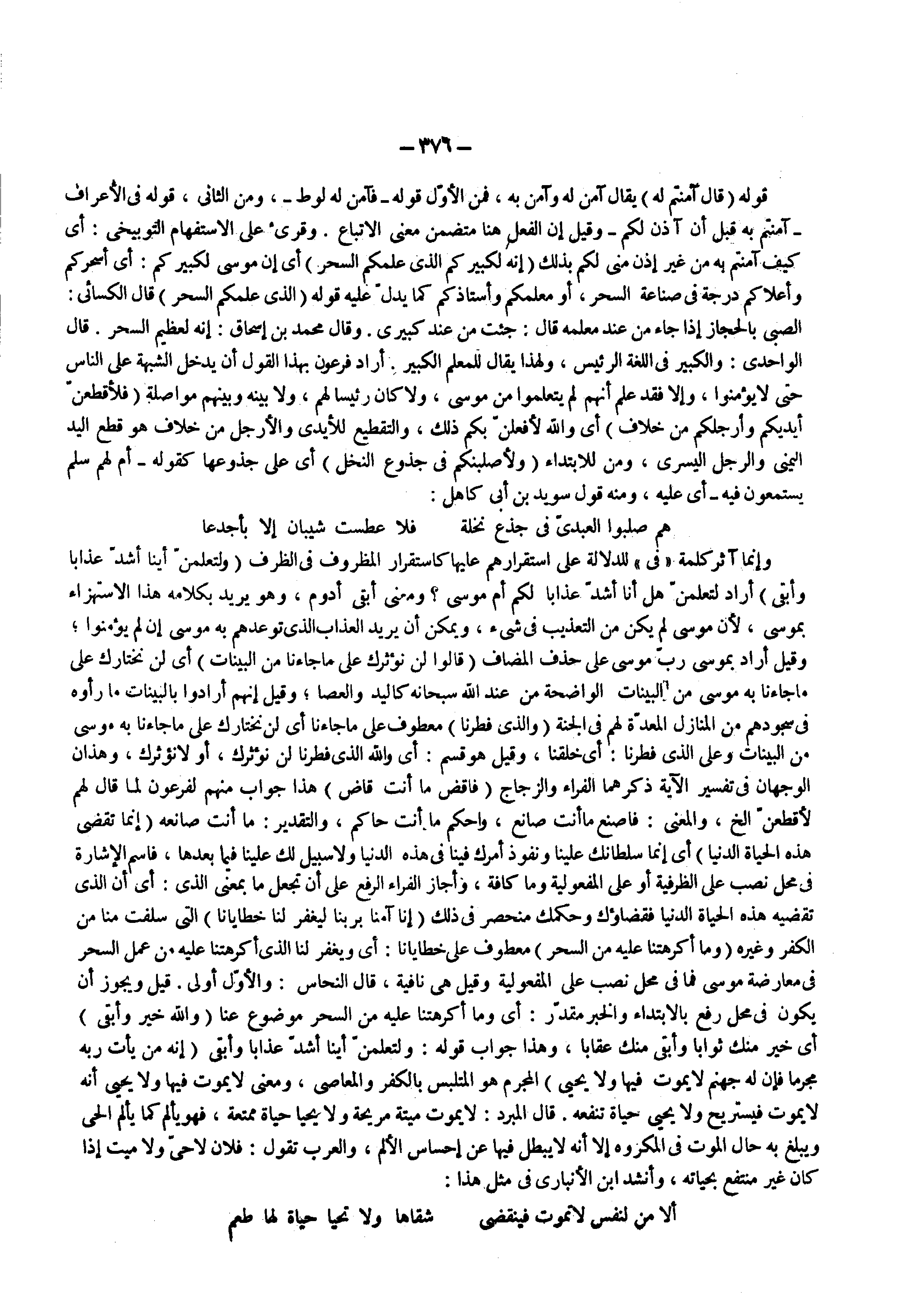 وإنما آثر كلمة ) في ( للدلالة على استقرارهم عليها كاستقرار المظروف فى الظرف ) ولتعلمن أينا أشد عذابا وأبقى ( أراد لتعلمن هل أنا أشد عذابا لكم أم موسى ومعنى أبقى أدوم وهو يريد بكلامه هذا الاستهزاء بموسى لأن موسى لم يكن من التعذيب فى شئ ويمكن أن يريد العذاب الذى توعدهم به موسى إن لم يؤمنوا وقيل أراد بموسى رب موسى على حذف المضاف