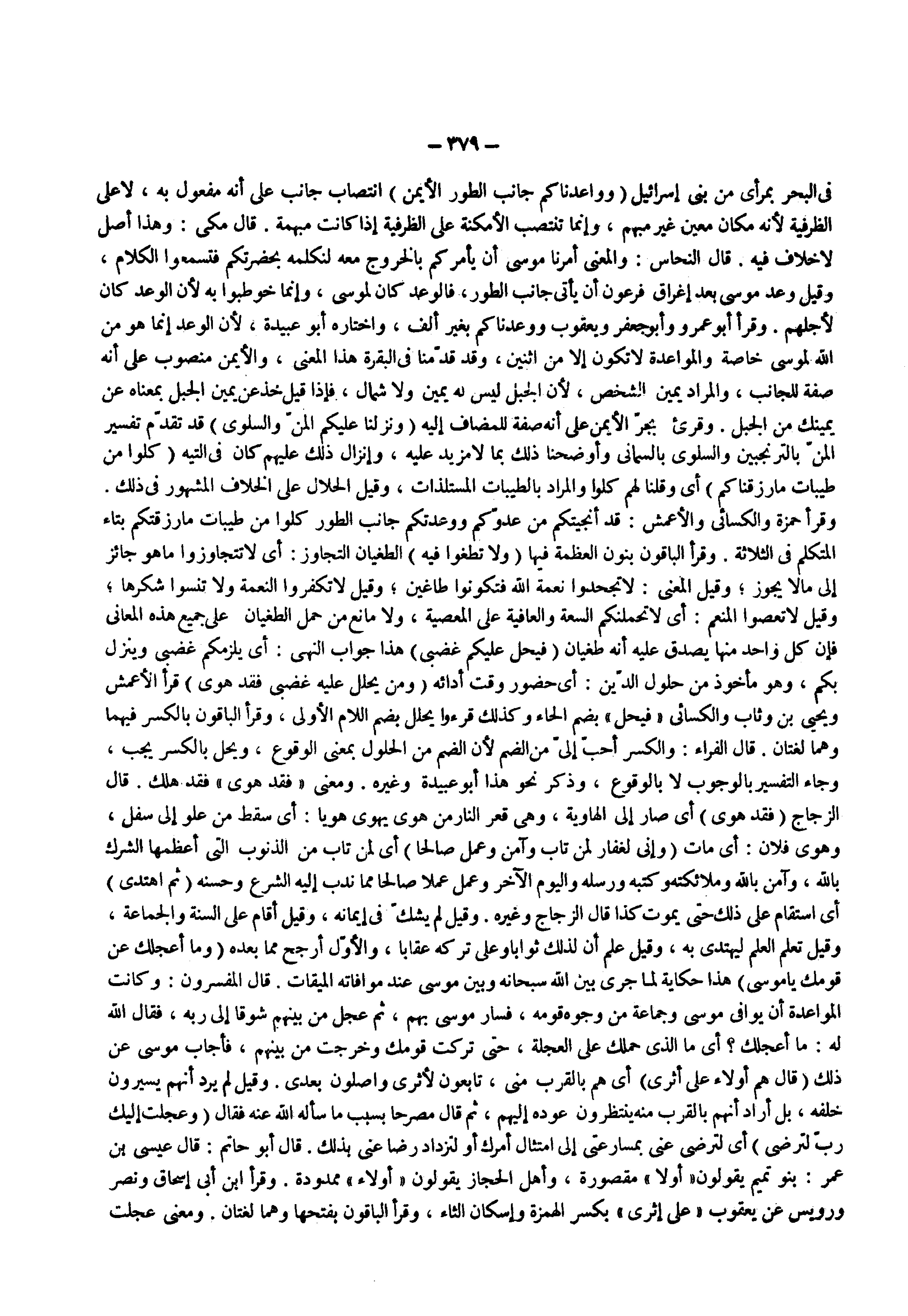فى البحر بمرأى من بني إسرائيل ) وواعدناكم جانب الطور الأيمن ( انتصاب جانب على أنه مفعول به لا على الظرفيه لأنه مكان معين غير مبهم وإنما تنتصب الأمكنة على الظرفية إذا كانت مبهمة قال مكي وهذا أصل لا خلاف فيه قال النحاس والمعنى أمرنا موسى أن يأمركم بالخروج معه لنكلمه بحضرتكم فتسمعوا الكلام وقيل وعد موسى بعد إغراق فرعون أن يأتي جانب الطور فالوعد كان لموسى وإنما خوطبوا به لأن الوعد كان لأجلهم وقرأ أبو عمرو وأبو جعفر ويعقوب ووعدناكم بغير ألف واختاره أبو عبيدة لأن الوعد إنما هو من الله لموسى خاصة والمواعدة لا تكون إلا من اثنين وقد قدمنا فى البقرة هذا المعنى والأيمن منصوب على أنه صفة للجانب والمراد يمين الشخص لأن الجبل ليس له يمين ولا شمال فإذا قيل خذ عن يمين الجبل بمعناه عن يمينك من الجبل وقرئ بجر الأيمن على أنه صفة للمضاف إليه ) ونزلنا عليكم المن والسلوى ( قد تقدم تفسير المن بالترنجبين والسلوى بالسماني وأوضحنا ذلك بما لا مزيد عليه وإنزال ذلك عليهم كان فى التيه