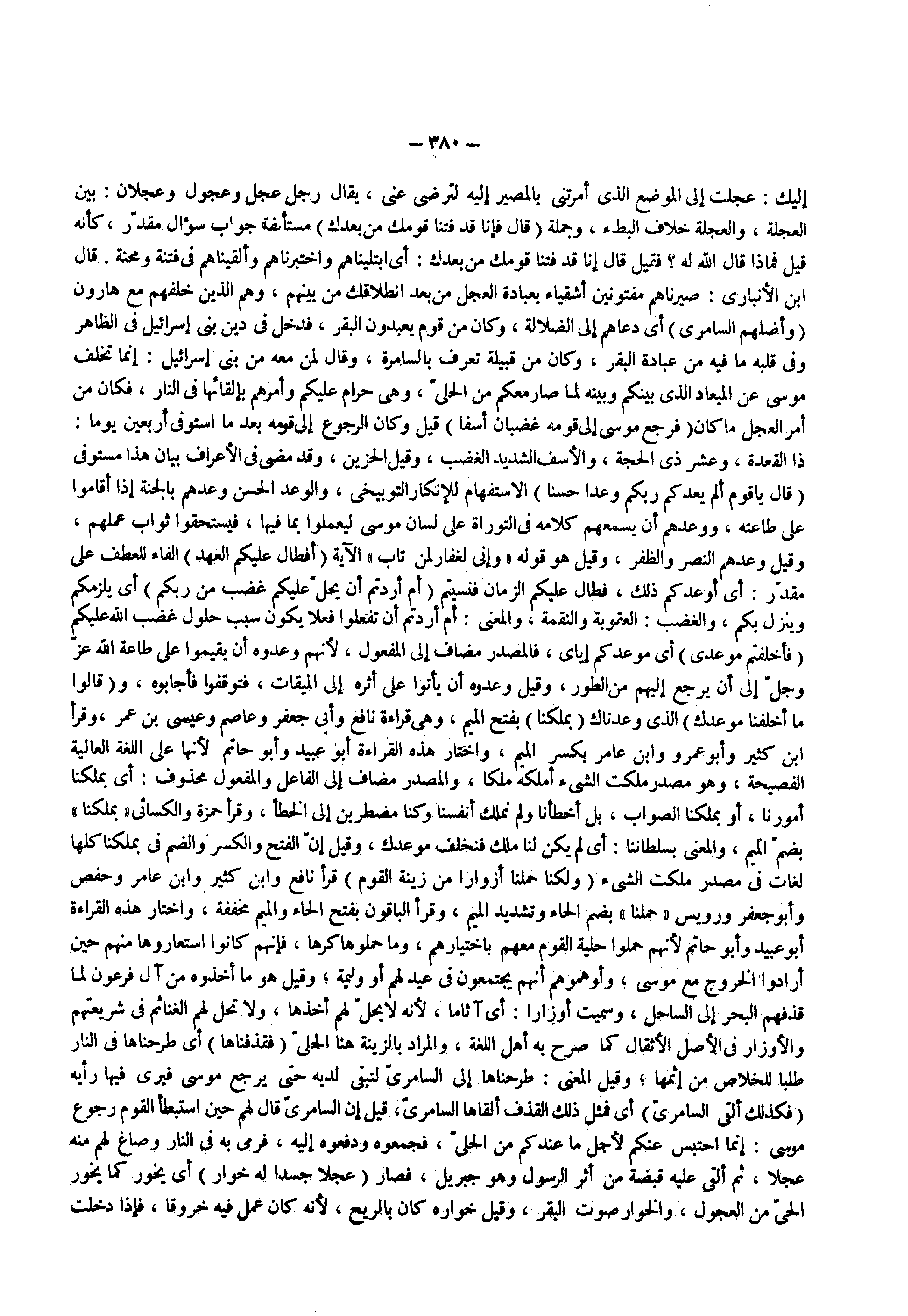 ) فرجع موسى إلى قومه غضبان أسفا ( قيل وكان الرجوع إلى قومه بعد ما استوفى أربعين يوما ذا القعدة وعشر ذي الحجة والأسف الشديد الغضب وقيل الحزين وقد مضى فى الأعراف بيان هذا مستوفى ) قال يا قوم ألم يعدكم ربكم وعدا حسنا ( الاستفهام للإنكار التوبيخي والوعد الحسن وعدهم بالجنة إذا أقاموا على طاعته ووعدهم أن يسمعهم كلامه فى التوراة على لسان موسى ليعملوا بما فيها فيستحقوا ثواب عملهم وقيل وعدهم النصر والظفر وقيل هو قوله ) وإني لغفار لمن تاب ( الآية ) أفطال عليكم العهد ( الفاء للعطف على مقدر أى أوعدكم ذلك فطال عليكم الزمان فنسيتم ) أم أردتم أن يحل عليكم غضب من ربكم ( أى يلزمكم وينزل بكم والغضب العقوبة والنقمة والمعنى أم أردتم أن تفعلوا فعلا يكون سبب حلول غضب الله عليكم ) فأخلفتم موعدي ( أي موعدكم إياي فالمصدر مضاف إلى المفعول لأنهم وعدوه أن يقيموا على طاعة الله عز وجل إلى أن يرجع إليهم من الطور وقيل وعدوه أن يأتوا على أثره إلى الميقات
