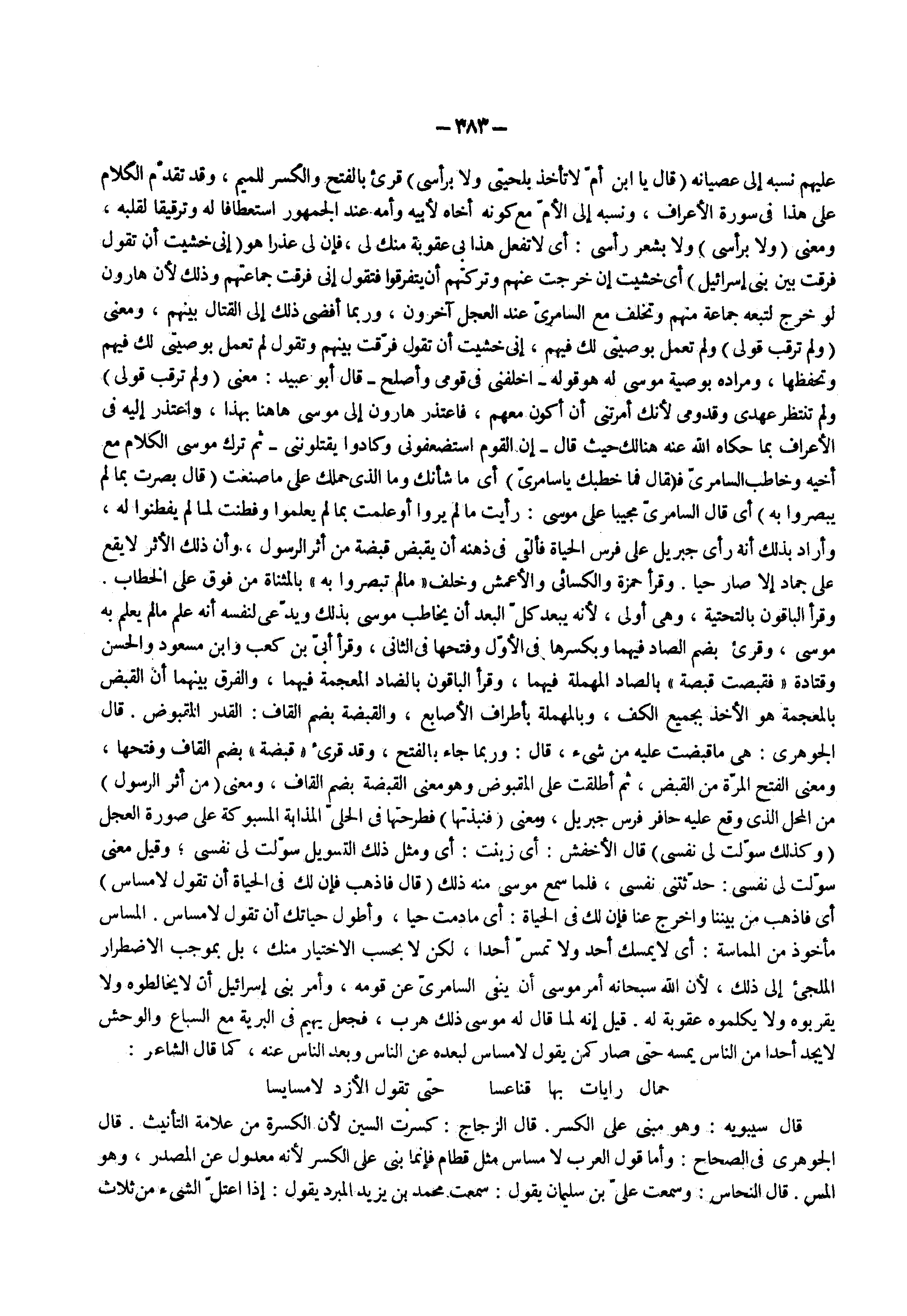 ) قال يا ابن أم لا تأخذ بلحيتي ولا برأسي ( قرئ بالفتح والكسر للميم وقد تقدم الكلام على هذا فى سورة الأعراف ونسبه إلى الأم مع كونه أخاه لأبيه وأمه عند الجمهور استعطافا له وترقيقا لقلبه ومعنى ) ولا برأسي ( ولا بشعر رأسي أى لا تفعل هذا بى عقوبة منك لي فإن لى عذرا هو ) إني خشيت أن تقول فرقت بين بني إسرائيل ( أى خشيت إن خرجت عنهم وتركتهم أن يتفرقوا فتقول إنى فرقت جماعتهم وذلك لأن هارون لو خرج لتبعه جماعة منهم وتخلف مع السامري عند العجل آخرون وربما أفضى ذلك إلى القتال بينهم ومعنى ) ولم ترقب قولي ( ولم تعمل بوصيتي لك فيهم إني خشيت أن تقول فرقت بينهم وتقول لم تعمل بوصيتي لك فيهم وتحفظها ومراده بوصية موسى له هو قوله ) اخلفني في قومي وأصلح ( قال أبو عبيد معنى ) ولم ترقب قولي ( ولم تنتظر عهدى وقدومي لأنك أمرتني أن أكون معهم فاعتذر هارون إلى موسى ها هنا بهذا واعتذر إليه فى الأعراف بما حكاه الله عنه هنالك حيث قال ) إن القوم استضعفوني وكادوا يقتلونني )