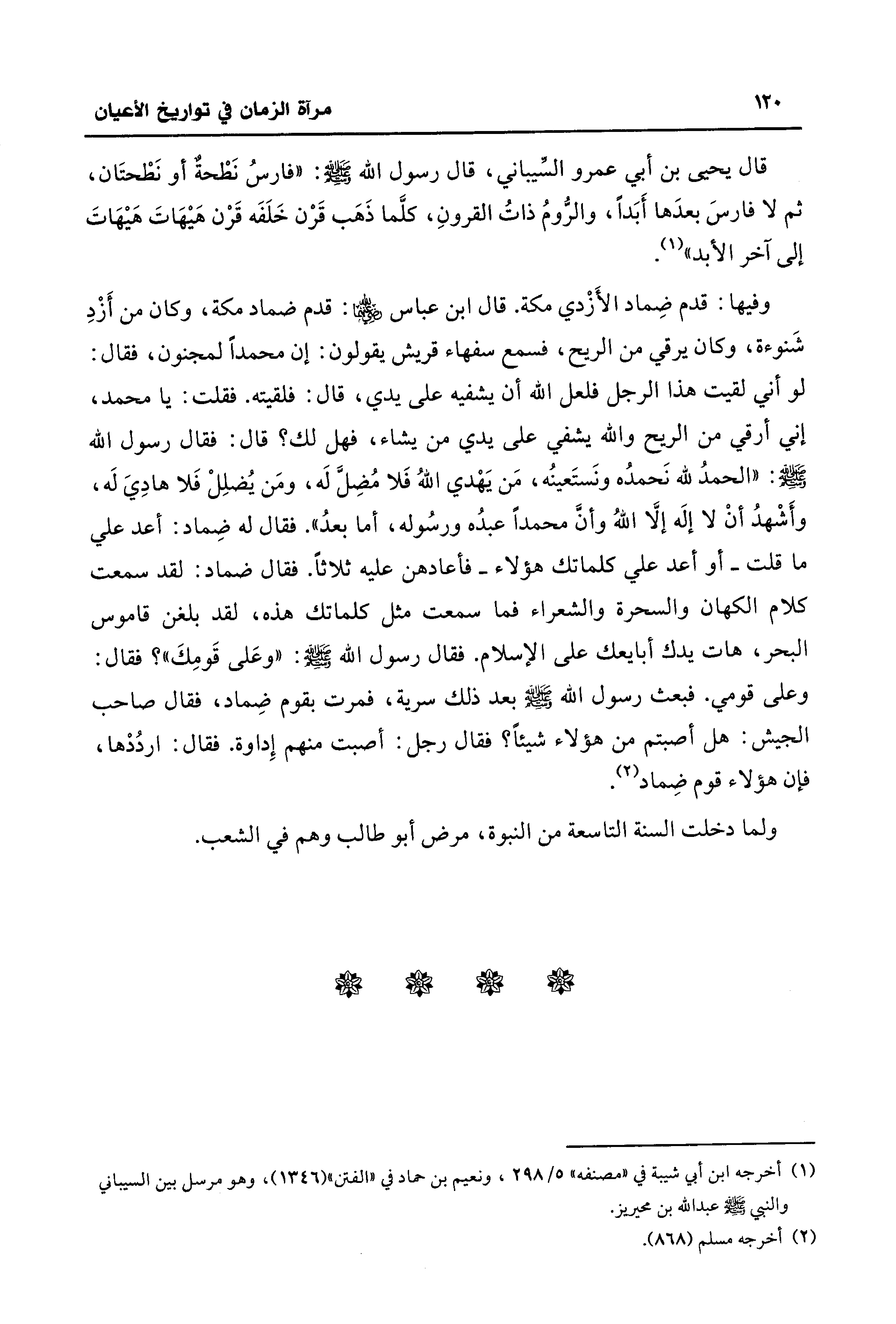 وفيها: قدم ضِماد الأَزْدي مكة. قال ابن عباس - رضي الله عنهما -: قدم ضماد مكة، وكان من أَزْدِ شَنوءة، وكان يرقي من الريح، فسمع سفهاء قريش يقولون: إن محمدًا لمجنون، فقال: لو أني لقيت هذا الرجل فلعل الله أن يشفيه على يدي، قال: فلقيته. فقلت: يا محمد، إني أرقي من الريح والله يشفي على يدي من يشاء، فهل لك؟ قال: فقال رسول الله - صلى الله عليه وسلم -: "الحمدُ لله نَحمدُه ونَستَعينُه، مَن يَهْدي اللهُ فلا مُضِل له، ومَن يضلل فلا هاديَ لَه، أَشْهدُ أنْ لا إلَه إلَّا اللهُ وأنَّ محمدًا عبدُه ورسُوله، أما بعدُ". فقال له ضِماد: أعد علي ما قلت -أو أعد علي كلماتك هؤلاء- فأعادهن عليه ثلاثًا. فقال ضماد: لقد سمعت كلام الكهان والسحرة والشعراء فما سمعت مثل كلماتك هذه، لقد بلغن قاموس البحر، هات يدك أبايعك على الإسلام. فقال رسول الله - صلى الله عليه وسلم -: "وعَلى قَومِكَ"؟ فقال: وعلى قومي. فبعث رسول الله - صلى الله عليه وسلم - بعد ذلك سرية، فمرت بقوم ضِماد، فقال صاحب الجيش: هل أصبتم من هؤلاء شيئًا؟ فقال رجل: أصبت منهم إِداوة. فقال: اردُدها، فإن هؤلاء قوم ضِماد (¬2).
