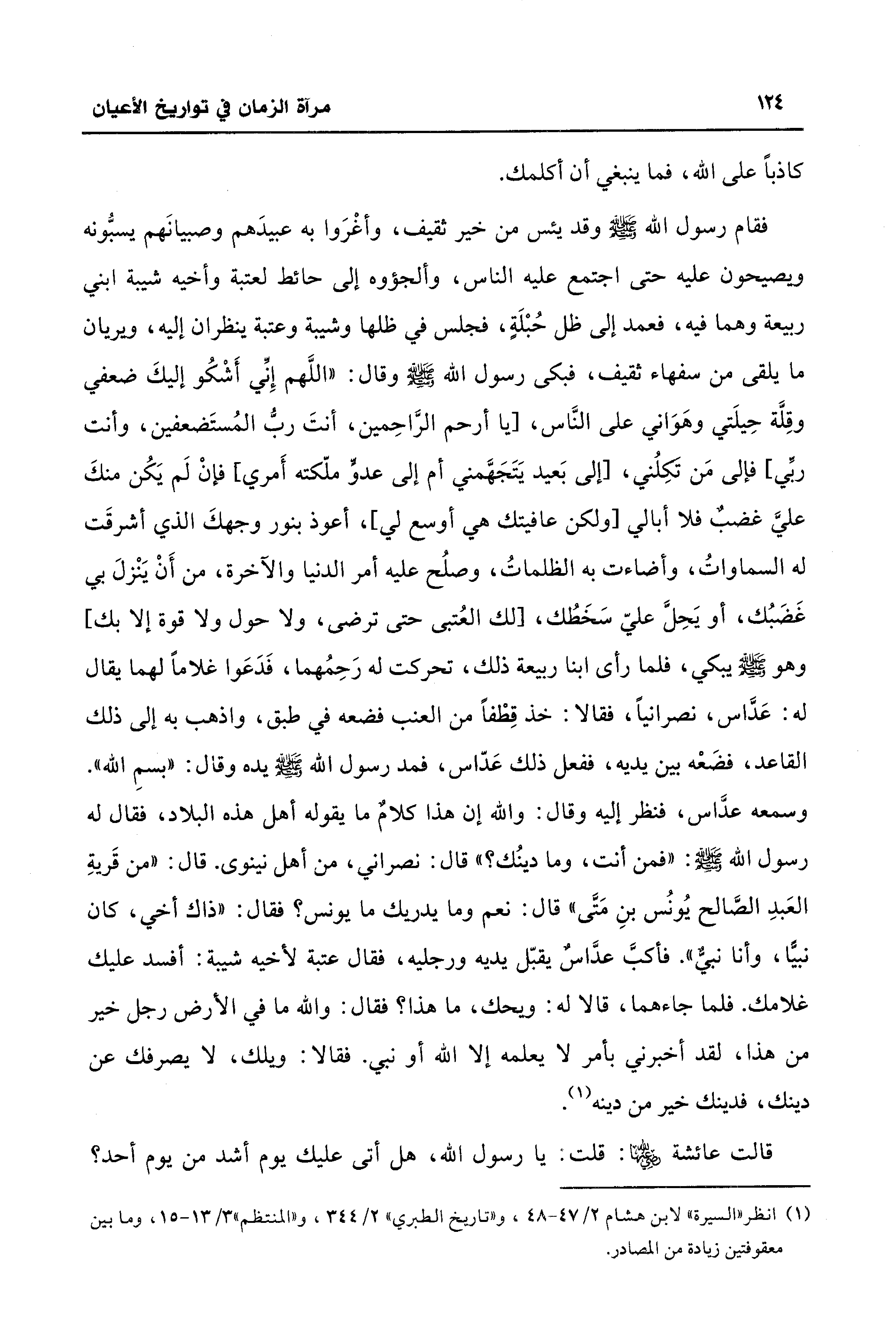 فقام رسول الله - صلى الله عليه وسلم - وقد يئس من خير ثقيف، وأغْرَوا به عبيدَهم وصبيانَهم يسبُّونه ويصيحون عليه حتى اجتمع عليه الناس، وألجؤوه إلى حائط لعتبة وأخيه شيبة ابني ربيعة وهما فيه، فعمد إلى ظل حُبْلَةٍ، فجلس في ظلها وشيبة وعتبة ينظران إليه، ويريان ما يلقى من سفهاء ثقيف، فبكى رسول الله - صلى الله عليه وسلم - وقال: "اللَّهم إِنِّي أَشْكُو إليكَ ضعفي وقِلَّة حِيلَتي وهوَاني على النَّاس، [يا أرحم الرَّاحِمين، أنتَ ربُّ المُستَضعفين، وأنت ربِّي، فإلى مَن تكِلُني، [إلى بَعيد يَتَجَهَّمني أم إلى عدوٍّ ملّكته أَمري] فإنْ لَم يَكُن منكَ عليَّ غضبٌ فلا أبالي [ولكن عافيتك هي أوسع لي]، أعوذ بنور وجهكَ الذي أشرقَت له السماواتُ، وأضاءت به الظلماتُ، وصلُح عليه أمر الدنيا والآخرة، من أَنْ يَنْزلَ بي غَضَبُك، أو يَحِل عليّ سَخَطُك، [لك العُتبى حتى ترضى، ولا حول ولا قوة إلا بك] وهو - صلى الله عليه وسلم - يبكي، فلما رأى ابنا ربيعة ذلك، تحركت له رَحِمُهما، فَدَعَوا غلامًا لهما يقال له: عَدَّاس، نصرانيًّا، فقالا: خذ قِطْفًا من العنب فضعه في طبق، واذهب به إلى ذلك القاعد، فضَعه بين يديه، ففعل ذلك عَدّاس، فمد رسول الله - صلى الله عليه وسلم - يده وقال: "بسمِ الله". وسمعه عدَّاس، فنظر إليه وقالا: والله إن هذا كلام ما يقوله أهل هذه البلاد، فقال له رسول الله - صلى الله عليه وسلم -: "فمن أنت، وما دينُك؟ " قال: نصراني، من أهل نينوى. قال: "من قَريةِ العَبدِ الصَّالح يُونُس بنِ مَتَّى" قال: نعم وما يدريك ما يونس؟ فقال: "ذاك أخي، كان نبيًّا، وأنا نبيٌّ". فأكبَّ عدَّاسٌ يقبِّل يديه ورجليه، فقال عتبة لأخيه شيبة: أفسد عليك غلامك. فلما جاءهما، قالا له: ويحك، ما هذا؟ فقال: والله ما في الأرض رجل خير من هذا، لقد أخبرني بأمر لا يعلمه إلا الله أو نبي. فقالا: ويلك، لا يصرفك عن دينك، فدينك خير من دينه (¬1).