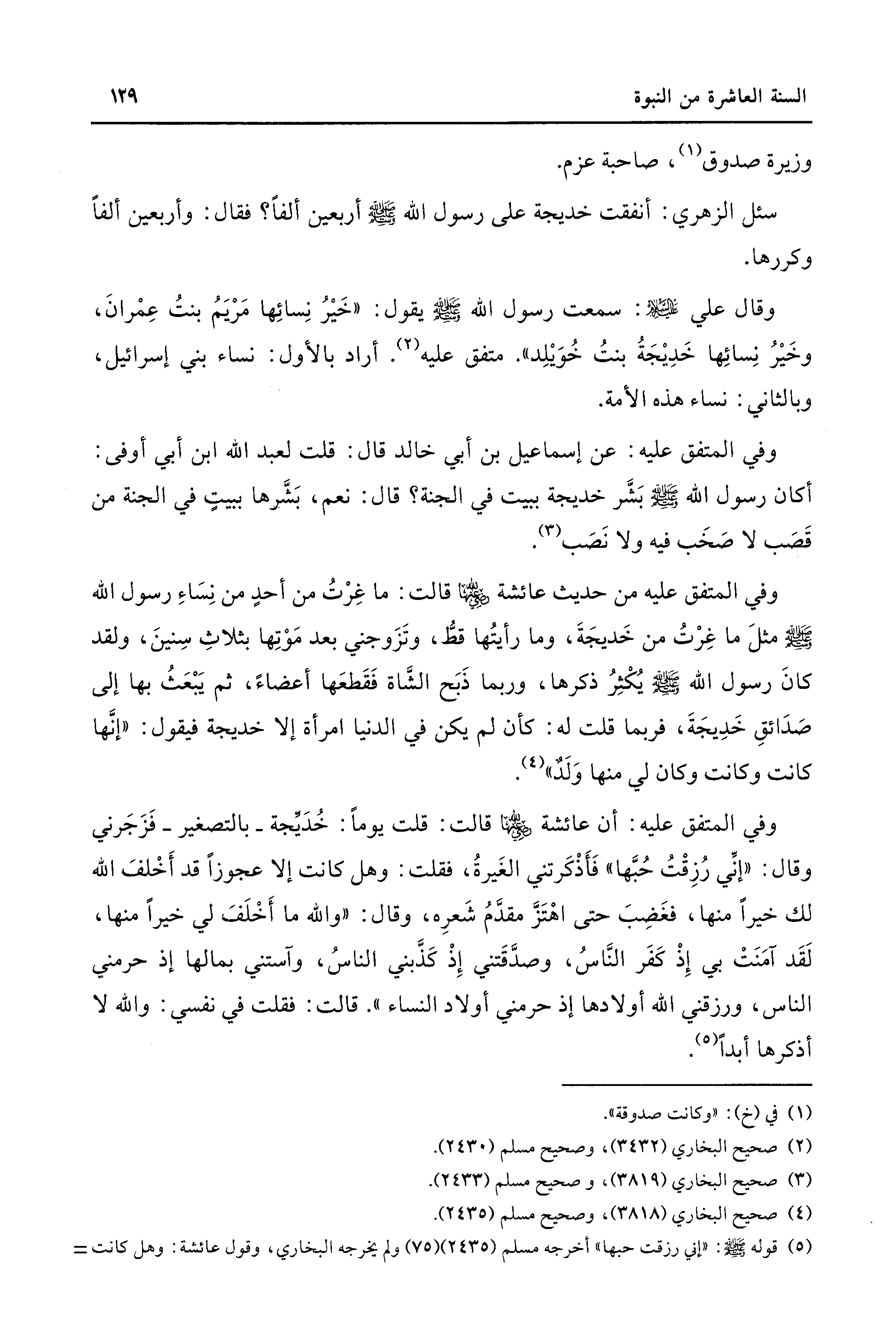 وفي المتفق عليه من حديث عائشة - رضي الله عنهما - قالت: ما غرتُ من أحدٍ من نِسَاءِ رسول الله - صلى الله عليه وسلم - مثلَ ما غِرتُ من خَديجَةَ، وما رأيتُها قطُّ، وتَزَوجني بعد مَوْتِها بثلاثِ سِنينَ، ولقد كانَ رسول الله - صلى الله عليه وسلم - يُكْثِرُ ذكرها، وربما ذَبَح الشَّاة فَقَطعَها أعضاءً، ثم يَبْعَثُ بها إلى صَدَائقِ خَدِيجَةَ، فربما قلت له: كأن لم يكن في الدنيا امرأة إلا خديجة فيقول: "إنَّها كانت وكانت وكان في منها وَلدٌ" (¬4).