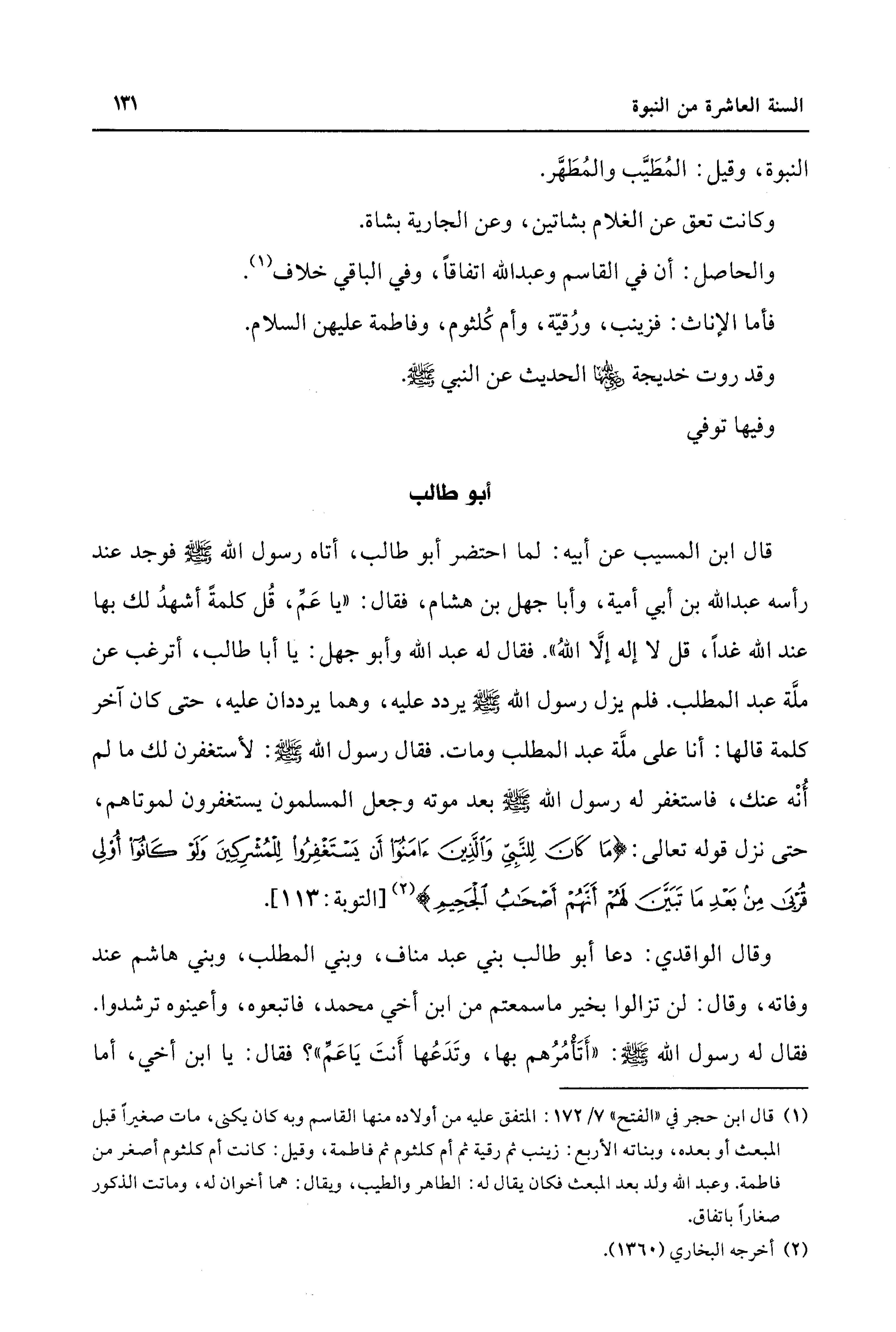 قال ابن المسيب عن أبيه: لما احتضر أبو طالب، أتاه رسول الله - صلى الله عليه وسلم - فوجد عند رأسه عبد الله بن أبي أمية، وأبا جهل بن هشام، فقال: "يا عَمِّ، قُل كلمةً أشهدُ لك بها عند الله غدًا، قل لا إله إلا اللهُ". فقال له عبد الله وأبو جهل: يا أبا طالب، أترغب عن ملَّة عبد المطلب. فلم يزل رسول الله - صلى الله عليه وسلم - يردد عليه، وهما يرددان عليه، حتى كان آخر كلمة قالها: أنا على ملَّة عبد المطلب ومات. فقال رسول الله - صلى الله عليه وسلم -: لأستغفرن لك ما لم أُنْه عنك، فاستغفر له رسول الله - صلى الله عليه وسلم - بعد موته وجعل المسلمون يستغفرون لموتاهم، حتى نزل قوله تعالى: {مَا كَانَ لِلنَّبِيِّ وَالَّذِينَ آمَنُوا أَنْ يَسْتَغْفِرُوا لِلْمُشْرِكِينَ وَلَوْ كَانُوا أُولِي قُرْبَى مِنْ بَعْدِ مَا تَبَيَّنَ لَهُمْ أَنَّهُمْ أَصْحَابُ الْجَحِيمِ} (¬2) [التوبة: 113].