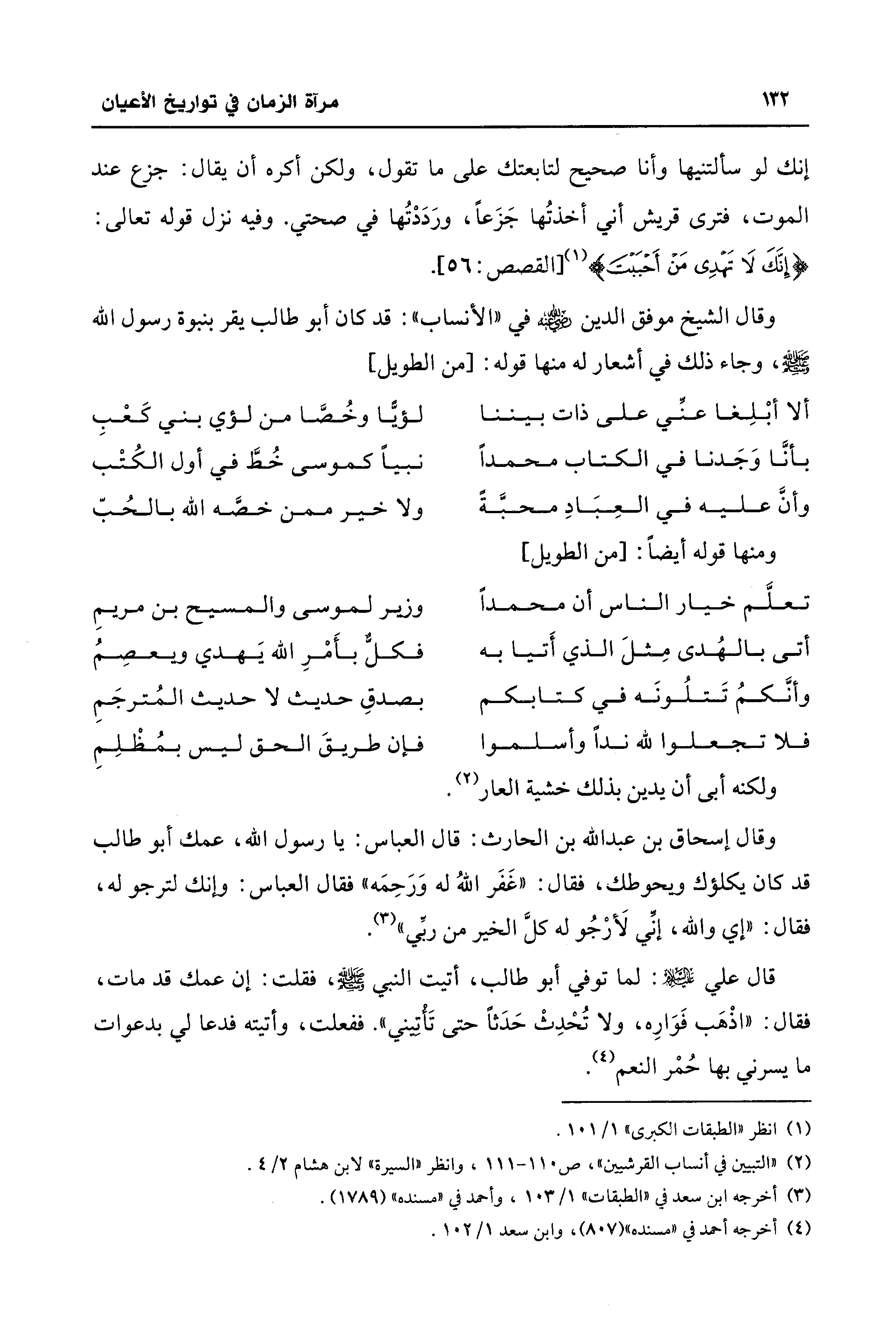 وقال الشيخ موفق الدين - رضي الله عنه - في "الأنساب": قد كان أبو طالب يقر بنبوة رسول الله - صلى الله عليه وسلم -، وجاء ذلك في أشعار له منها قوله: [من الطويل]