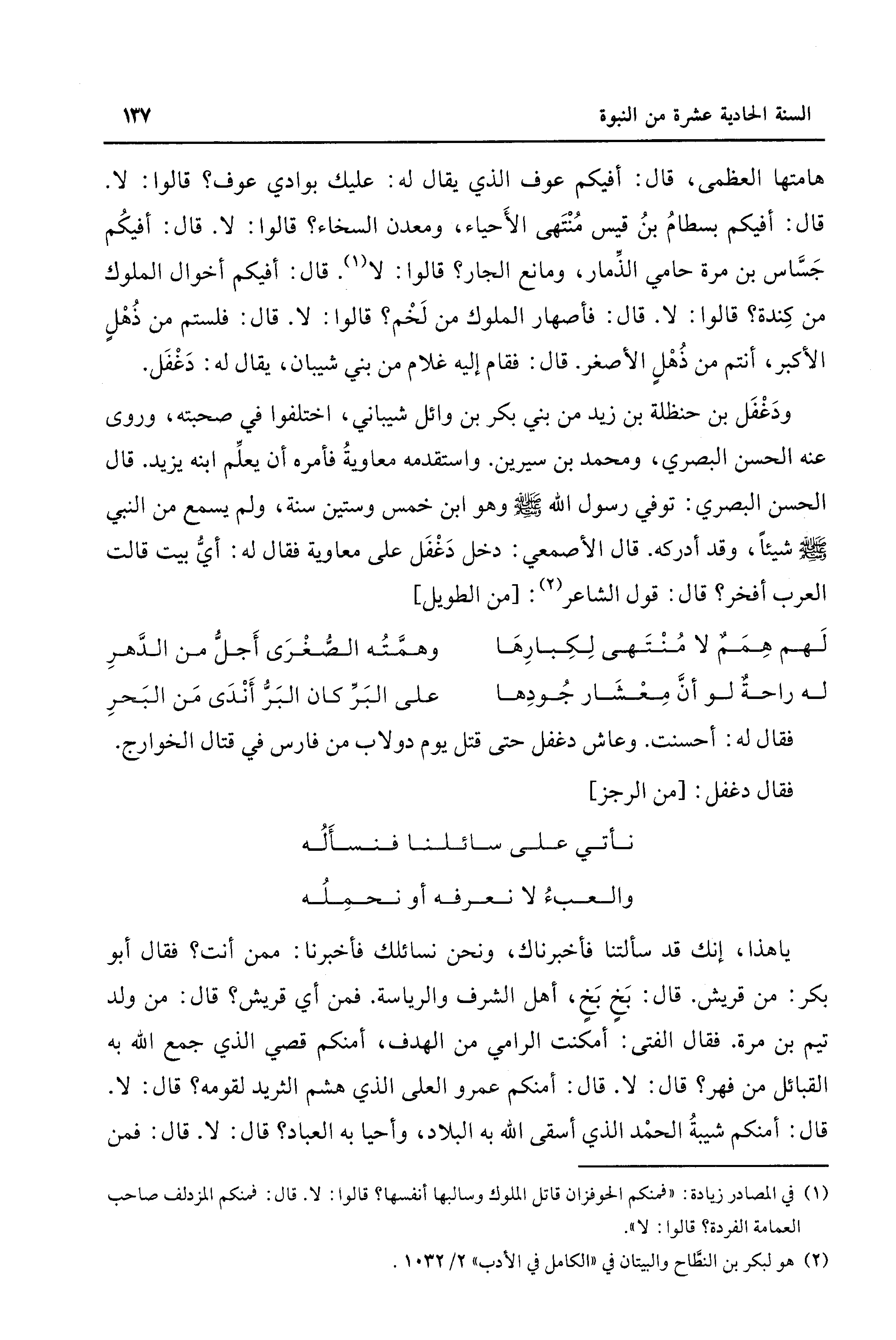 ودَغْفَل بن حنظلة بن زيد من بني بكر بن وائل شيباني، اختلفوا في صحبته، وروى عنه الحسن البصري، ومحمد بن سيرين. واستقدمه معاويةُ فأمره أن يعلِّم ابنه يزيد. قال الحسن البصري: توفي رسول الله - صلى الله عليه وسلم - وهو ابن خمس وستين سنة، ولم يسمع من النبي - صلى الله عليه وسلم - شيئًا، وقد أدركه. قال الأصمعي: دخل دَغْفَل على معاوية فقال له: أيُّ بيت قالت العرب أفخر؟ قال: قول الشاعر (¬2): [من الطويل]