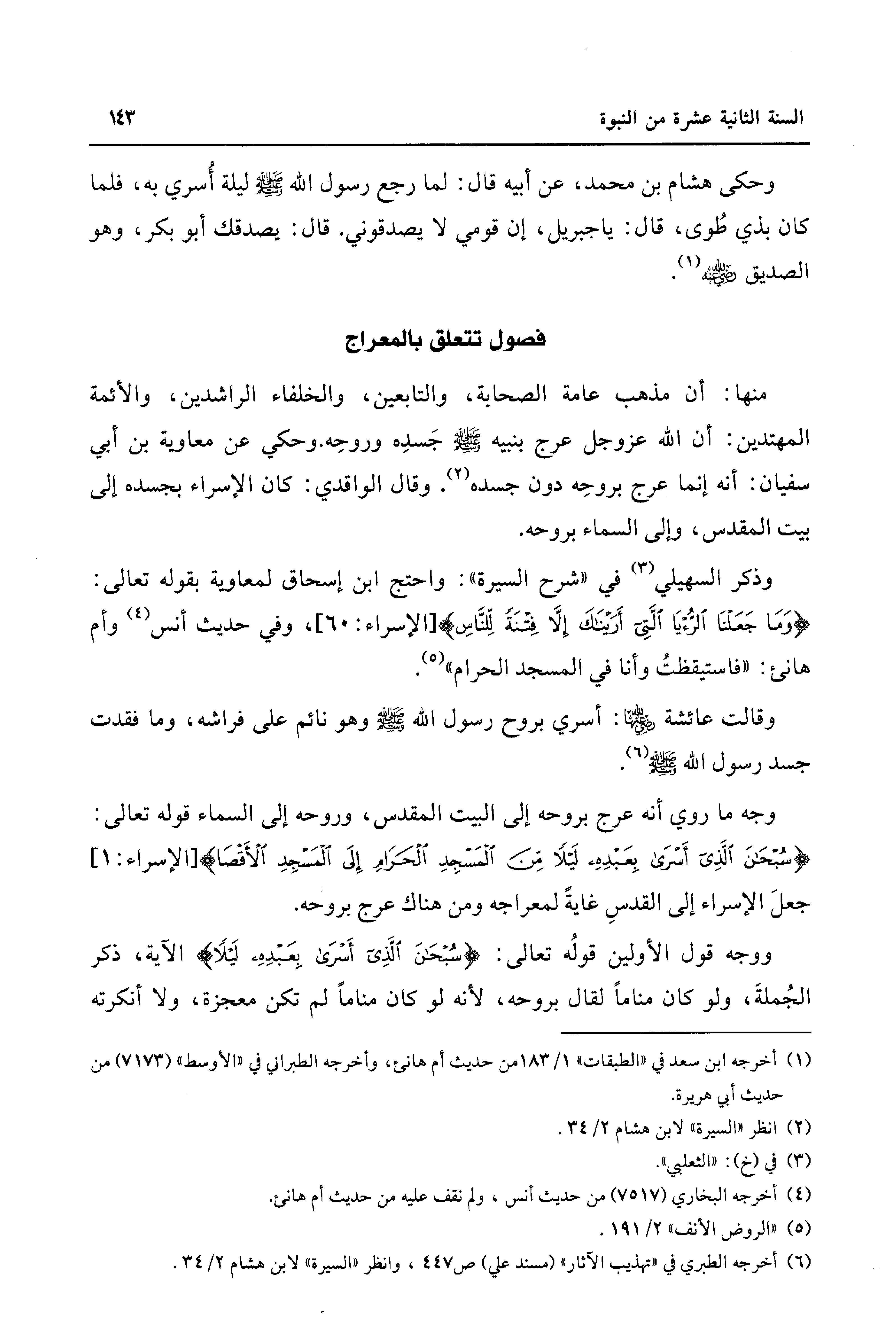 منها: أن مذهب عامة الصحابة، والتابعين، والخلفاء الراشدين، والأئمة المهتدين: أن الله عزَّ وجلَّ عرج بنبيه - صلى الله عليه وسلم - جَسدِه وروحِه. وحكي عن معاوية بن أبي سفيان: أنه إنما عرج بروحِه دون جسده (¬2). وقال الواقدي: كان الإسراء بجسده إلى بيت المقدس، وإلى السماء بروحه.