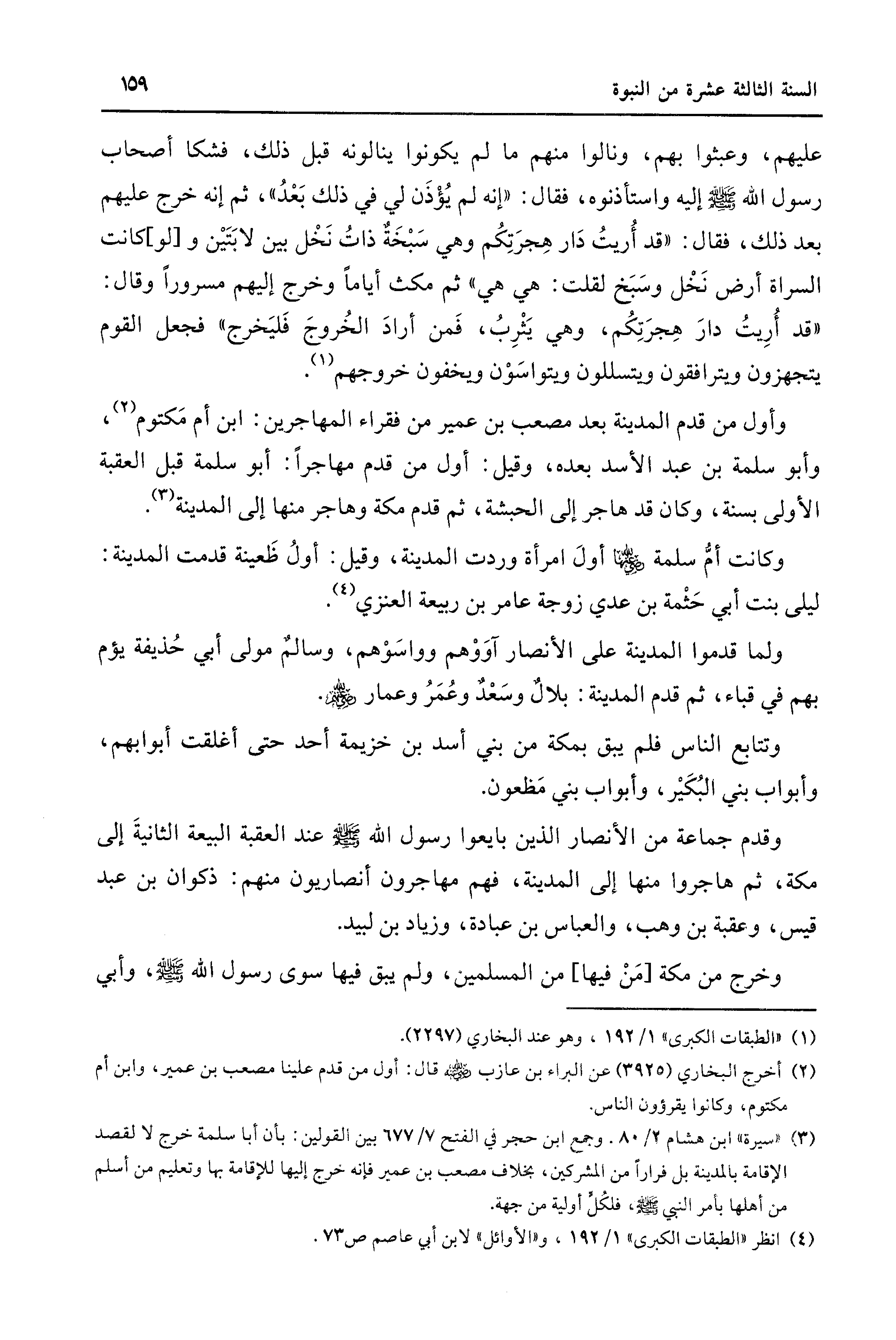 (¬3) "سيرة" ابن هشام 2/ 80. وجمع ابن حجر في الفتح 7/ 677 بين القولين: بأن أبا سلمة خرج لقصد الإقامة بالمدينة بل فرارًا من المشركين، بخلاف مصعب بن عمير فإنه خرج إليها للإقامة بها وتعليم من أسلم من أهلها بأمر النبي - صلى الله عليه وسلم -، فلكُلٍّ أولية من جهة.