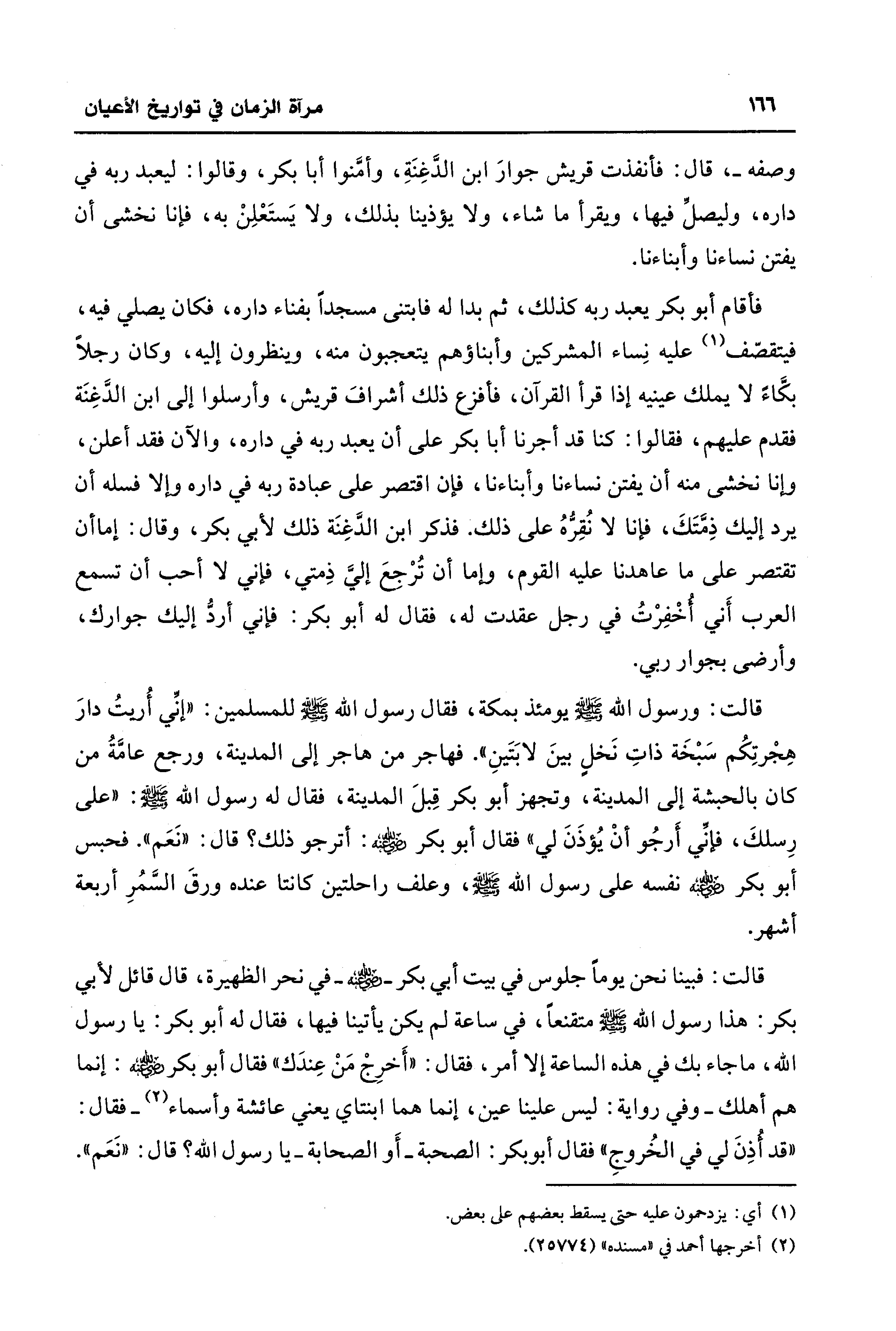 قالت: فبينا نحن يومًا جلوس في بيت أبي بكر - رضي الله عنه - في نحر الظهيرة، قال قائل لأبي بكر: هذا رسول الله - صلى الله عليه وسلم - متقنعًا، في ساعة لم يكن يأتينا فيها، فقال له أبو بكر: يا رسول الله، ما جاء بك في هذه الساعة إلا أمر، فقال: "أَخرِجْ مَنْ عِندَك" فقال أبو بكر - رضي الله عنه -: إنما هم أهلك -وفي رواية: ليس علينا عين، إنما هما ابنتاي يعني عائشة وأسماء (¬2) - فقال: "قد أُذِنَ لي في الخُروجِ" فقال أبو بكر: الصحبة -أَو الصحابة- يا رسول الله؟ قال: "نَعَم".