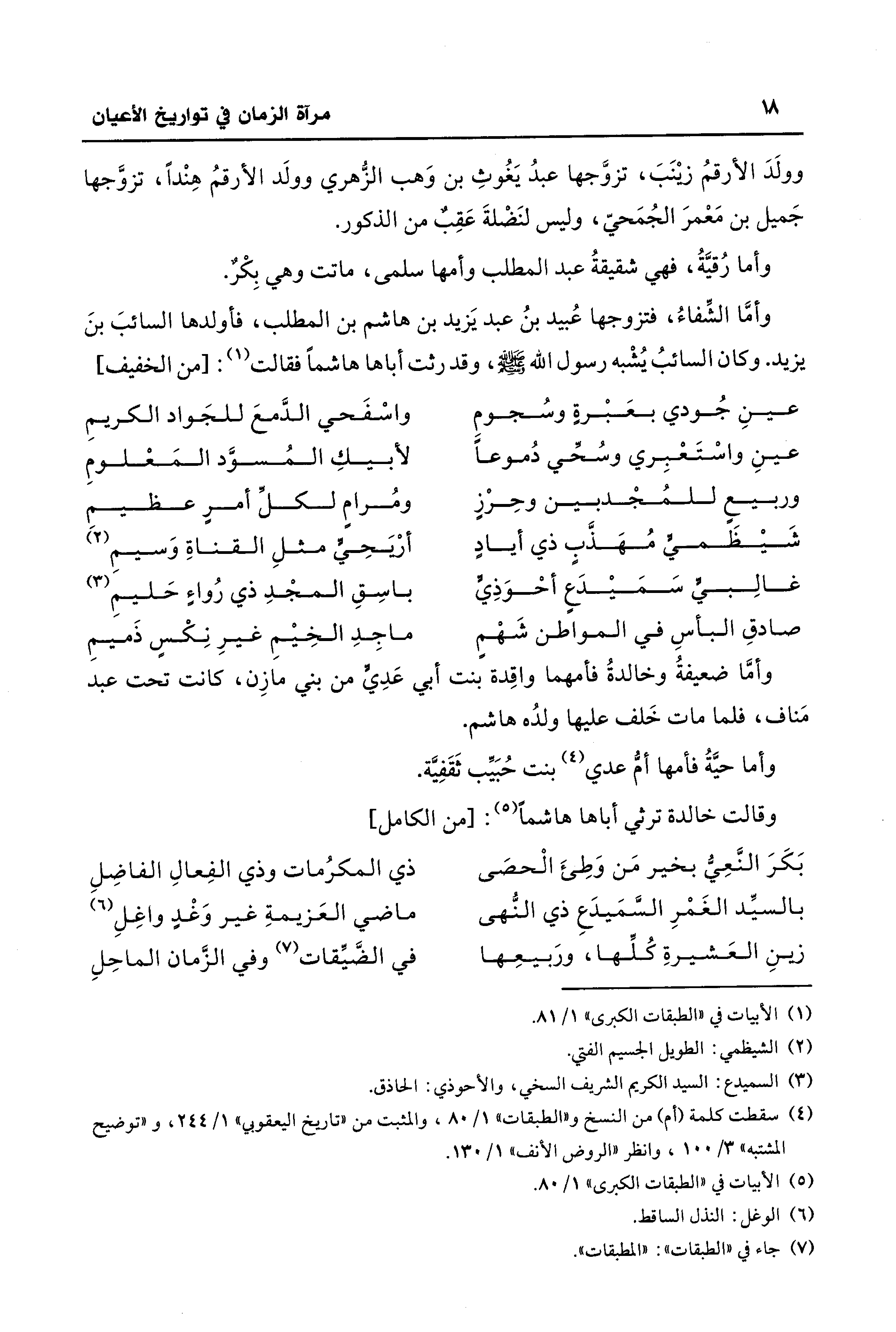 وأمَّا الشِّفاءُ، فتزوجها عُبيد بنُ عبد يَزيد بن هاشم بن المطلب، فأولدها السائبَ بنَ يزيد. وكان السائبُ يُشْبه رسول الله - صلى الله عليه وسلم -، وقد رثت أباها هاشمًا فقالت (¬1): [من الخفيف]