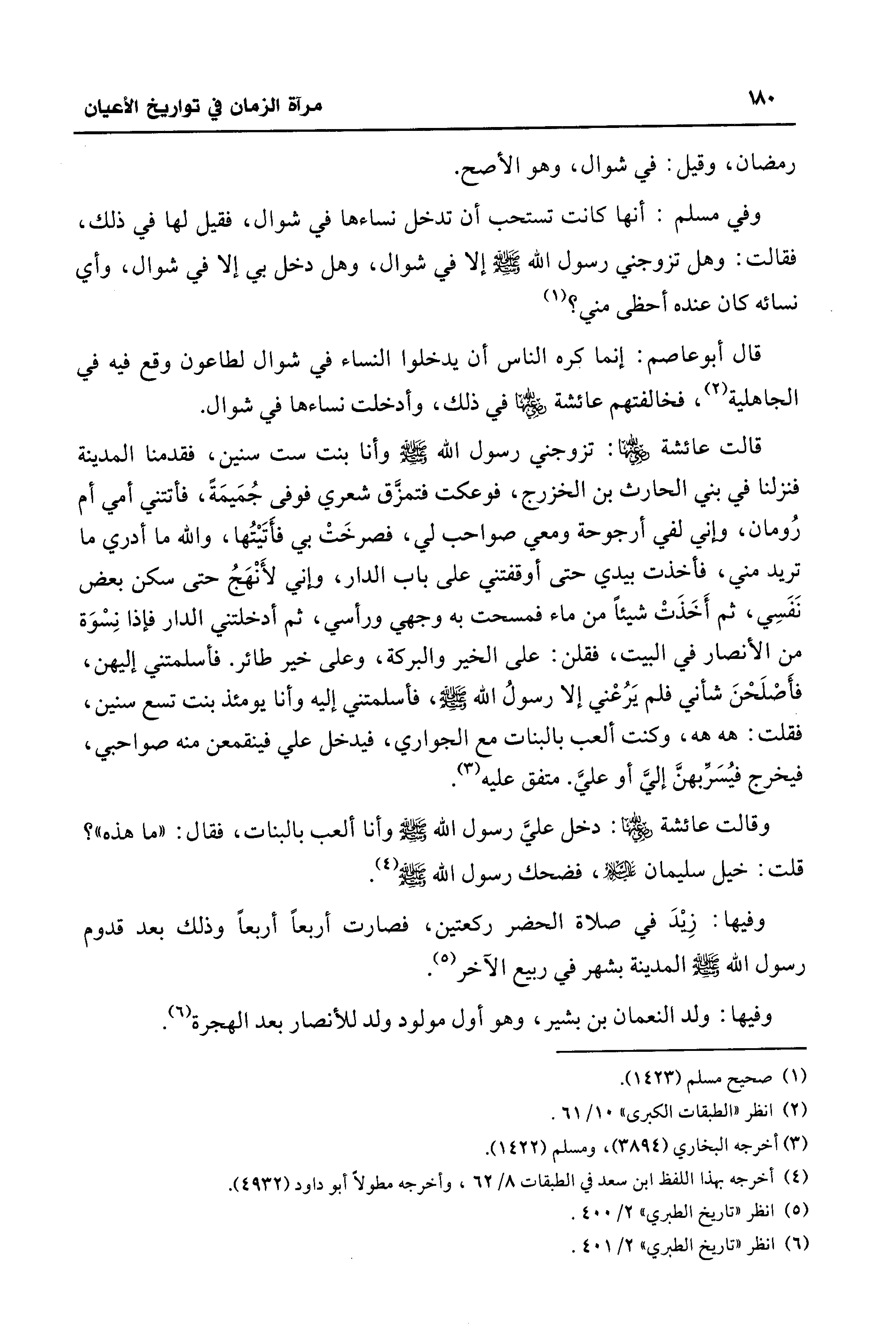 قالت عائشة - رضي الله عنها -: تزوجني رسول الله - صلى الله عليه وسلم - وأنا بنت ست سنين، فقدمنا المدينة فنزلنا في بني الحارث بن الخزرج، فوعكت فتمزَّق شعري فوفى جُمَيمَةً، فأتتني أمي أم رُومان، وإني لفي أرجوحة ومعي صواحب لي، فصرخَتْ بي فأَتَيتُها، والله ما أدري ما تريد مني، فأخذت بيدي حتى أوقفتني على باب الدار، وإني لأَنْهَجُ حتى سكن بعض نَفَسِي، ثم أَخَذَتْ شيئًا من ماء فمسحت به وجهي ورأسي، ثم أدخلتني الدار فإذا نِسْوَة من الأنصار في البيت، فقلن: على الخير والبركة، وعلى خير طائر. فأسلمتني إليهن، فأَصْلَحْنَ شأني فلم يَرُعْني إلا رسولُ الله - صلى الله عليه وسلم -، فأسلمتني إليه وأنا يومئذ بنت تسع سنين، فقلت: هه هه، وكنت ألعب بالبنات مع الجواري، فيدخل علي فينقمعن منه صواحبي، فيخرج فيُسَرِّبهنَّ إليَّ أو عليَّ. متفق عليه (¬3).