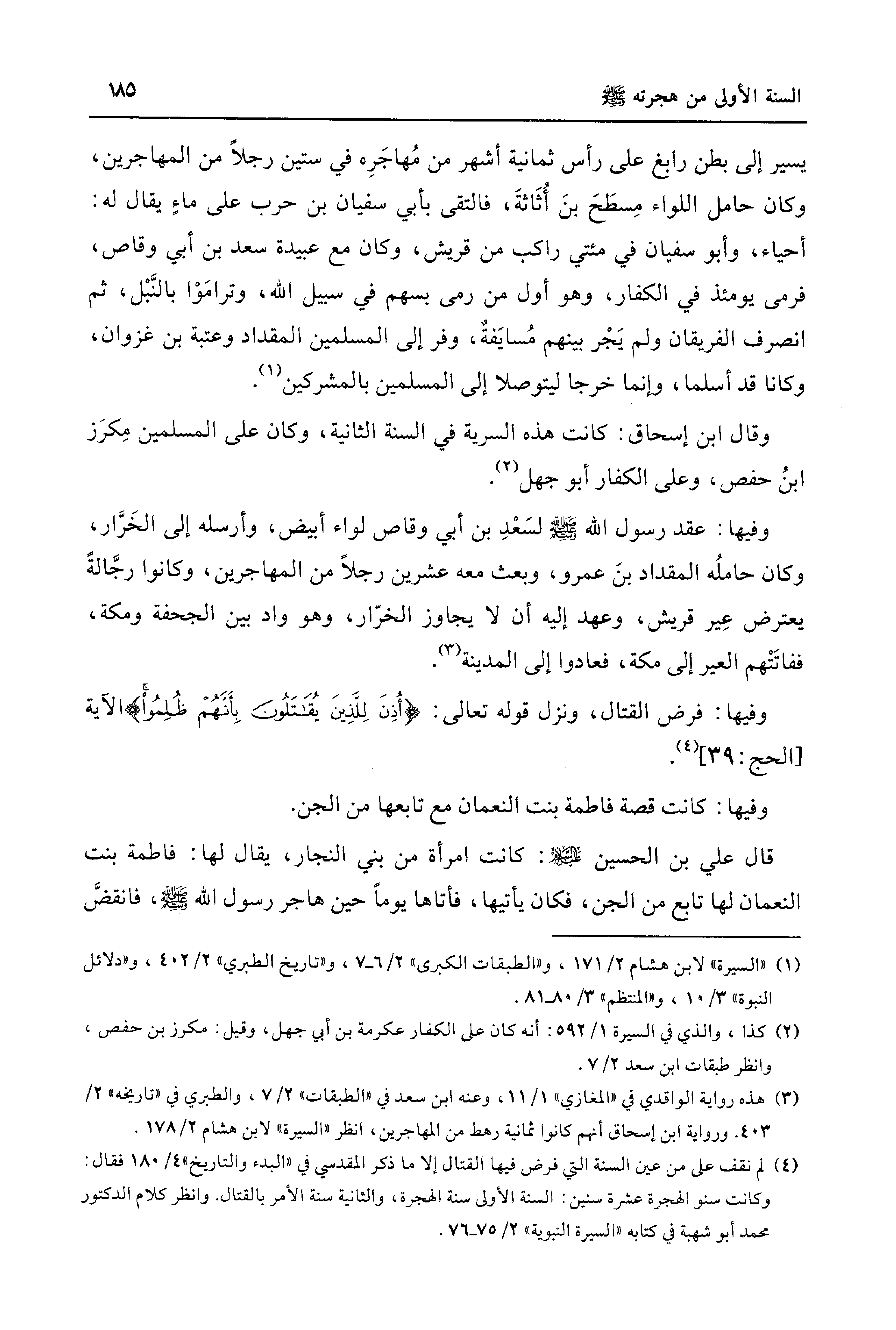 (¬4) لم نقف على من عين السنة التي فرض فيها القتال إلا ما ذكر المقدسي في "البدء والتاريخ" 4/ 180 فقال: وكانت سنة الهجرة عشرة سنين: السنة الأولى سنة الهجرة، والثانية سنة الأمر بالقتال. وانظر كلام الدكتور محمد أبو شهبة في كتابه "السيرة النبوية" 2/ 75 - 76.