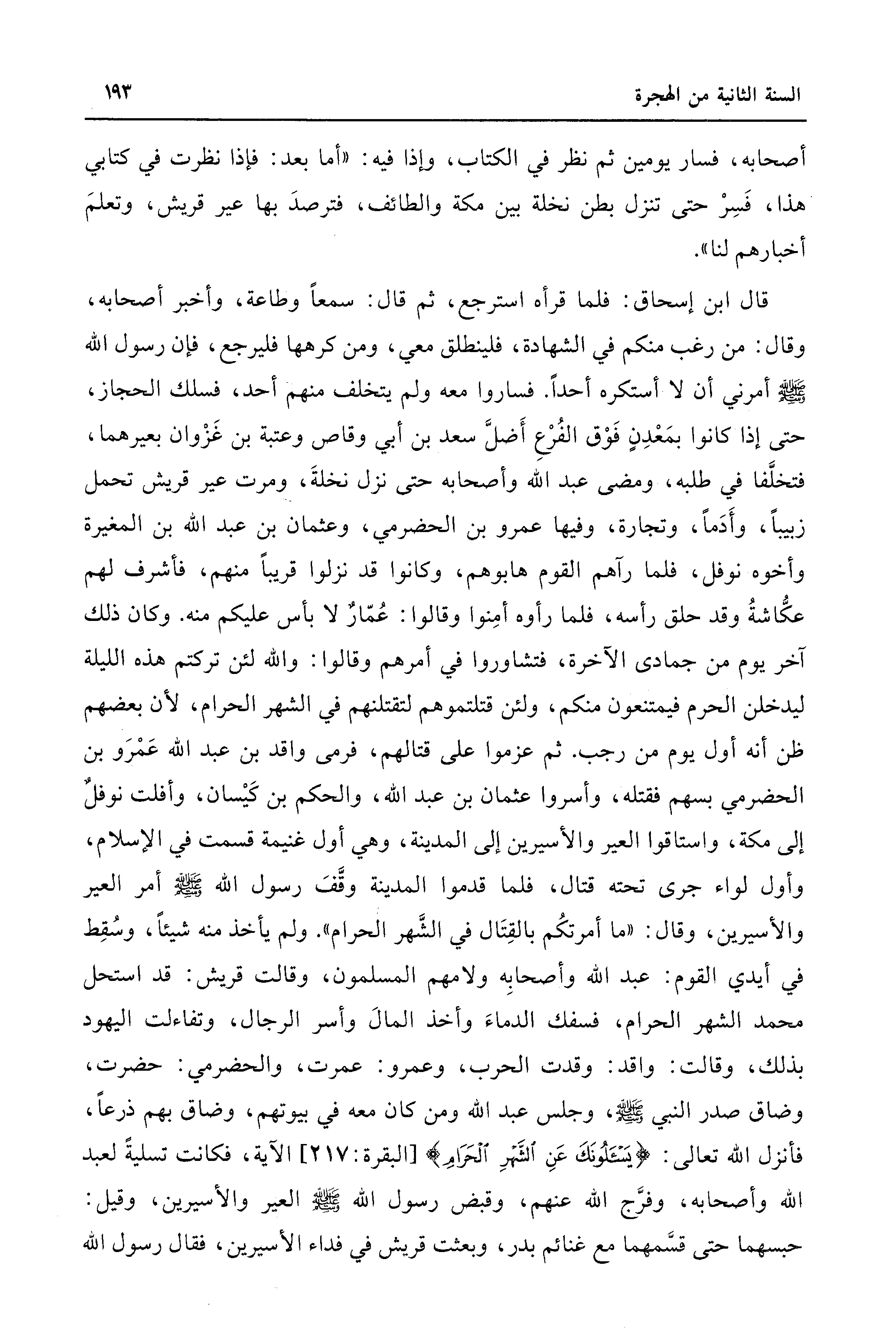 قال ابن إسحاق: فلما قرأه استرجع، ثم قال: سمعًا وطاعة، وأخبر أصحابه، وقال: من رغب منكم في الشهادة، فلينطلق معي، ومن كرهها فليرجع، فإن رسول الله - صلى الله عليه وسلم - أمرني أن لا أستكره أحدًا. فساروا معه ولم يتخلف منهم أحد، فسلك الحجاز، حتى إذا كانوا بمَعْدِنٍ فَوْق الفُرْعِ أَضلَّ سعد بن أبي وقاص وعتبة بن غَزْوان بعيرهما، فتخلَّفا في طلبه، ومضى عبد الله وأصحابه حتى نزل نخلةَ، ومرت عير قريش تحمل زبيبًا، وأَدَمًا، وتجارة، وفيها عمرو بن الحضرمي، وعثمان بن عبد الله بن المغيرة وأخوه نوفل، فلما رآهم القوم هابوهم، وكانوا قد نزلوا قريبًا منهم، فأشرف لهم عكُّاشةُ وقد حلق رأسه، فلما رأوه أمِنوا وقالوا: عُمّارٌ لا بأس عليكم منه. وكان ذلك آخر يوم من جمادى الآخرة، فتشاوروا في أمرهم وقالوا: والله لئن تركتم هذه الليلة ليدخلن الحرم فيمتنعون منكم، ولئن قتلتموهم لتقتلنهم في الشهر الحرام، لأن بعضهم ظن أنه أول يوم من رجب. ثم عزموا على قتالهم، فرمى واقد بن عبد الله عَمْرَو بن الحضرمي بسهم فقتله، وأسروا عثمان بن عبد الله، والحكم بن كَيْسان، وأفلت نوفلٌ إلى مكة، واستاقوا العير والأسيرين إلى المدينة، وهي أول غنيمة قسمت في الإسلام، وأول لواء جرى تحته قتال، فلما قدموا المدينة وقَّفَ رسول الله - صلى الله عليه وسلم - أمر العير والأسيرين، وقال: "ما أمرتكُم بالقِتَال في الشَّهر الحرام". ولم يأخذ منه شيئًا، وسُقِط في أيدي القوم: عبد الله وأصحابِه ولامهم المسلمون، وقالت قريش: قد استحل محمد الشهر الحرام، فسفك الدماءَ وأخذ المال وأسر الرجال، وتفاءلت اليهود بذلك، وقالت: واقد: وقدت الحرب، وعمرو: عمرت، والحضرمي: حضرت، وضاق صدر النبي - صلى الله عليه وسلم -، وجلس عبد الله ومن كان معه في بيوتهم، وضاق بهم ذرعًا، فأنزل الله تعالى: {يَسْأَلُونَكَ عَنِ الشَّهْرِ الْحَرَامِ} [البقرة: 217] الآية، فكانت تسليةً لعبد الله وأصحابه, وفرَّج الله عنهم، وقبض رسول الله - صلى الله عليه وسلم - العير والأسيرين، وقيل: حبسهما حتى قسَّمهما مع غنائم بدر، وبعثت قريش في فداء الأسيرين، فقال رسول الله