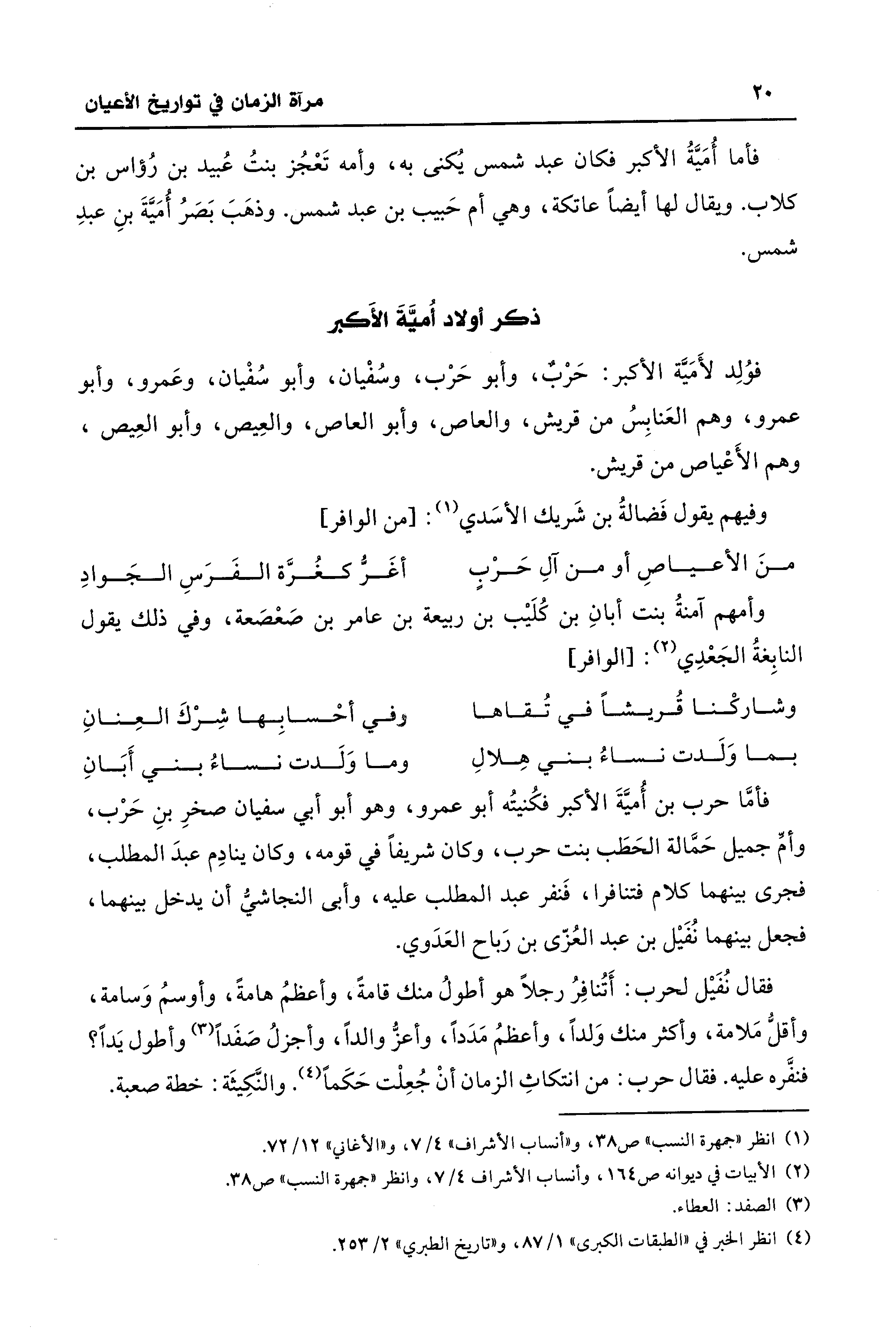 فأمَّا حرب بن أُميَّةَ الأكبر فكُنيتُه أبو عمرو، وهو أبو أبي سفيان صخرِ بنِ حَرْب، وأمِّ جميل حَمَّالة الحَطَب بنت حرب، وكان شريفًا في قومه، وكان ينادِم عبدَ المطلب، فجرى بينهما كلام فتنافرا، كانفر عبد المطلب عليه، وأبي النجاشيُّ أن يدخل بينهما، فجعل بينهما نُفَيل بن عبد العُزّى بن رَباح العَدَوي.