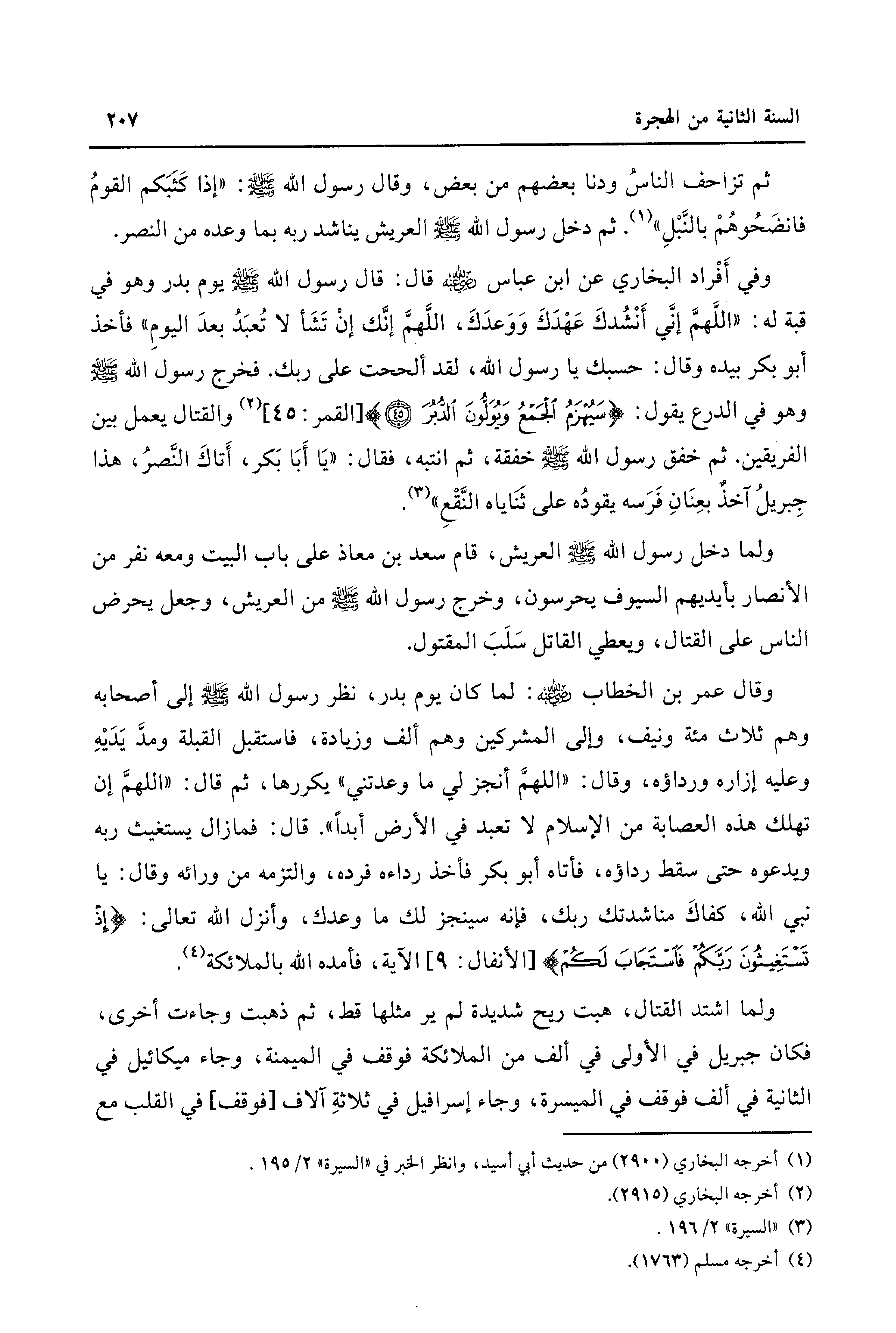 وفي أَفْراد البخاري عن ابن عباس - رضي الله عنه - قال: قال رسول الله - صلى الله عليه وسلم - يوم بدر وهو في قبة له: "اللَّهمَّ إنِّي أَنْشُدكَ عَهْدَكَ وَوَعدَكَ، اللَّهمَّ إنَّك إنْ تَشَأ لا تُعبَدُ بعدَ اليومِ" فأخذ أبو بكر بيده وقال: حسبك يا رسول الله، لقد ألححت على ربك. فخرج رسول الله - صلى الله عليه وسلم - وهو في الدرع يقول: {سَيُهْزَمُ الْجَمْعُ وَيُوَلُّونَ الدُّبُرَ} [القمر: 45] (¬2) والقتال يعمل بين الفريقين. ثم خفق رسول الله - صلى الله عليه وسلم - خفقة، ثم انتبه، فقال: "يَا أَبَا بَكر، أَتاكَ النَّصرُ، هذا جِبريلُ آخذٌ بعِنَانِ فَرَسه يقودُه على ثنَاياه النَّقْعِ" (¬3).