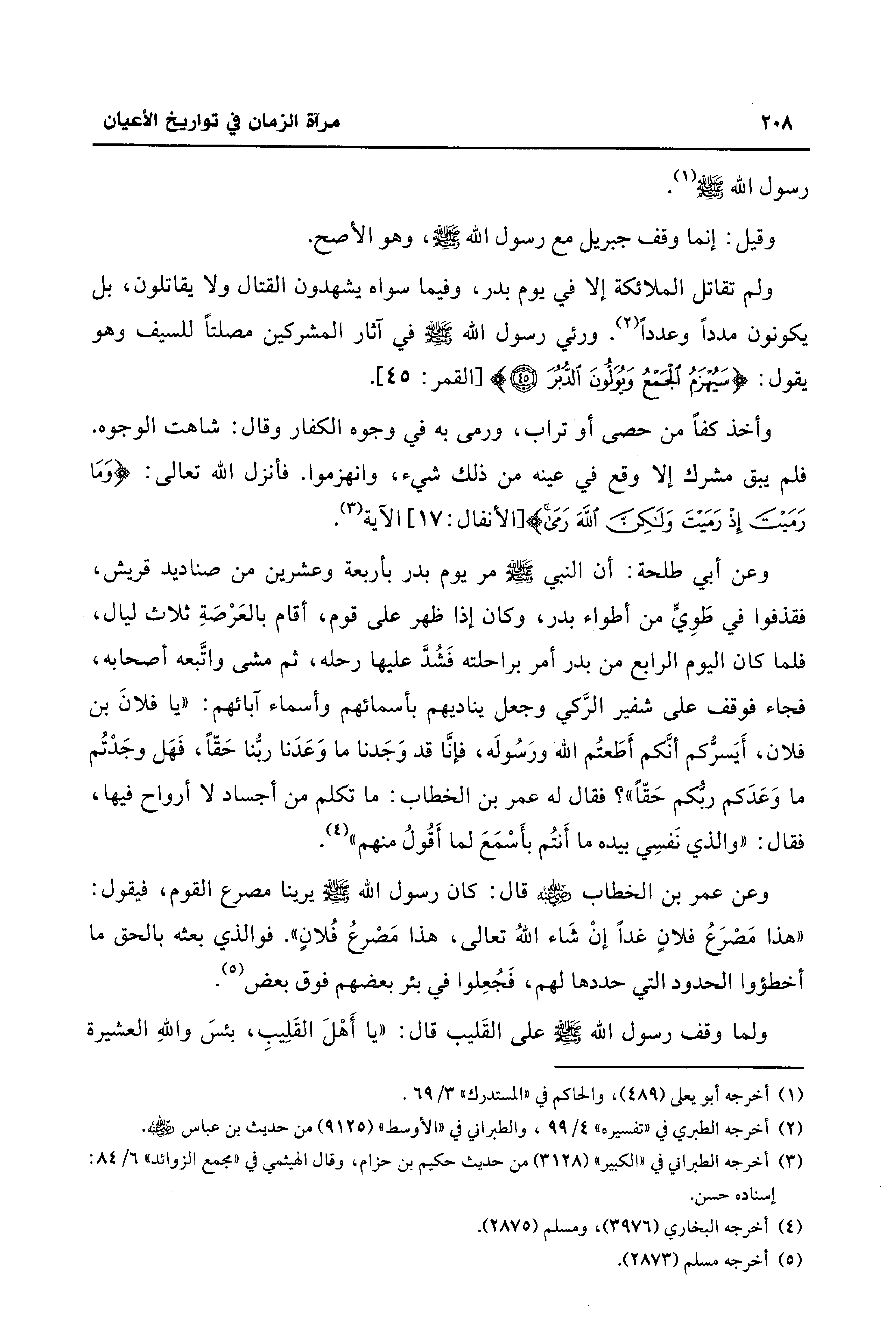 ولم تقاتل الملائكة إلا في يوم بدر، وفيما سواه يشهدون القتال ولا يقاتلون، بل يكونون مددًا وعددًا (¬2). ورئي رسول الله - صلى الله عليه وسلم - في آثار المشركين مصلتًا للسيف وهو يقول: {سَيُهْزَمُ الْجَمْعُ وَيُوَلُّونَ الدُّبُرَ} [القمر: 45].