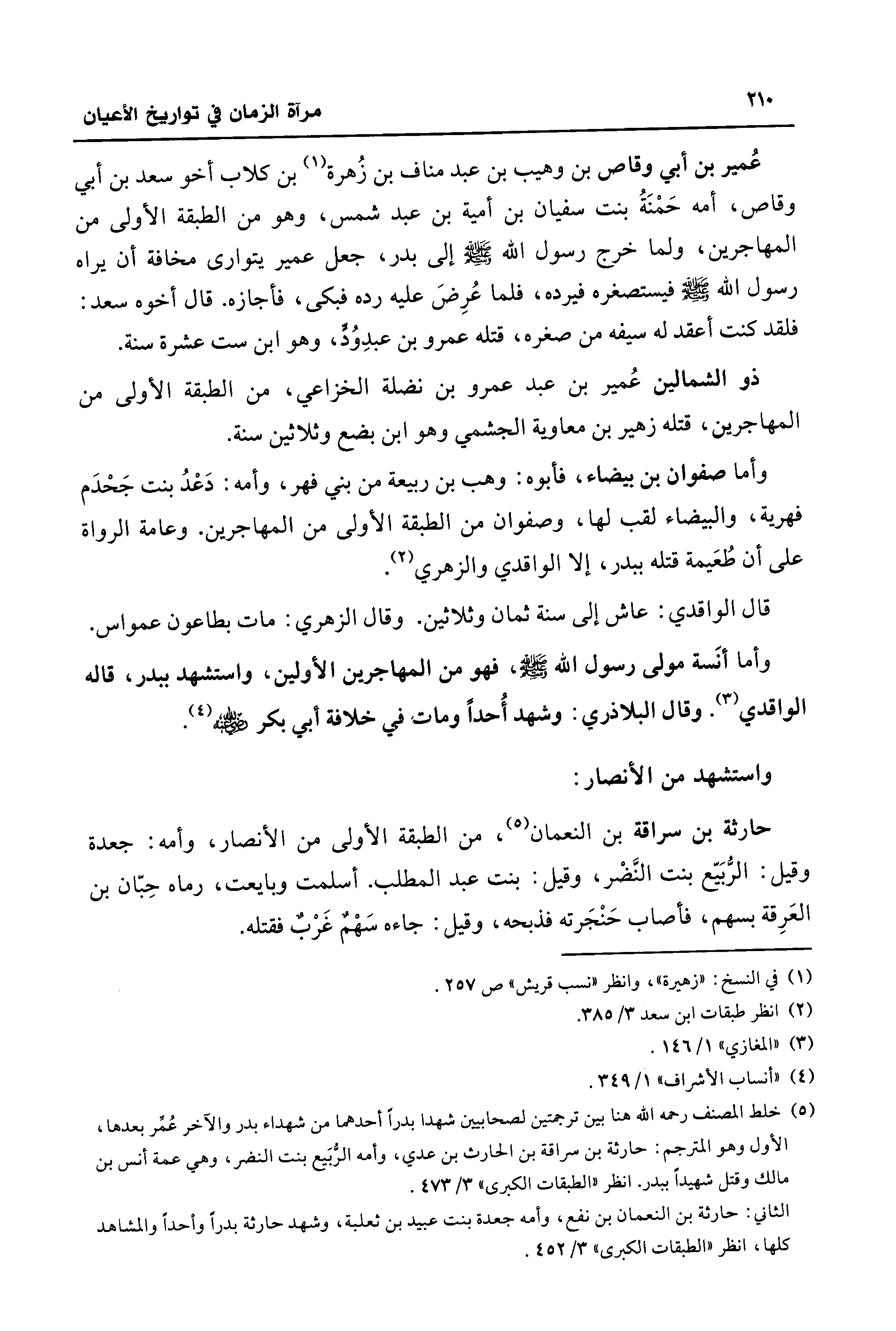 (¬5) خلط المصنف رحمه الله هنا بين ترجمتين لصحابيين شهدا بدرًا أحدهما من شهداء بدر والآخر عُمِّر بعدها، الأول وهو المترجم: حارثة بن سراقة بن الحارث بن عدي، وأمه الرُّبَيع بنت النضر، وهي عمة أنس بن مالك وقتل شهيدًا ببدر. انظر "الطبقات الكبرى" 3/ 473.
