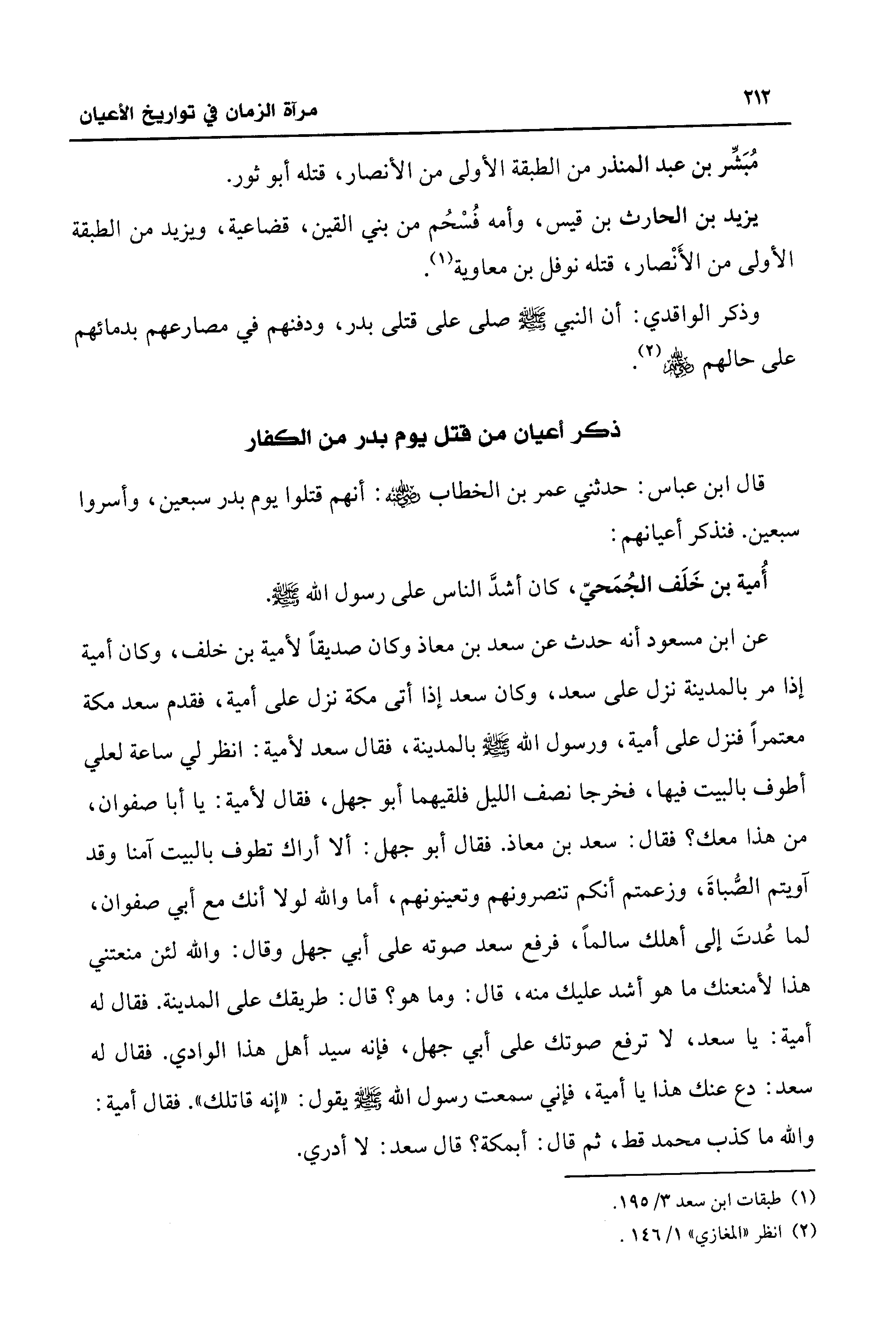 عن ابن مسعود أنه حدث عن سعد بن معاذ وكان صديقًا لأمية بن خلف، وكان أمية إذا مر بالمدينة نزل على سعد، وكان سعد إذا أتى مكة نزل على أمية، فقدم سعد مكة معتمرًا فنزل على أمية، ورسول الله - صلى الله عليه وسلم - بالمدينة، فقال سعد لأمية: انظر لي ساعة لعلي أطوف بالبيت فيها، فخرجا نصف الليل فلقيهما أبو جهل، فقال لأمية: يا أبا صفوان، من هذا معك؟ فقال: سعد بن معاذ. فقال أبو جهل: ألا أراك تطوف بالبيت آمنا وقد آويتم الصُّباةَ، وزعمتم أنكم تنصرونهم وتعينونهم، أما والله لولا أنك مع أبي صفوان، لما عُدتَ إلى أهلك سالمًا، فرفع سعد صوته على أبي جهل وقال: والله لئن منعتني هذا لأمنعنك ما هو أشد عليك منه، قال: وما هو؟ قال: طريقك على المدينة. فقال له أمية: يا سعد، لا ترفع صوتك على أبي جهل، فإنه سيد أهل هذا الوادي. فقال له سعد: دع عنك هذا يا أمية، فإني سمعت رسول الله - صلى الله عليه وسلم - يقول: "إنه قاتلك". فقال أمية: والله ما كذب محمد قط، ثم قال: أبمكة؟ قال سعد: لا أدري.