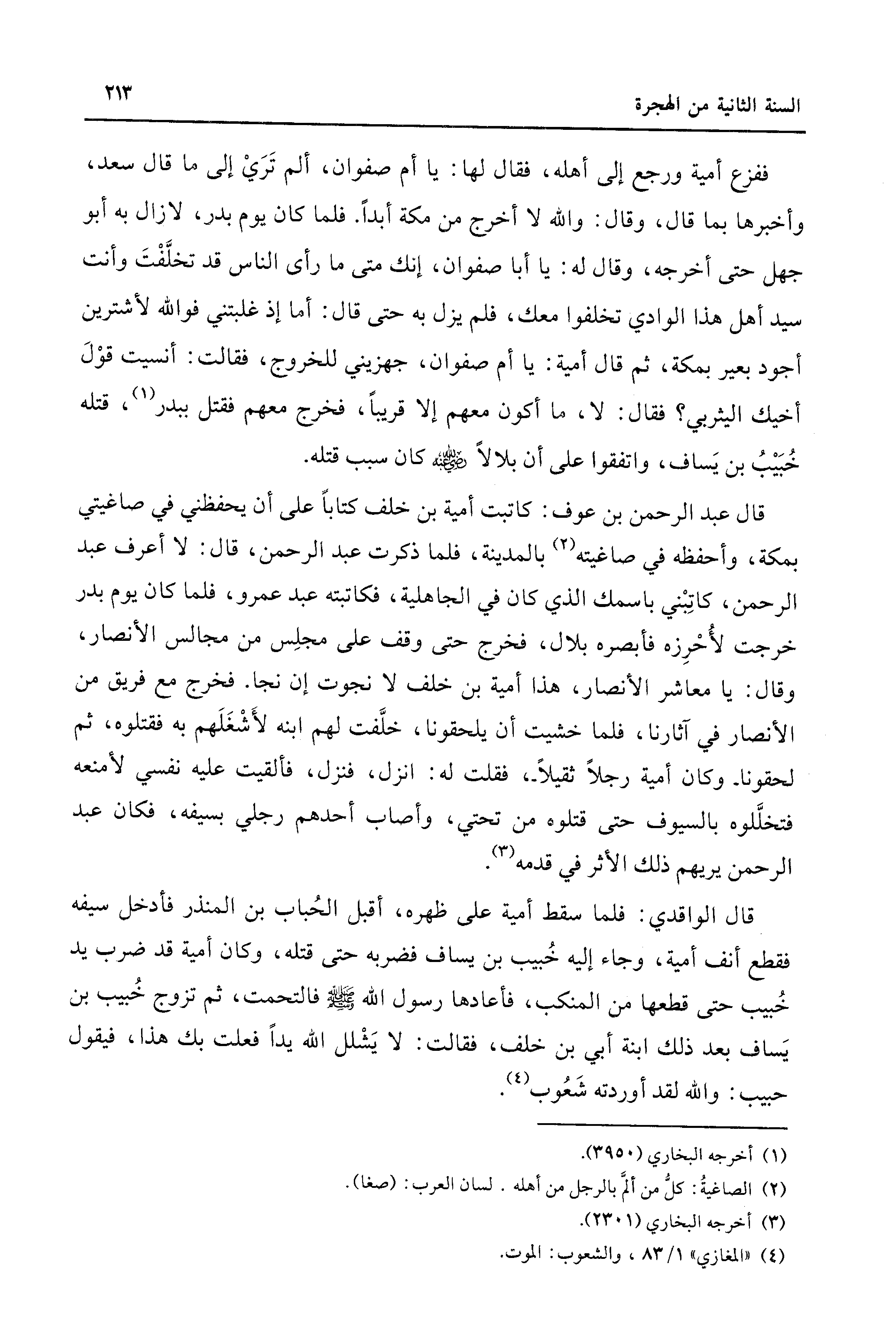 قال عبد الرحمن بن عوف: كاتبت أمية بن خلف كتابًا على أن يحفظني في صاغيتي بمكة، وأحفظه في صاغيته (¬2) بالمدينة، فلما ذكرت عبد الرحمن، قال: لا أعرف عبد الرحمن، كاتِبْني باسمك الذي كان في الجاهلية، فكاتبته عبد عمرو، فلما كان يوم بدر خرجت لأُحْرِزه فأبصره بلال، فخرج حتى وقف على مجلِس من مجالس الأنصار، وقال: يا معاشر الأنصار، هذا أمية بن خلف لا نجوت إن نجا. فخرج مع فريق من الأنصار في آثارنا، فلما خشيت أن يلحقونا، خلَّفت لهم ابنه لأَشْغَلَهم به فقتلوه، ثم لحقونا -وكان أمية رجلًا ثقيلًا-، فقلت له: انزل، فنزل، فألقيت عليه نفسي لأمنعه فتخلَّلوه بالسيوف حتى قتلوه من تحتي، وأصاب أحدهم رجلي بسيفه، فكان عبد الرحمن يريهم ذلك الأثر في قدمه (¬3).
