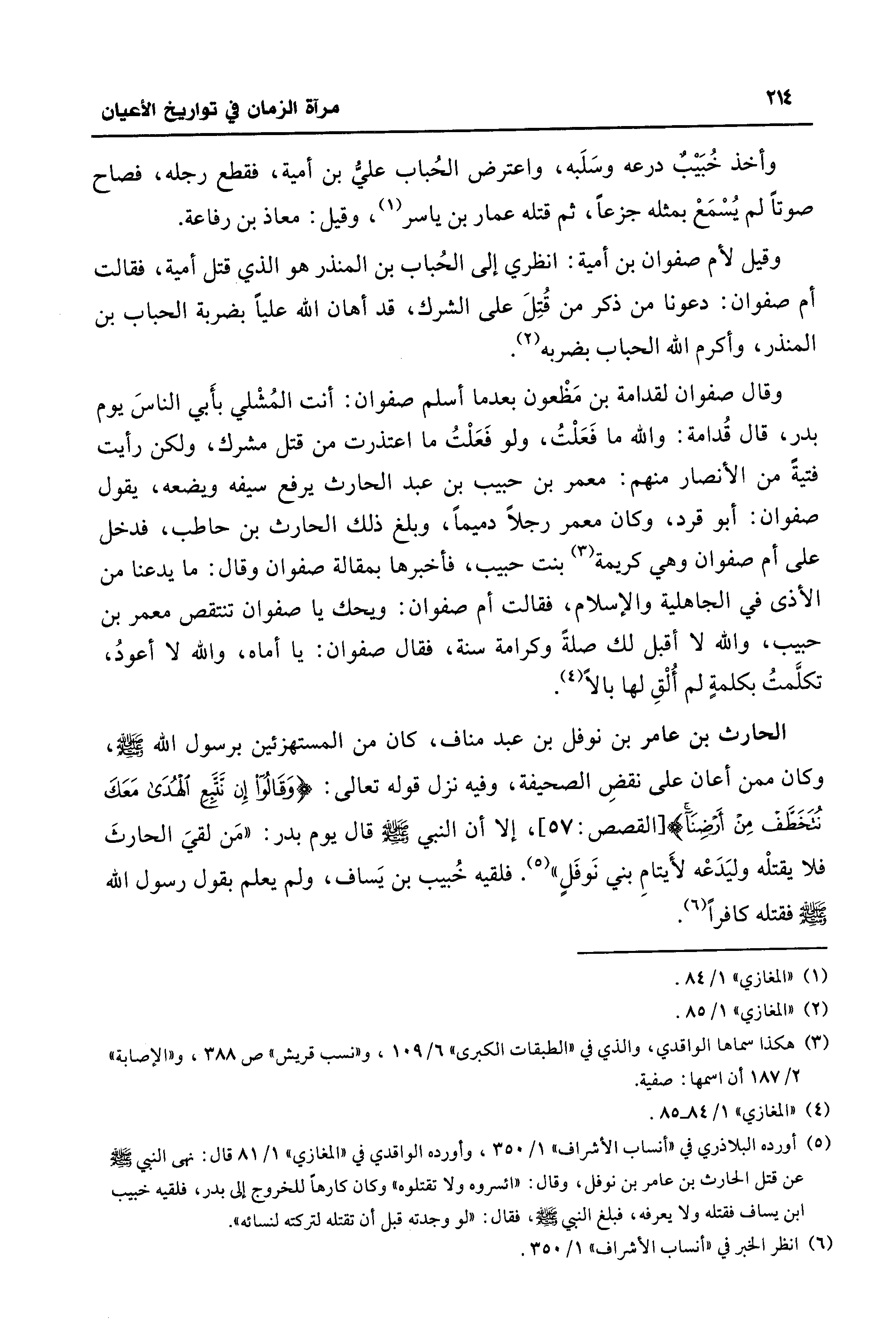 (¬5) أورده البلاذري في "أنساب الأشراف" 1/ 350، وأورده الواقدي في "المغازي" 1/ 81 قال: نهى النبي - صلى الله عليه وسلم - عن قتل الحارث بن عامر بن نوفل، وقال: "ائسروه ولا تقتلوه" وكان كارهًا للخروج إلى بدر، فلقيه خبيب بن يساف فقتله ولا يعرفه، فبلغ النبي - صلى الله عليه وسلم -، فقال: "لو وجدته قبل أن تقتله لتركته لنسائه".