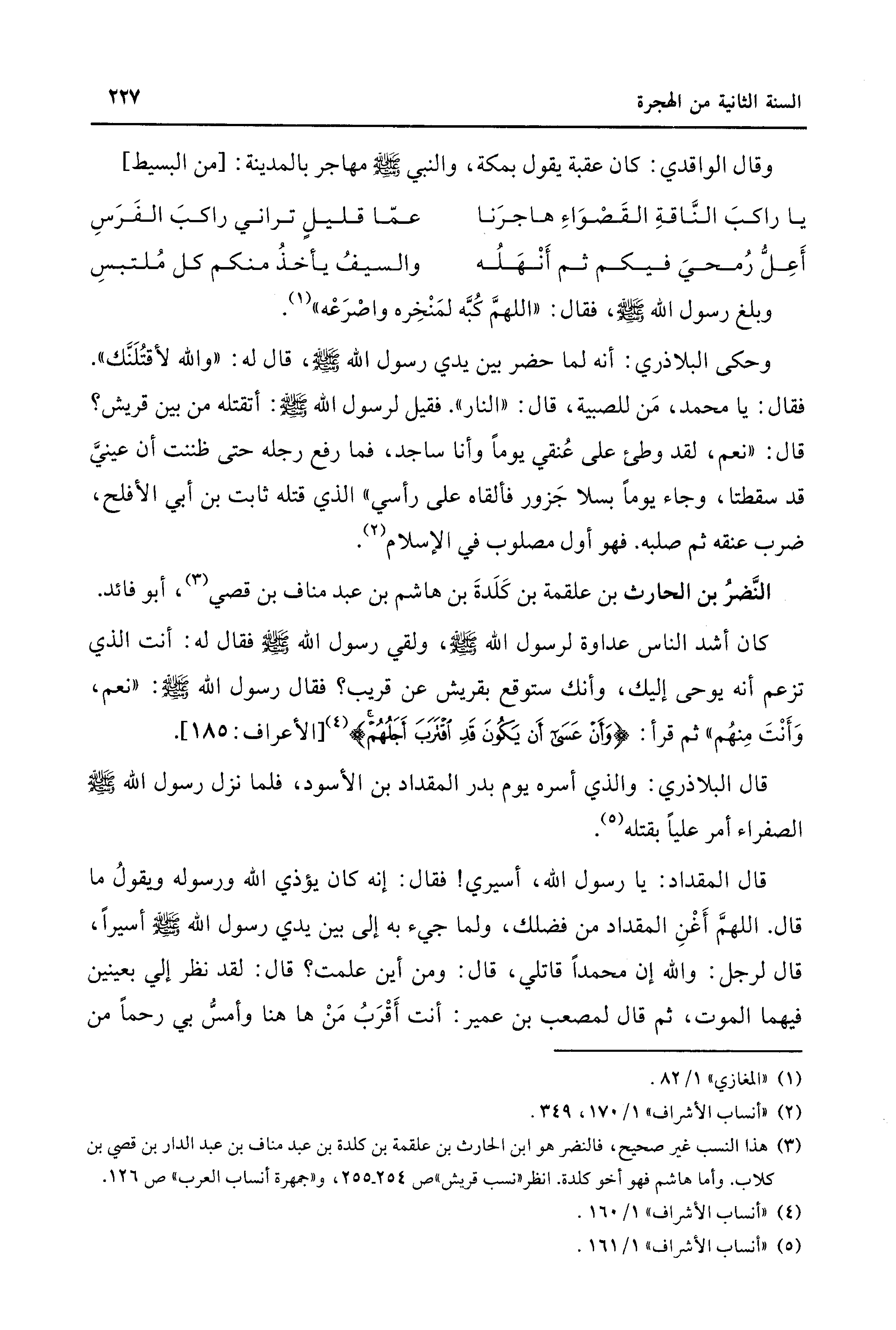 (¬3) هذا النسب غير صحيح، فالنضر هو ابن الحارث بن علقمة بن كلدة بن عبد مناف بن عبد الدار بن قصي بن كلاب. وأما هاشم فهو أخو كلدة. انظر "نسب قريش" ص 254 - 255، و"جمهرة أنساب العرب" ص 126.