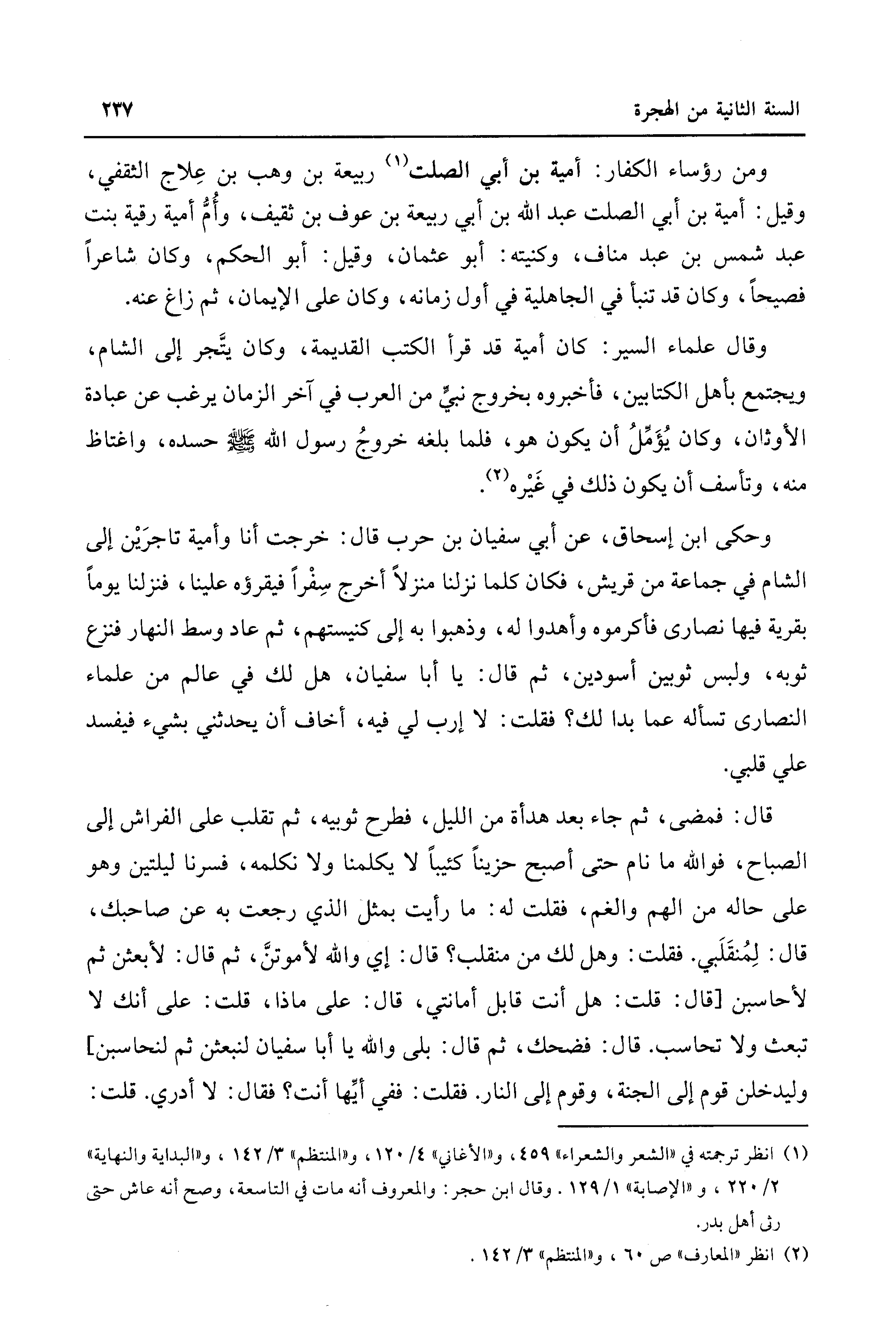 وحكى ابن إسحاق، عن أبي سفيان بن حرب قال: خرجت أنا وأمية تاجرَين إلى الشام في جماعة من قريش، فكان كلما نزلنا منزلًا أخرج سِفْرًا فيقرؤه علينا، فنزلنا يومًا بقرية فيها نصارى فأكرموه وأهدوا له، وذهبوا به إلى كنيستهم، ثم عاد وسط النهار فنزع ثوبه، ولبس ثوبين أسودين، ثم قال: يا أبا سفيان، هل لك في عالم من علماء النصارى تسأله عما بدا لك؟ فقلت: لا إرب لي فيه، أخاف أن يحدثني بشيء فيفسد علي قلبي.