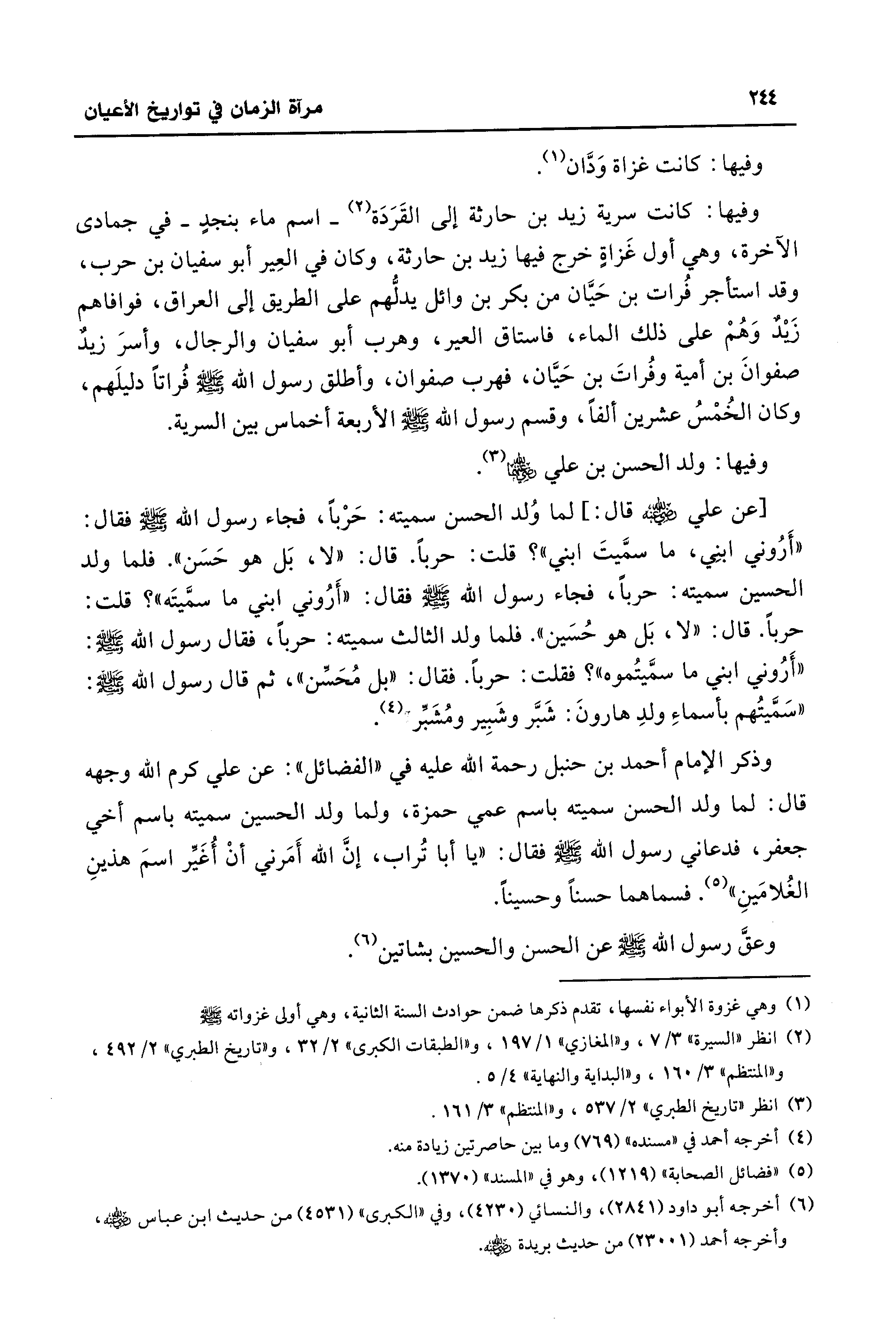 [عن علي - رضي الله عنه - قال: ] لما وُلد الحسن سميته: حَرْبًا، فجاء رسول الله - صلى الله عليه وسلم - فقال: "أَرُوني ابنِي، ما سمَّيتَ ابني"؟ قلت: حربًا. قال: "لا، بَل هو حَسَن". فلما ولد الحسين سميته: حربًا، فجاء رسول الله - صلى الله عليه وسلم - فقال: "أَرُوني ابني ما سمَّيتَه"؟ قلت: حربًا. قال: "لا، بَل هو حُسَين". فلما ولد الثالث سميته: حربًا، فقال رسول الله - صلى الله عليه وسلم -: "أَرُوني ابني ما سمَّيتُموه"؟ فقلت: حربًا. فقال: "بل مُحَسِّن"، ثم قال رسول الله - صلى الله عليه وسلم -: "سَمَّيتُهم بأسماءِ ولدِ هارونَ: شَبَّر وشَبِير ومُشَبِّر (¬4).