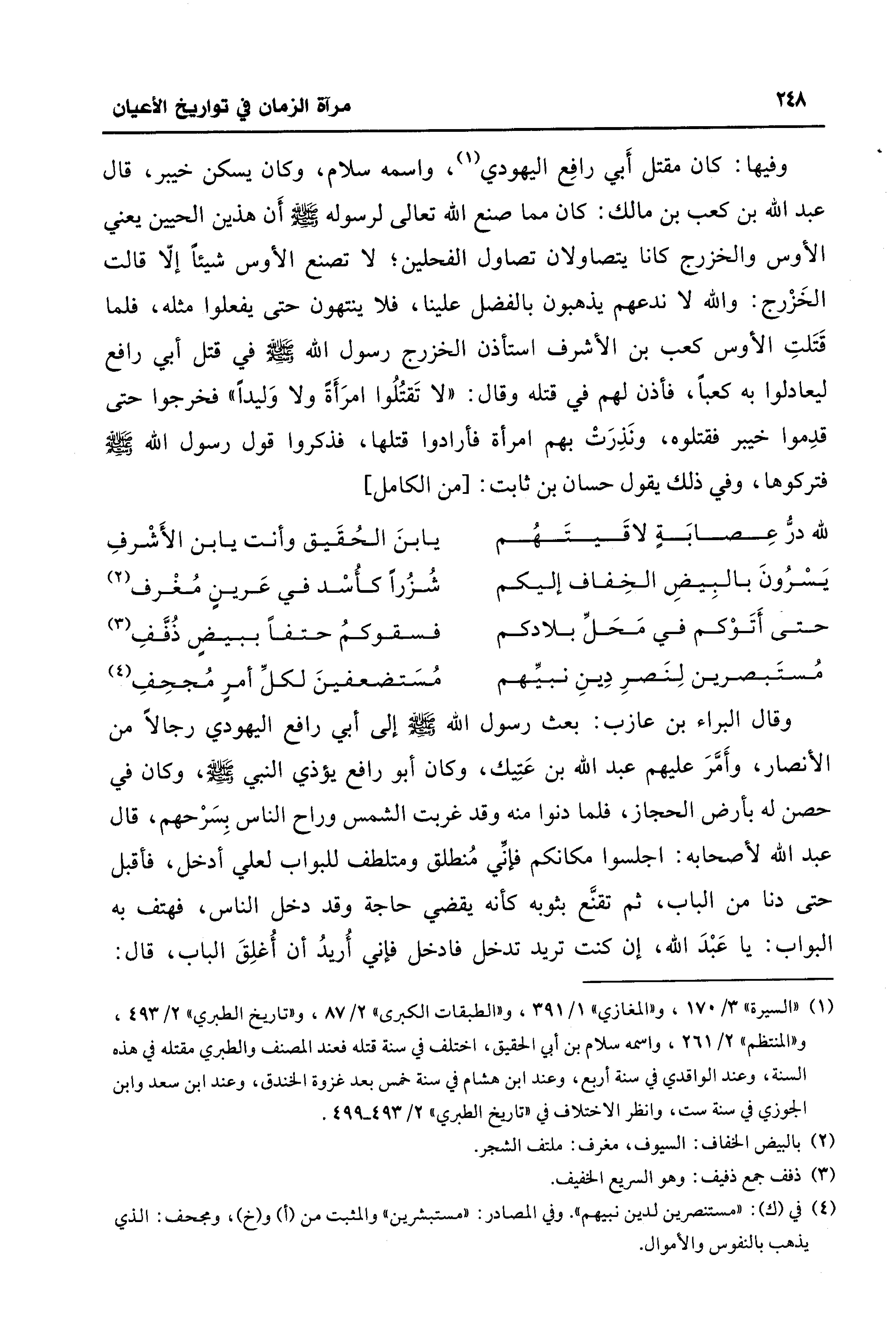(¬1) "السيرة" 3/ 170، و"المغازي" 1/ 391، و"الطبقات الكبرى" 2/ 87، و"تاريخ الطبري" 2/ 493، و"المنتظم" 2/ 261، واسمه سلام بن أبي الحقيق، اختلف في سنة قتله فعند المصنف والطبري مقتله في هذه السنة، وعند الواقدي في سنة أربع، وعند ابن هشام في سنة خمس بعد غزوة الخندق، وعند ابن سعد وابن الجوزي في سنة ست، وانظر الاختلاف في "تاريخ الطبري" 2/ 493 - 499.